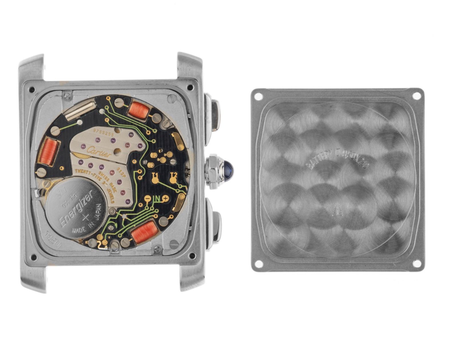 Caixa em aço inoxidável polido e acetinado, dimensões da caixa sem coroa (L x P x A) 36 x 28 x 6,7mm. Pulseira em aço inoxidável polido e acetinado, fecho duplo oculto em aço inoxidável. Mostrador creme com números romanos e árabes pretos e ponteiros azulados. Movimento a quartzo, cronógrafo, calibre Cartier 212P com 25 pedras preciosas. Exibição de horas e minutos através de ponteiros centrais, exibição de data através de ponteiro às 12 horas. Vidro de safira resistente a riscos. Coroa com cabochão de espinela azul. Fundo em aço inoxidável com 4 parafusos e gravado. Peso do relógio incluindo a pulseira 90g, comprimento da pulseira incluindo a caixa 155mm. Número de referência: 2303, número da caixa: BB22XXX, ano de fabricação: 2004, ID: P243651980126RE-6200, número do artigo: 10000084593. Com controle de marcha e completa restauração externa de janeiro de 2026. Caixa original da Cartier com embalagem externa, além de descrição e extrato do Watch Register de janeiro de 2026, Certificado do Watch Register / sem registro (Banco de dados internacional para relógios perdidos ou roubados). Super oferta. Em muito bom estado. Prazo de entrega imediato.