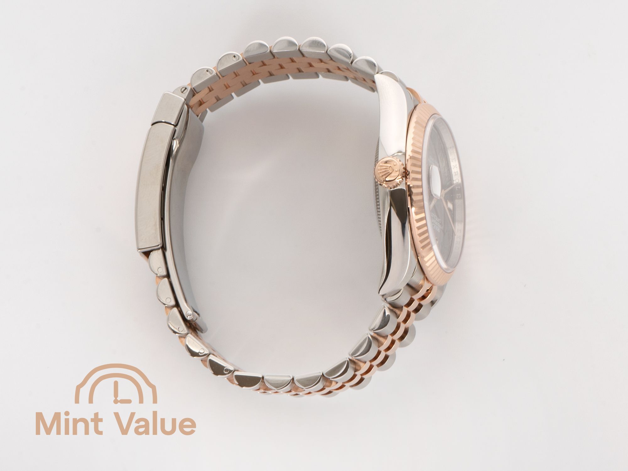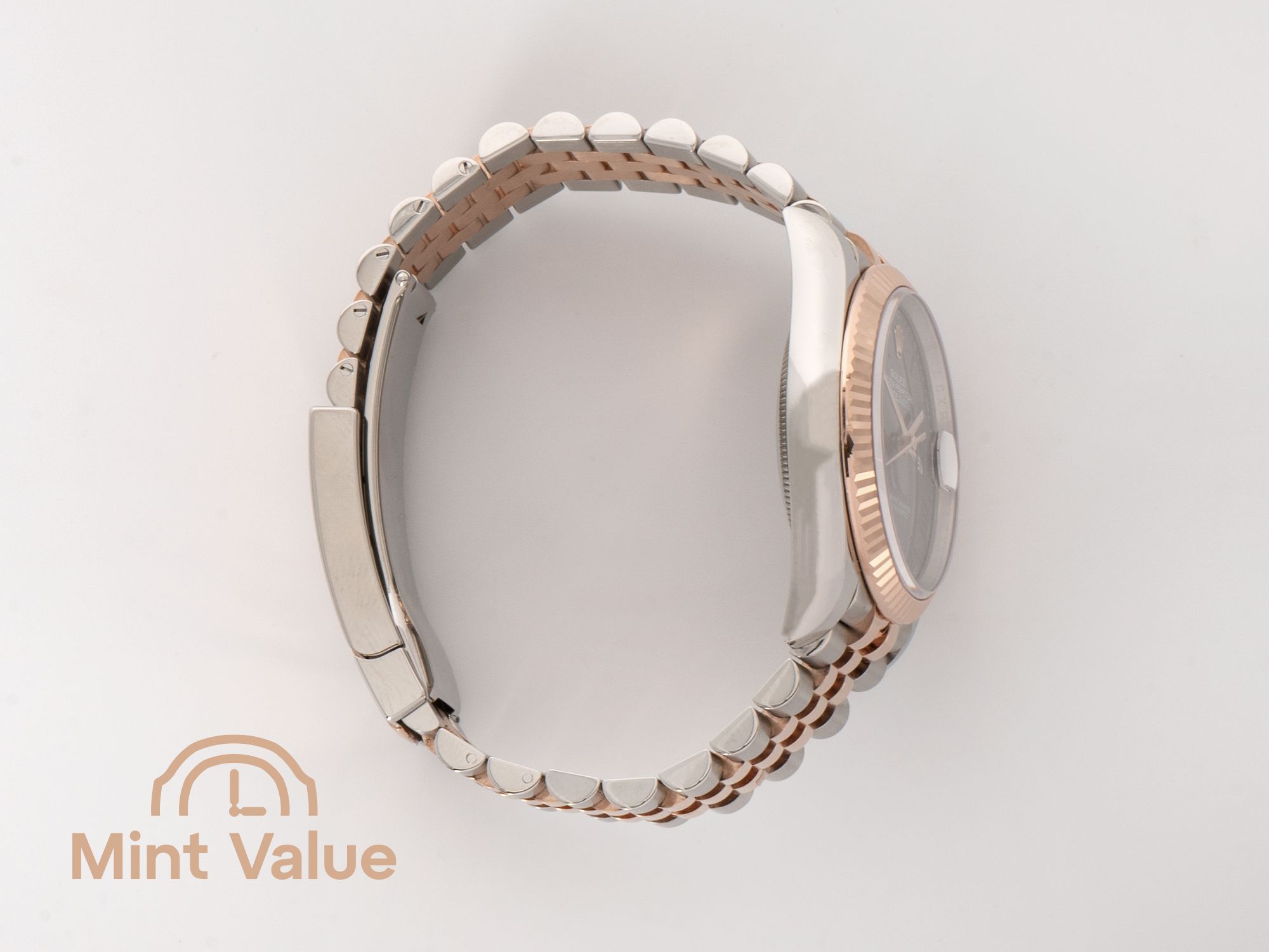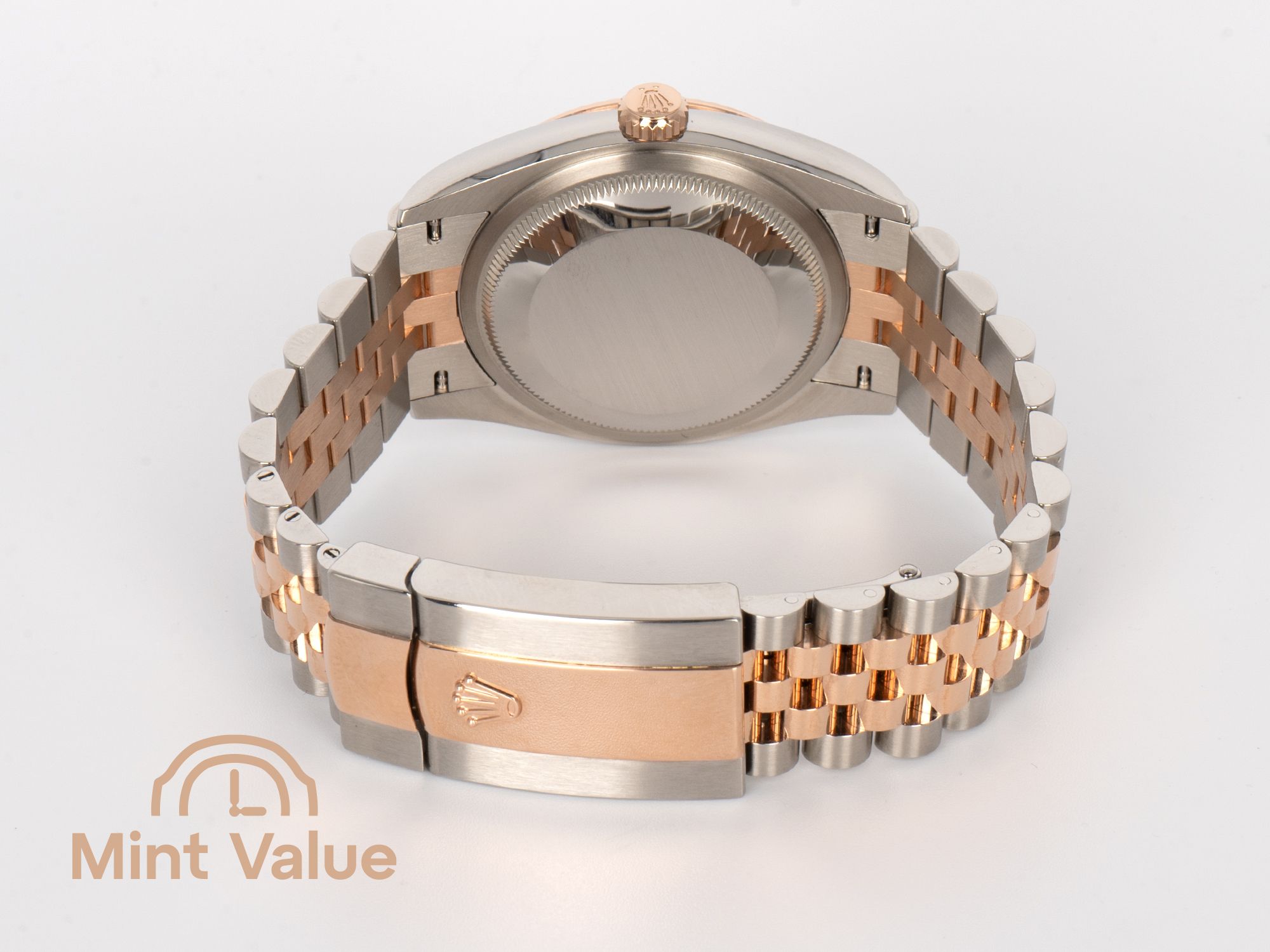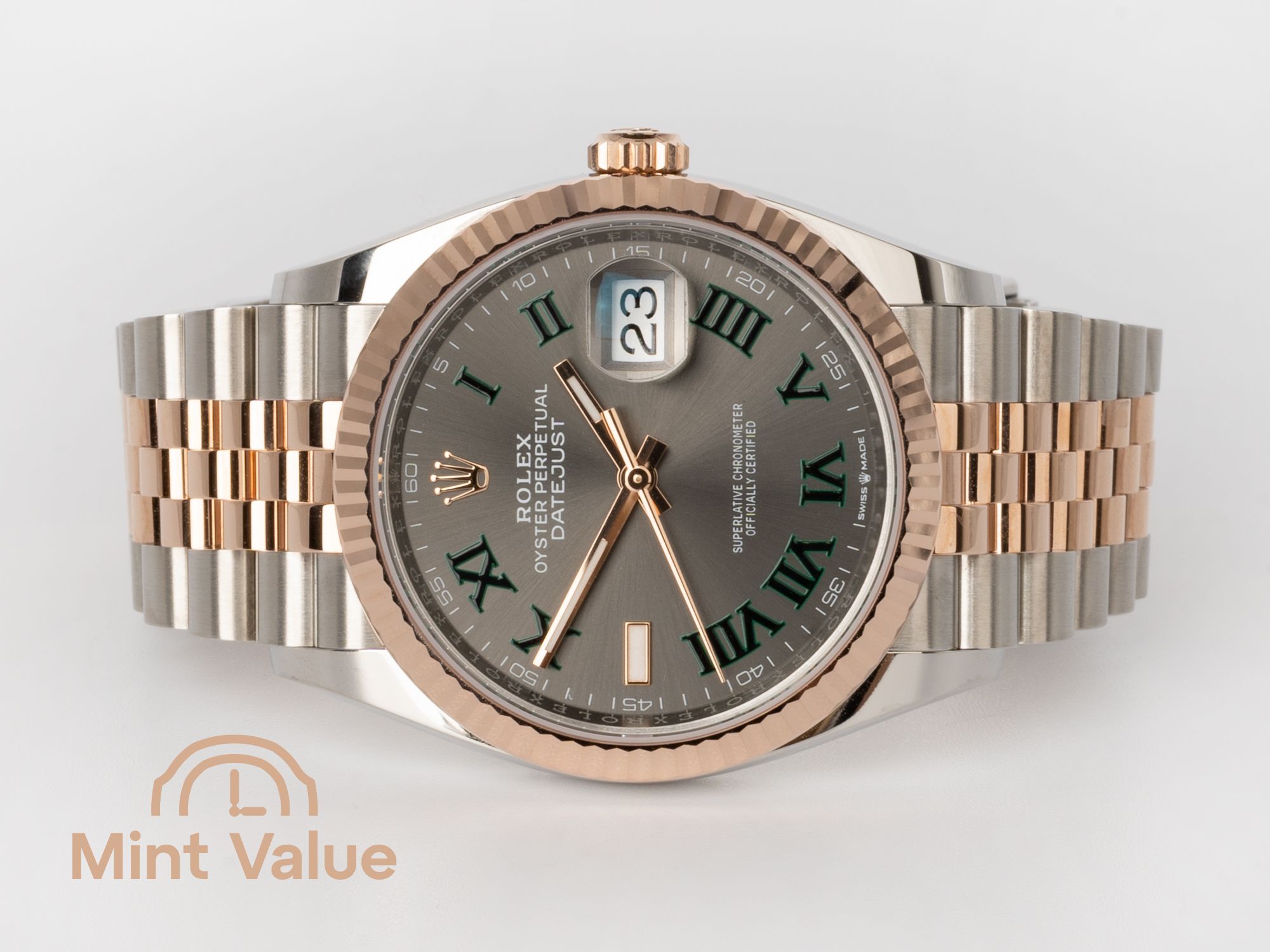 widely known as the “Wimbledon”, presents one of the most distinctive and recognizable dial designs within the Datejust collection. Combining classic proportions with a bold yet balanced aesthetic, this configuration pairs Everose Rolesor construction with the iconic slate grey dial accented by green Roman numerals — a design that has become emblematic in modern Rolex history.