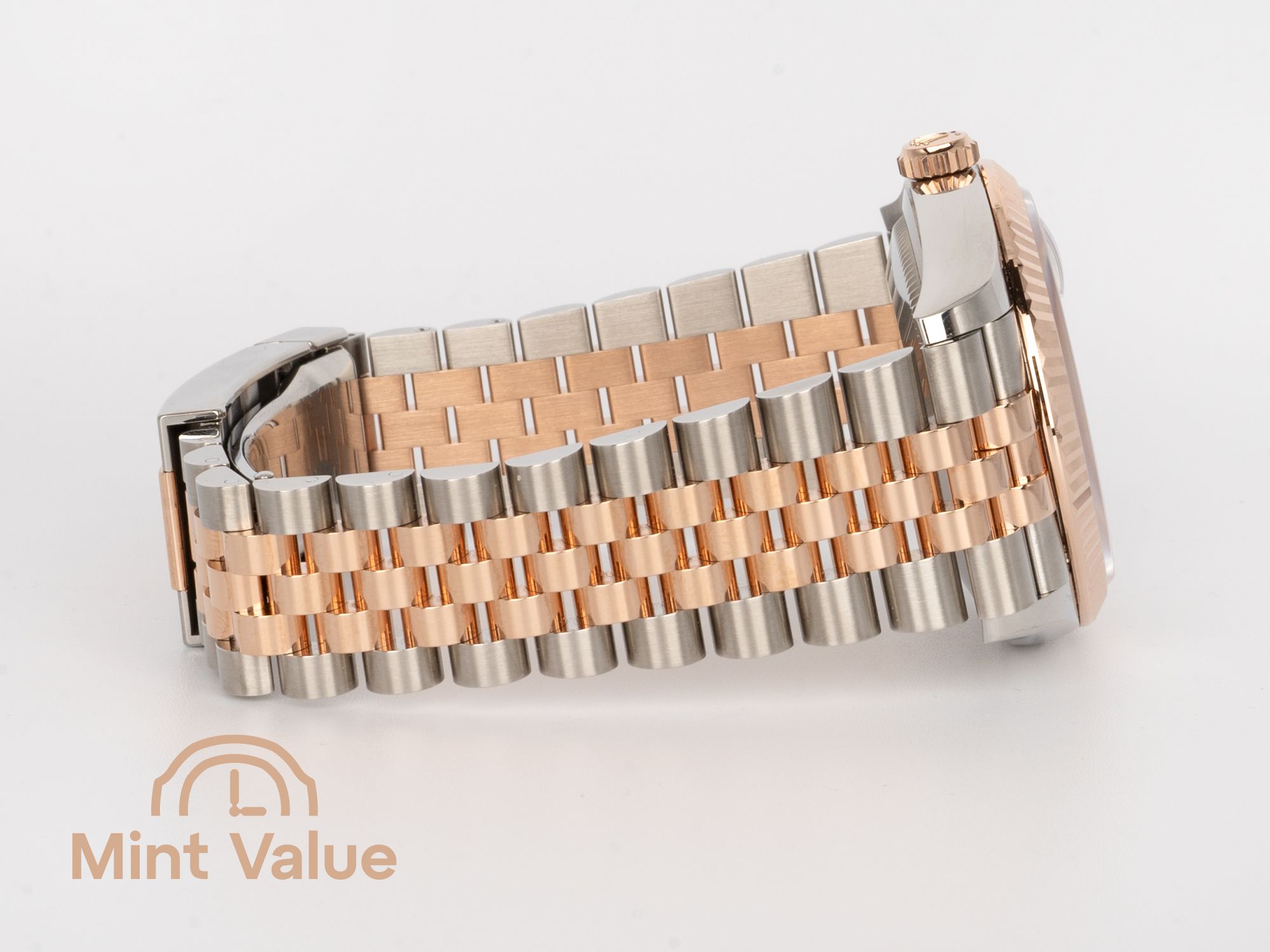 The fluted bezel reflects light with precision and remains one of Rolex’s most enduring design signatures. Crafted from solid Everose gold, it reinforces the watch’s classic identity.