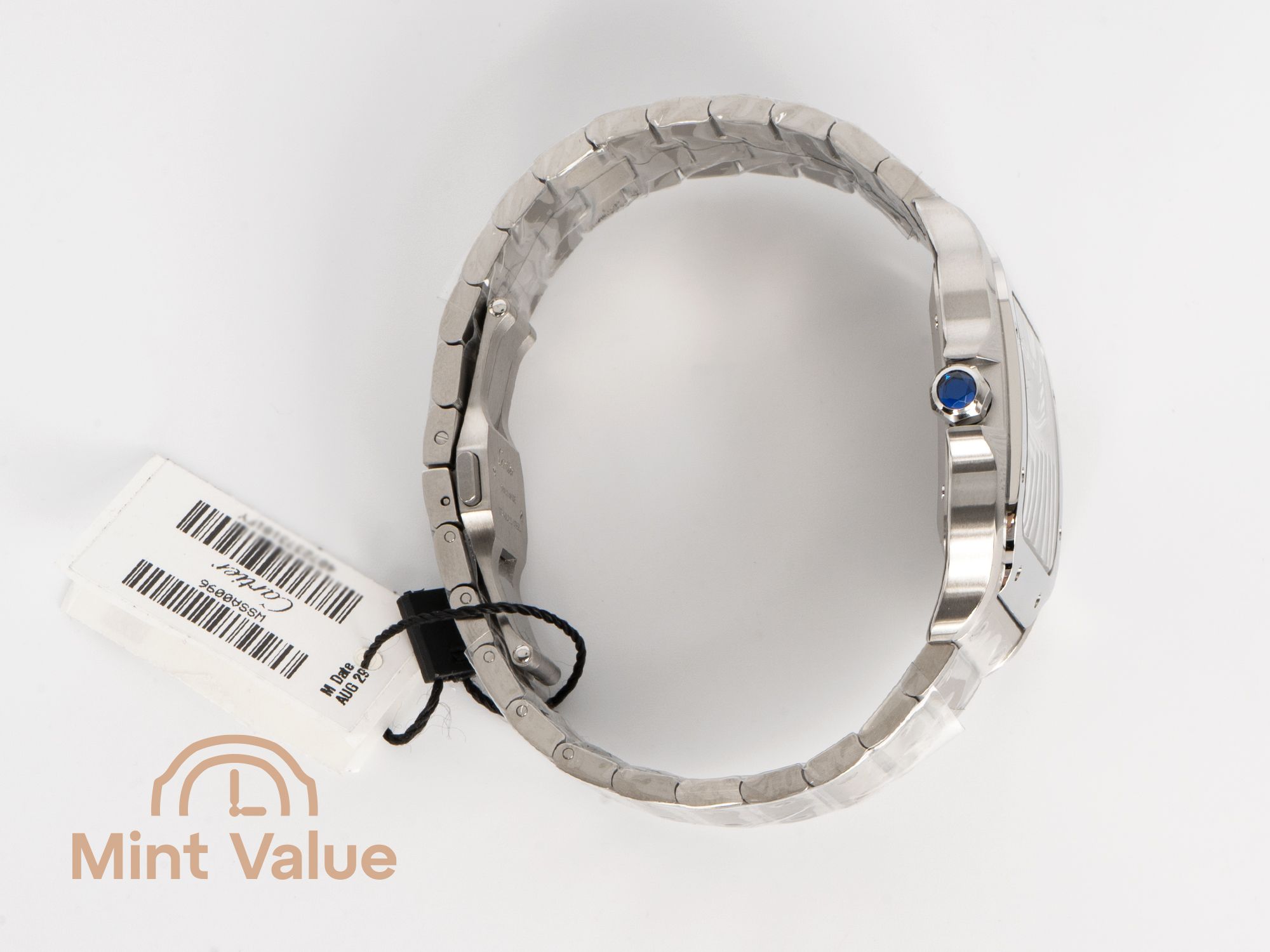 Crafted in stainless steel with both brushed and polished finishes, this Large model balances presence and wearability. The 39.8 mm case size delivers a confident yet refined wrist feel, while the 7‑sided crown set with a synthetic faceted spinel adds a subtle Cartier signature.