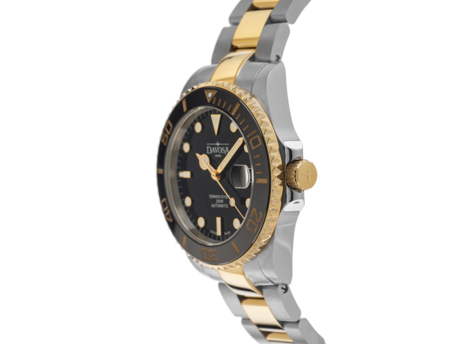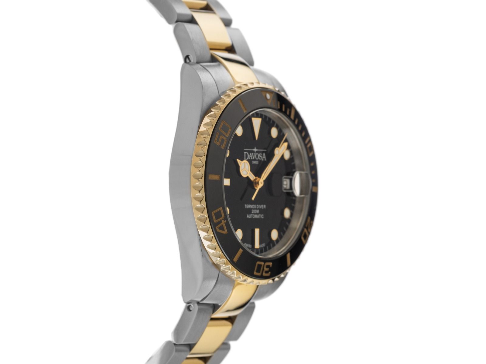 Davosa Ternos Medium Aço PVD Ouro Amarelo Cerâmica Automático Pulseira Aço PVD Ouro Amarelo Caixa em aço inoxidável polido e acetinado, diâmetro da caixa sem coroa 36,5mm, altura da caixa 11,5mm. Luneta revestida em PVD Ouro Amarelo com inserto de cerâmica preta, escala de 60 minutos e ponto luminoso para mergulhos, giratória apenas de um lado. Pulseira em aço inoxidável / revestida em PVD Ouro Amarelo, polida e acetinada, fecho de segurança dobrável em aço inoxidável com logotipo do fabricante. Mostrador preto com índices luminosos aplicados e ponteiros luminosos polidos. Movimento automático, calibre DAV 3021. Exibição de horas, minutos e segundos através de ponteiros centrais com parada de segundos para ajuste preciso da hora. Exibição de data com ajuste rápido sob lente de aumento às 3 horas. Vidro de safira resistente a riscos. Coroa rosqueada com proteção lateral e logotipo do fabricante. Fundo em aço inoxidável rosqueado e gravado. Peso do relógio incluindo a pulseira 138g, comprimento da pulseira incluindo a caixa 190mm. À prova d'água até 20 ATM. Número de referência: 166.197.50, ID: ST115612500226H-1050, número do artigo: 10000084609. Caixa original Davosa com embalagem externa e documentos de garantia, conjunto completo. Novo. Prazo de entrega imediato. Inclui selo de certificado de segunda mão / passaporte do relógio com uma imagem colorida, descrição detalhada e o valor de reposição do relógio acima de 1050,-€ e 1000 dias de garantia a partir da data de compra.