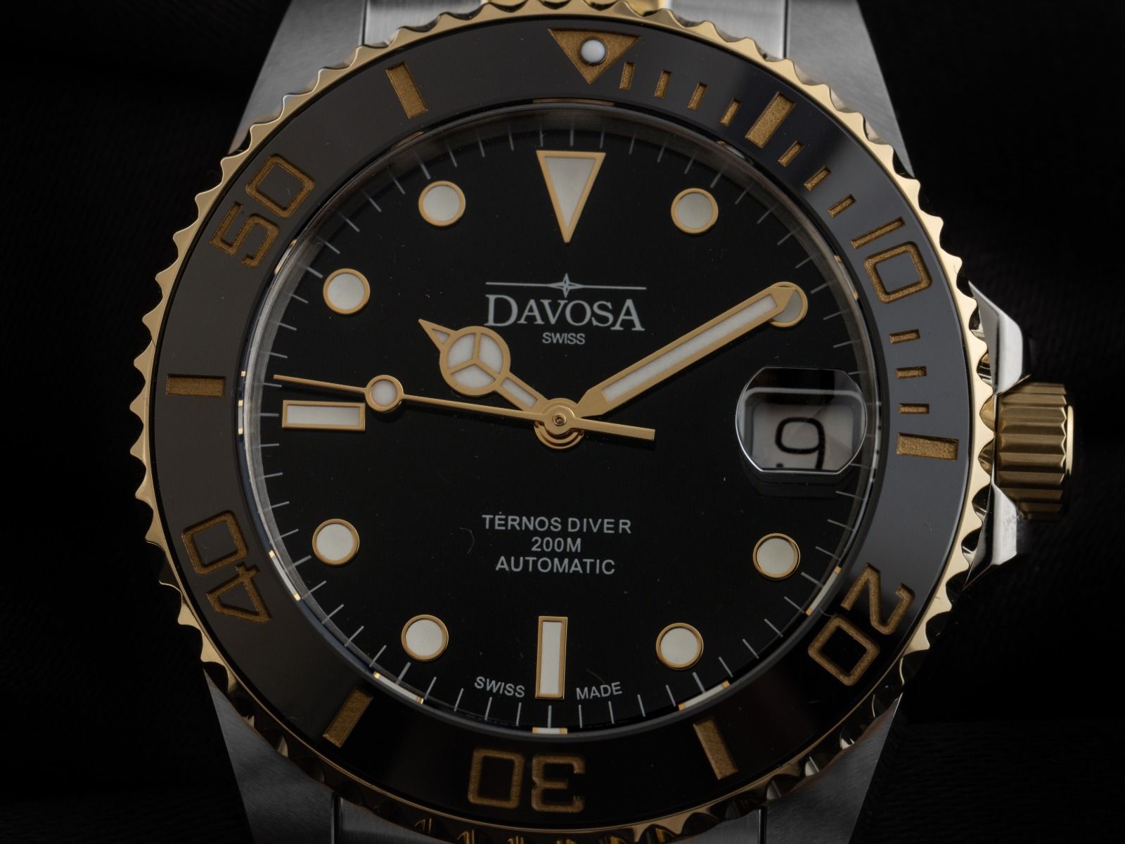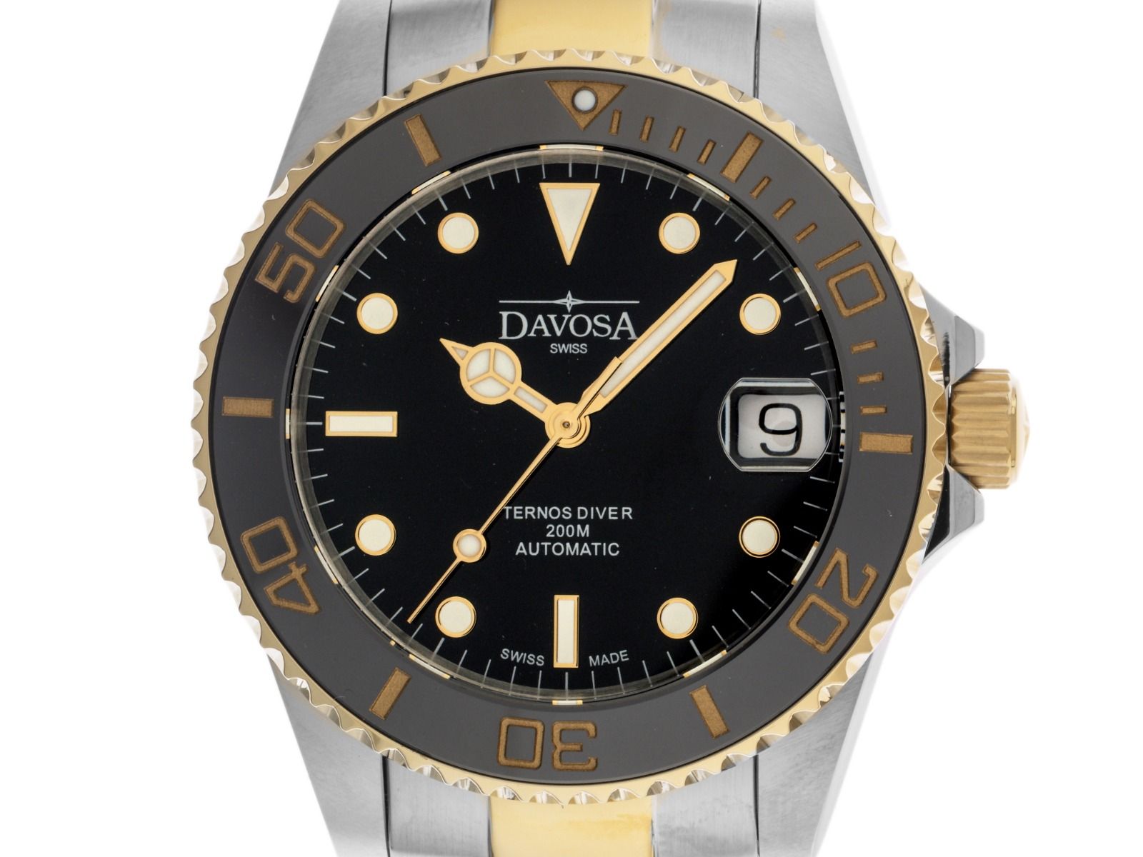 Davosa Ternos Medium Stahl PVD Gelbgold Keramik Automatik Armband Stahl PVD Gelbgold Gehäuse Edelstahl poliert und satiniert, Gehäusedurchmesser ohne Krone 36,5mm, Gehäusehöhe 11,5mm. Lünette PVD Gelbgold beschichtet mit schwarzem Keramik Inlay, 60-Minuten Skala und Leuchtpunkt für Tauchgänge, einseitig drehbar. Armband Edelstahl / PVD Gelbgold beschichtet , poliert und satiniert, Sicherheitsfaltschließe Edelstahl mit Hersteller-Logo. Zifferblatt schwarz mit aufgesetzten Leuchtindexen und polierten Leuchtzeigern. Uhrwerk Automatik, Kaliber DAV 3021. Anzeige von Stunde, Minute und Sekunde über Zeiger aus der Mitte mit Sekundenstopp zur sekundengenauen Einstellung der Uhrzeit. Datumsanzeige mit Schnellverstellung unter Glaslupe bei 3 Uhr. Saphirglas kratzfest. Krone verschraubbar mit Flankenschutz und Hersteller-Logo. Boden Edelstahl verschraubt und graviert. Gewicht der Uhr inklusive Armband 138g, Länge des Armbandes inklusive Gehäuse 190mm. Wasserdicht bis 20 ATM. Referenznummer: 166.197.50, ID: ST115612500226H-1050, Artikelnummer: 10000084609. Original Davosa Box mit Umkarton und Garantie Papiere, Full Set. Neu. Lieferzeit sofort. Inklusive certified pre owned Siegel / Uhrenpass mit einem Farbbild, der genauen Beschreibung sowie dem Wiederbeschaffungswert der Uhr über 1050,-€ und 1000 Tage Garantie ab Kaufdatum.