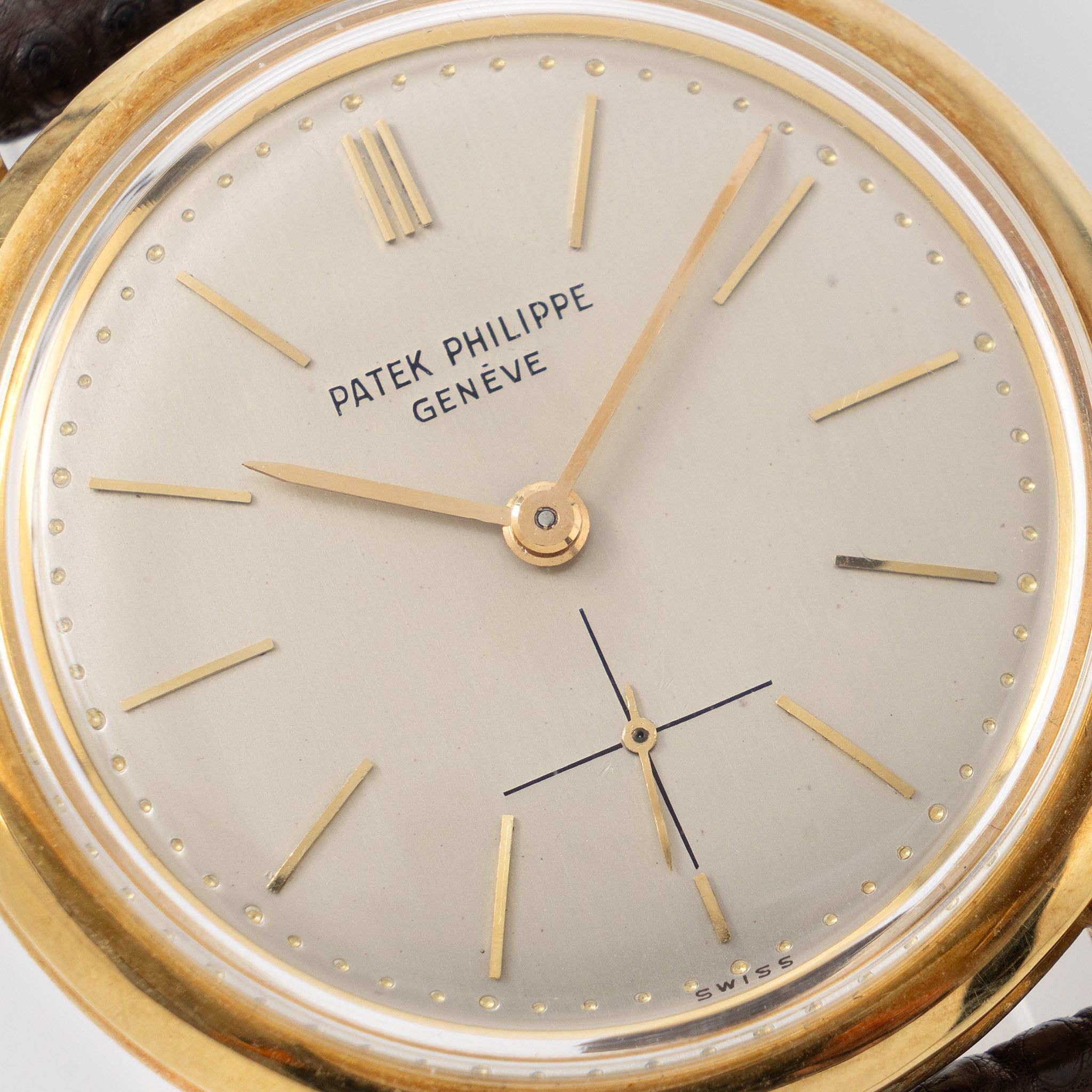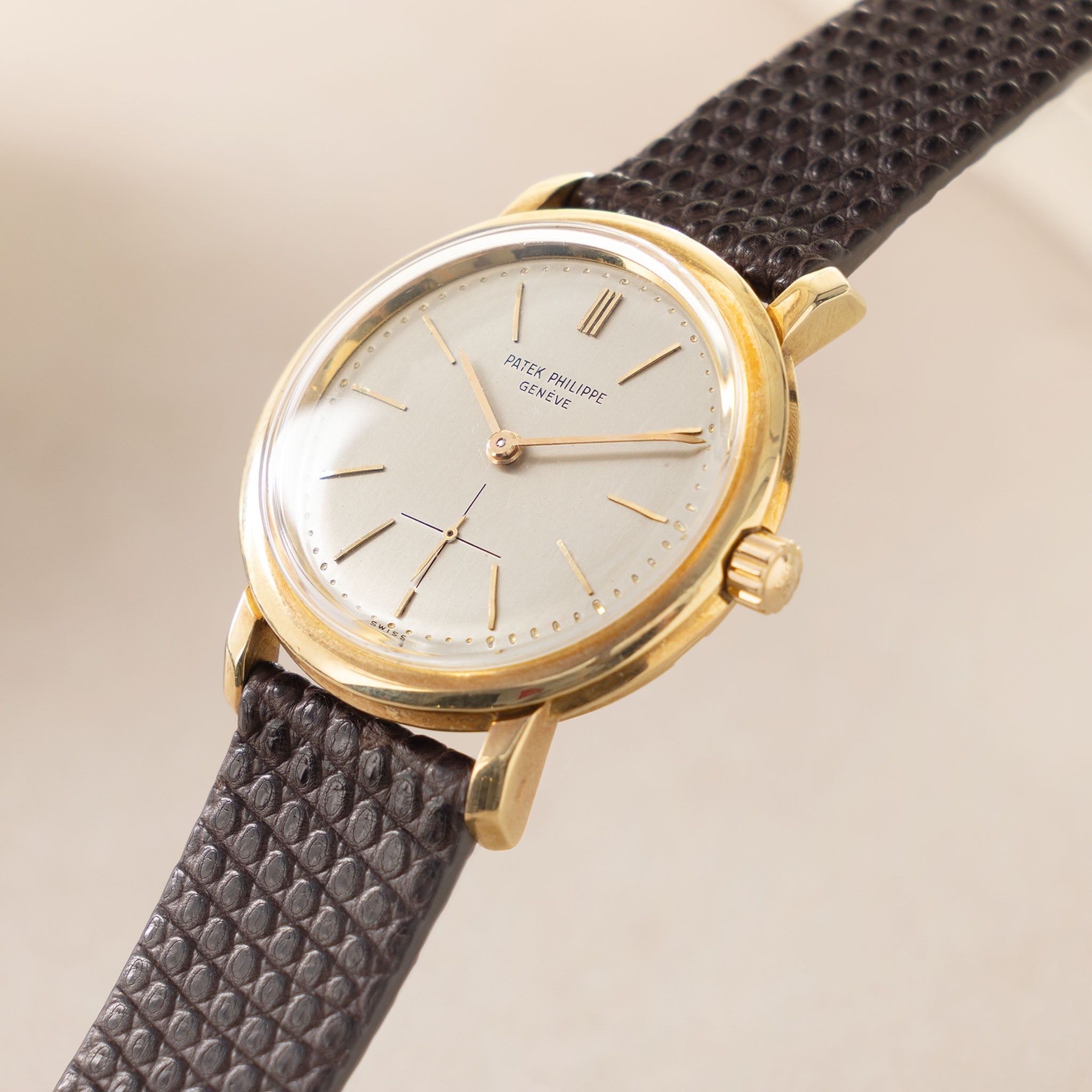 The Calatrava is one of the most refined wristwatches—if not the most refined wristwatch—and when paired with a nice leather strap, vintage yellow-gold models such as this reference 3440J become wonderfully casual for everyday wear. Introduced in 1961, it is notable for its water-resistant, screw-down case back, an uncommon feature for the time. It is estimated that only around 50 examples of this reference were produced. The 35 mm 18k yellow-gold case is in nice condition and features a distinctive hexagonal screw-down case back and unusual lugs . While the case may appear understated when viewed from the front, the Calatrava truly comes alive in profile, thanks to the three distinct angles elegantly cut into the downward-turning lugs. The dial is silvered and has aged to a soft cream tone, with lovely raised enamel Patek Philippe lettering. Typical for this reference, it features three vertically aligned applied markers at 12 o’clock, a “dot-dot” minute track, and a running seconds subdial on the lower half. It is fitted with fine, non-lumed stick hands and paired with a lovely leather strap, which we think is a perfect match. This elegant Calatrava is powered by the automatic Caliber 27-460 and has been fully serviced by our watchmaker, the setting crown has been replaced at this service. Our love for these fine Calatravas runs deep—let’s get in touch to talk!! Specifications Patek Philippe Calatrava Reference 35mm 18k yellow gold case with screw down case back Silver dial with applied stick markers stick-hands, hard enamel signature Comes on the photographed leather strap Caliber 27-460 automatic Case number 312617, movement number 1111xxxx , dating to the first half of the 1960’s Fully serviced by our watchmaker One-year mechanical warranty Free worldwide FedEx Priority shipping