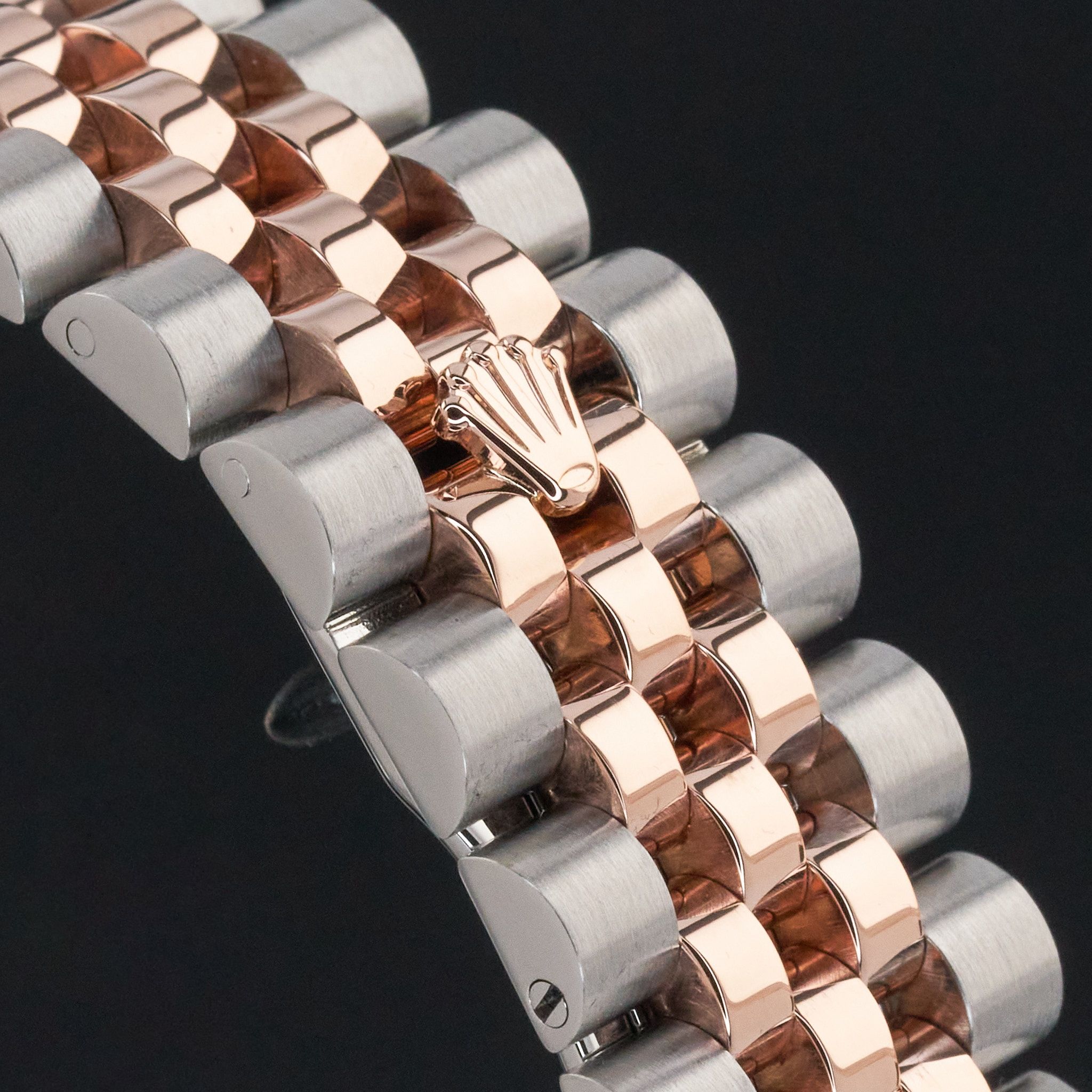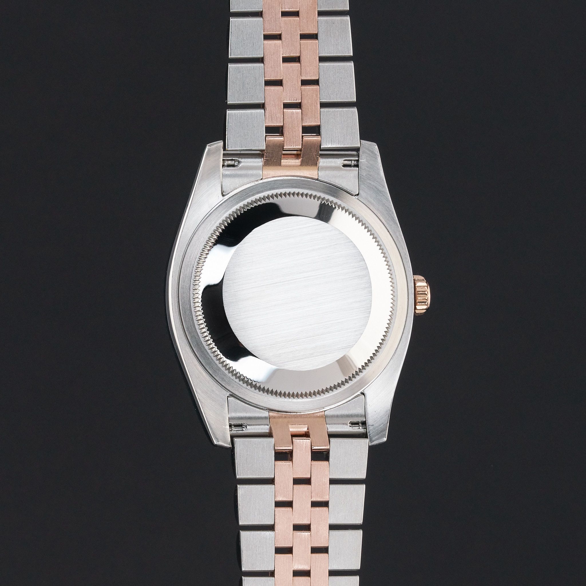 Este Rolex Datejust 116231 apresenta um mostrador de diamante prata jubilee e é feito de ouro rosa 18K e aço inoxidável, com ano de produção de 2009.