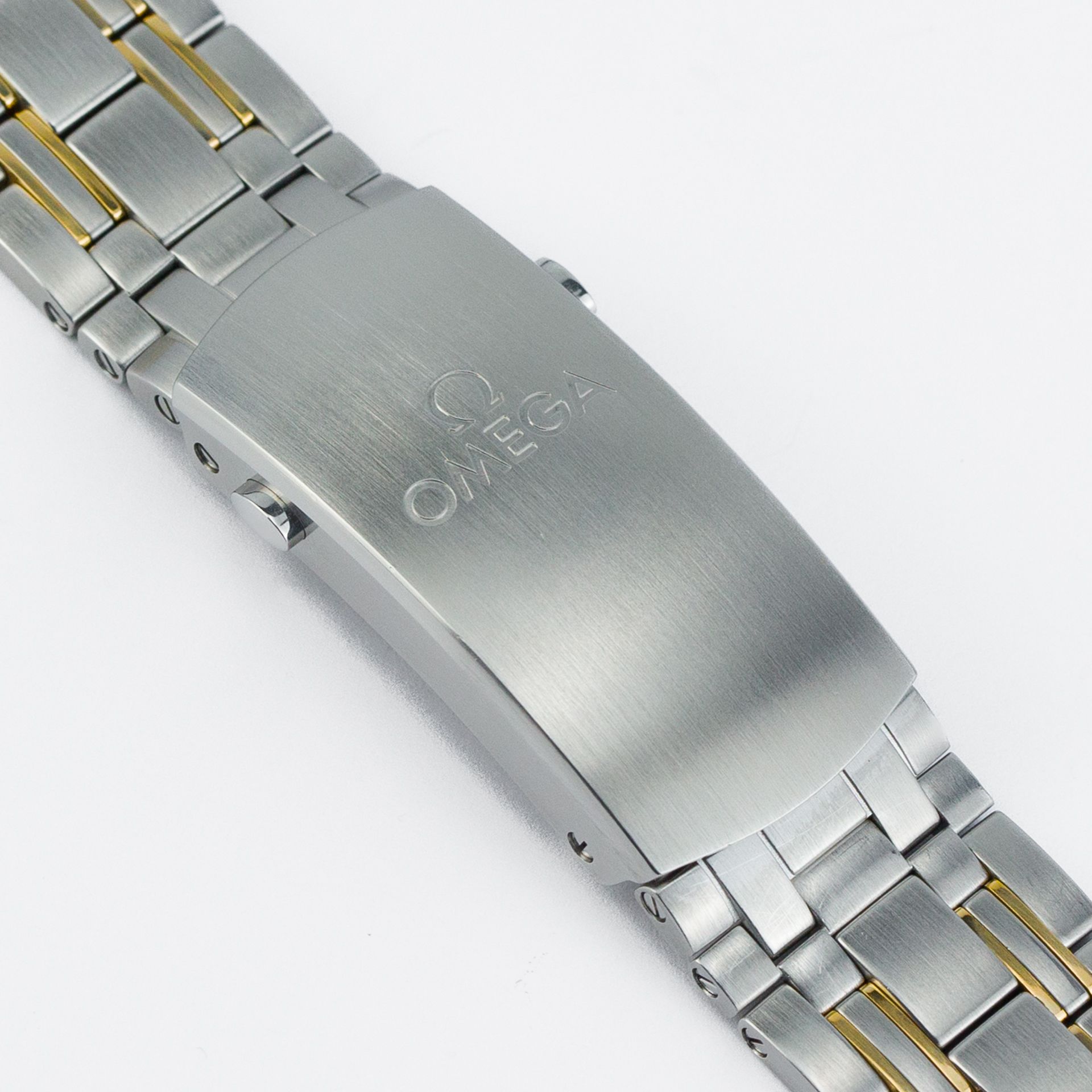 A pulseira (ou, neste caso, mais uma pulseira parecida com uma joia) é muito confortável por causa do fecho com seus botões de liberação fáceis de usar – limpa e de muito alta qualidade. Escovada com inserções de ouro amarelo polido separando as placas dos elos, e a densidade com que envolve seu pulso, mais uma vez mostra a alta qualidade do artesanato do relógio.