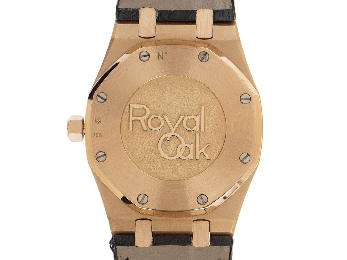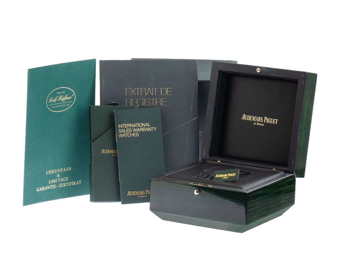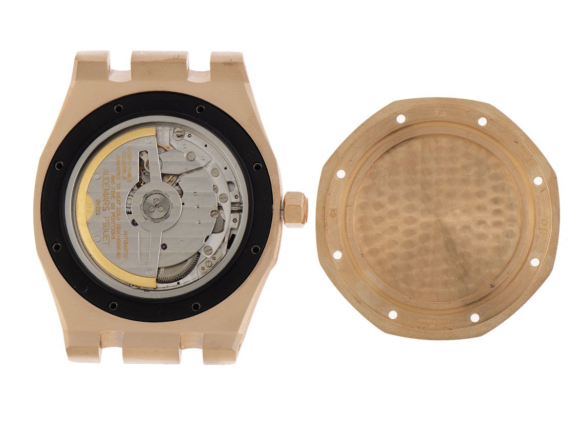 Gehäuse 18kt Roségold poliert und satiniert, Gehäusedurchmesser ohne Krone 39mm, Gehäusehöhe 10,2mm. Lünette 18kt Roségold mit 8 Weißgoldschrauben verschraubt, 8-eckig. Armband Leder schwarz, verschraubte Bandstege, Audemars Piguet Faltschließe 18kt Roségold mit Hersteller-Logo. Zifferblatt schwarz mit Waffelmuster, aufgesetzten roségoldenen Indexen und roségoldenen Zeigern. Uhrwerk Automatik, Audemars Piguet Manufakturkaliber 2329 mit 33 Edelsteinen. Anzeige von Stunde und Minute über Zeiger aus der Mitte, Datumsanzeige über Zeiger mit Schnellverstellung bei 2 Uhr, 2. Zeitzone (GMT) über Zeiger bei 6 Uhr, Gangreserveanzeige über Zeiger bei 10 Uhr, Tag- und Nachtanzeige zwischen 7 und 8 Uhr. Saphirglas kratzfest. Krone18kt Roségold verschraubbar mit Hersteller-Logo. Boden 18kt Roségold 8-fach verschraubt und graviert. Gewicht der Uhr inklusive Armband 123g. Referenznummer: 26120OR.OO.D002CR.01, Gehäusenummer: F67408-610209-0XXX, ID: KHPP1323635241124H-49500, Artikelnummer: 10000077222. Mit Gangkontrolle und kompletter äußerlicher Aufarbeitung von November 2024, inkl. 1000 Tage Garantie. Original Audemars Piguet Box mit Umkarton und Garantie Papiere von Oktober 2006, Full Set. Superschnäppchen, Kapitalanlage mit Wertsteigerungspotential, sehr seltenes Sammlerstück. Wie Neu. Lieferzeit sofort.