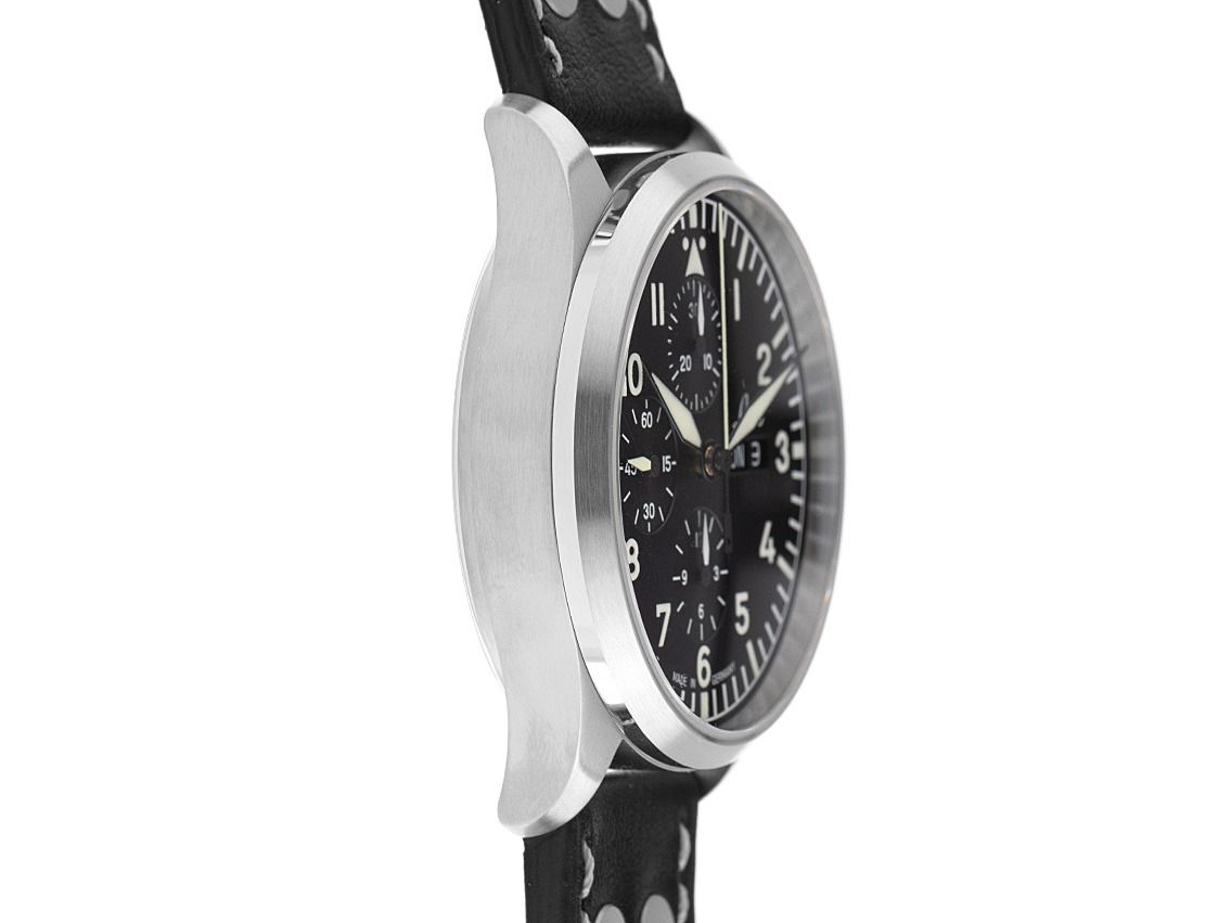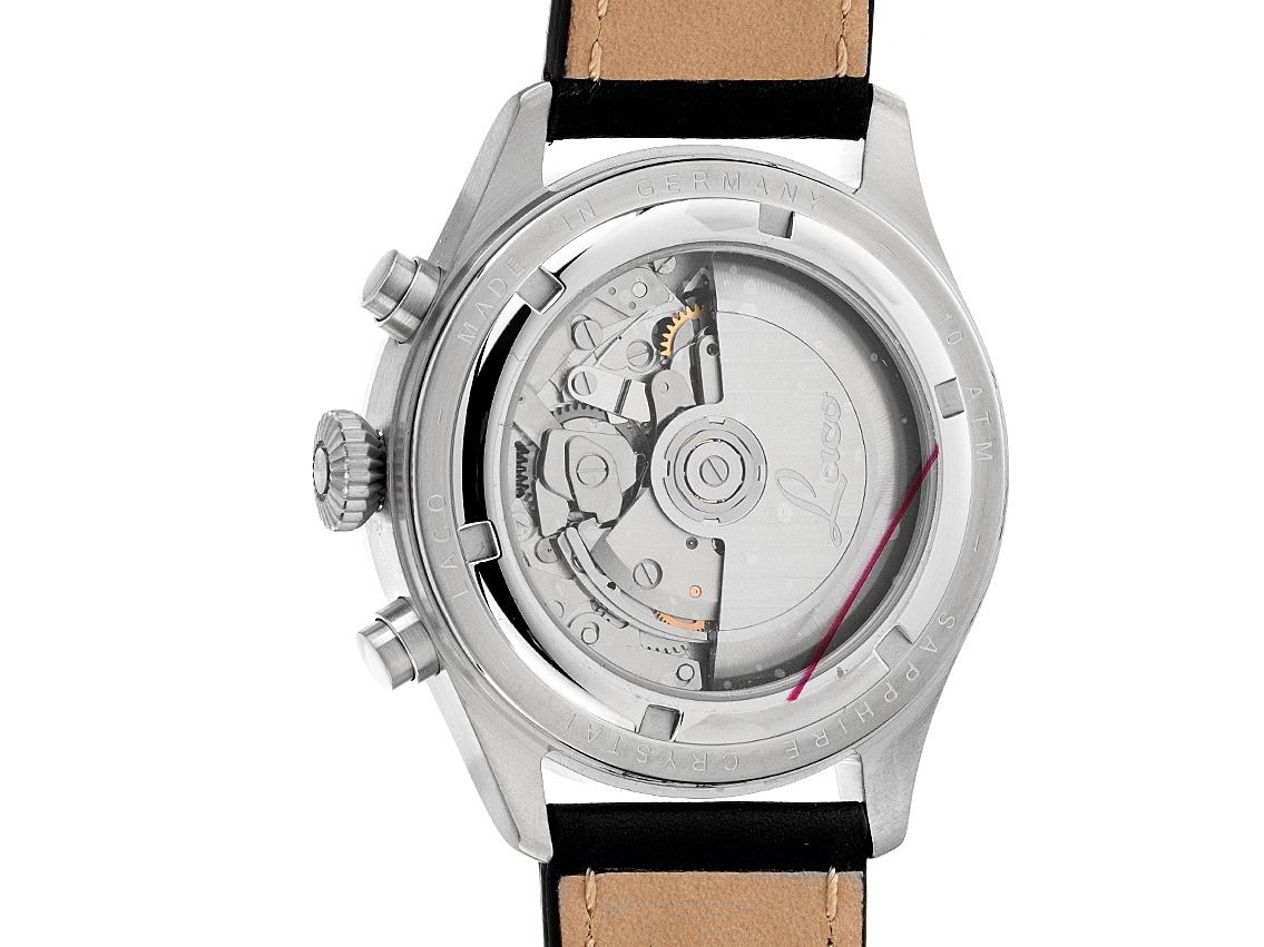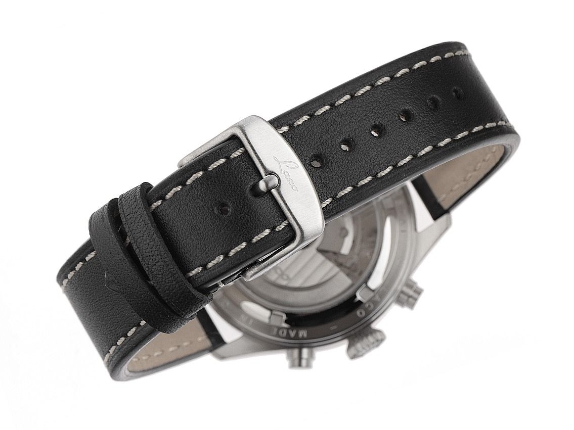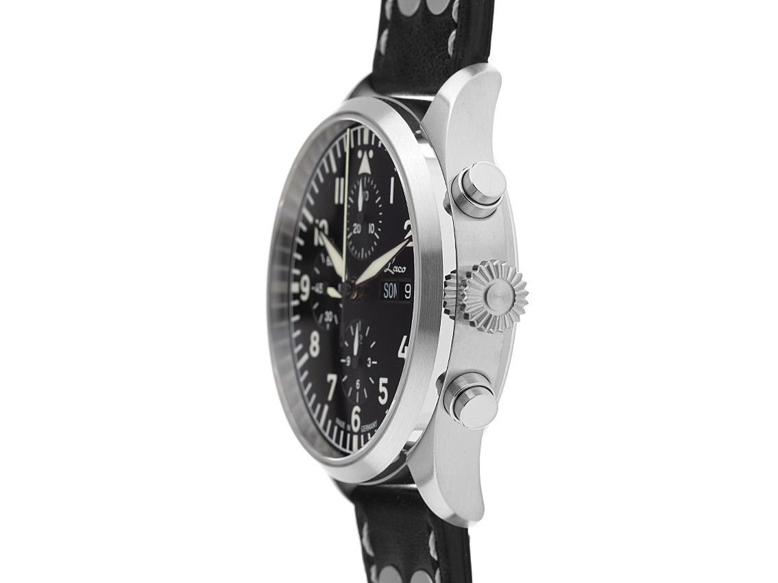 Laco Kiel.2 Schwarz Stahl Automatik Chronograph Armband Leder Gehäuse Edelstahl poliert und satiniert, Gehäusedurchmesser ohne Krone 43mm, Gehäusehöhe 14mm. Lünette Edelstahl glatt und satiniert. Armband Leder schwarz mit Nieten und heller Ziernaht, Anstoßbreite 22mm, Stiftschließe Edelstahl mit Hersteller-Logo. Zifferblatt schwarz mit arabischen Leuchtziffern und Leuchtindexen sowie gebläuten Leuchtzeigern. Uhrwerk Automatik, Kaliber Laco 500, Basiswerk Sellita SW 500 mit 25 Edelsteinen. Anzeige von Stunde und Minute über Zeiger aus der Mitte, kleine Sekunde mit Sekundenstopp zur sekundengenauen Einstellung der Uhrzeit bei 9 Uhr, Datums- und Wochentagsanzeige in Deutsch mit Schnellverstellung bei 3 Uhr. Saphirglas kratzfest und doppelseitig entspiegelt. Krone geriffelt mit Hersteller-Logo. Boden Edelstahl verschraubt und graviert mit Saphirglas Sichtfenster. Gewicht der Uhr inklusive Armband 105g. Wasserdicht bis 10 ATM. Referenznummer: 862148, ID: ST061526280226H-2290, Artikelnummer: 10000084656. Original Laco Etui mit Umkarton und Garantie Papiere sowie Beschreibung, Full Set. Neu. Lieferzeit sofort. Inklusive certified pre owned Siegel / Uhrenpass mit einem Farbbild, der genauen Beschreibung sowie dem Wiederbeschaffungswert der Uhr über 2290,-€ und 1000 Tage Garantie ab Kaufdatum.