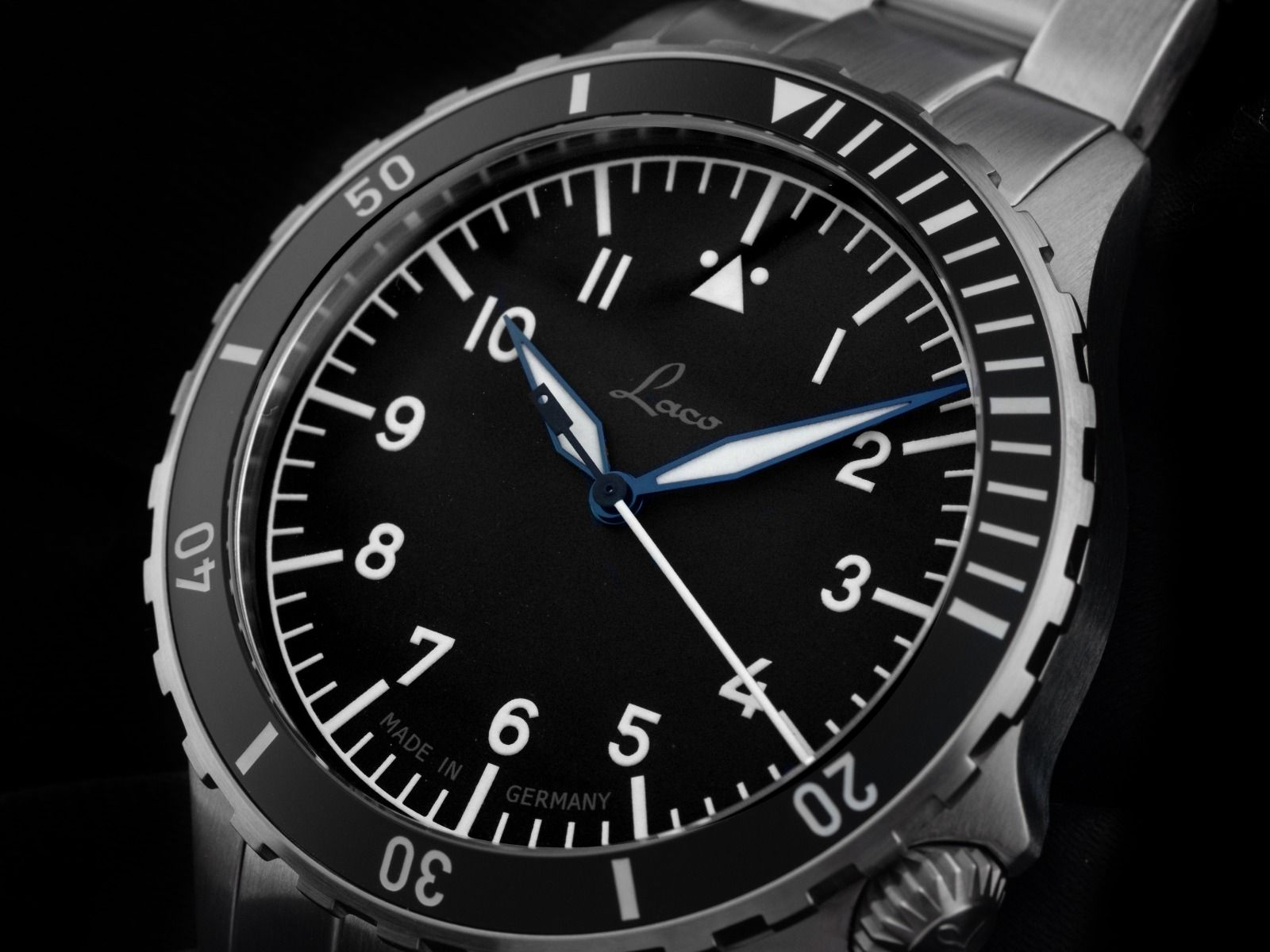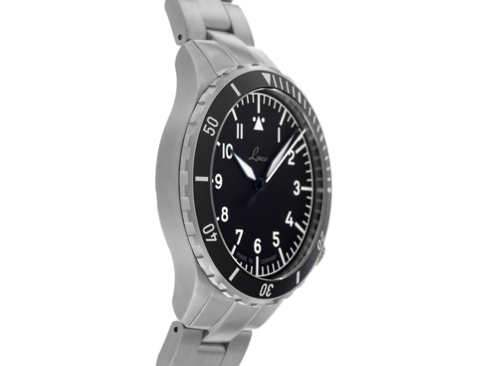 Laco Köln MB Aço Automático Pulseira Aço Caixa em Aço Inoxidável acetinado. Diâmetro da caixa sem coroa 41mm. Altura da caixa 12,0mm. Luneta em aço inoxidável acetinado com inserto preto e escala de 60 minutos, unidirecional. Pulseira em aço inoxidável acetinado, fecho de segurança dobrável em aço inoxidável com logotipo do fabricante. Mostrador preto fosco com números árabes brancos e índices, além de ponteiros azulados. Movimento automático, calibre Laco 200, base Sellita SW 200 com 26 pedras preciosas. Exibição de horas, minutos e segundos através de ponteiros centrais. Vidro de safira resistente a arranhões e curvado. Coroa rosqueada com logotipo do fabricante às 4 horas. Fundo em aço rosqueado e gravado com janela de vidro de safira. Peso do relógio incluindo a pulseira 172g, comprimento da pulseira incluindo a caixa 205mm. À prova d'água até 20 ATM. Número de referência: 862191.MB. ID: ST061514880226H-1240, número do artigo: 10000084658. Caixa original Laco com embalagem e documentos de garantia, conjunto completo. Novo. Prazo de entrega imediato.. Inclui selo de certificado de segunda mão / passaporte do relógio com uma imagem colorida, descrição detalhada e o valor de reposição do relógio acima de 1240,-€ e 1000 dias de garantia a partir da data de compra.