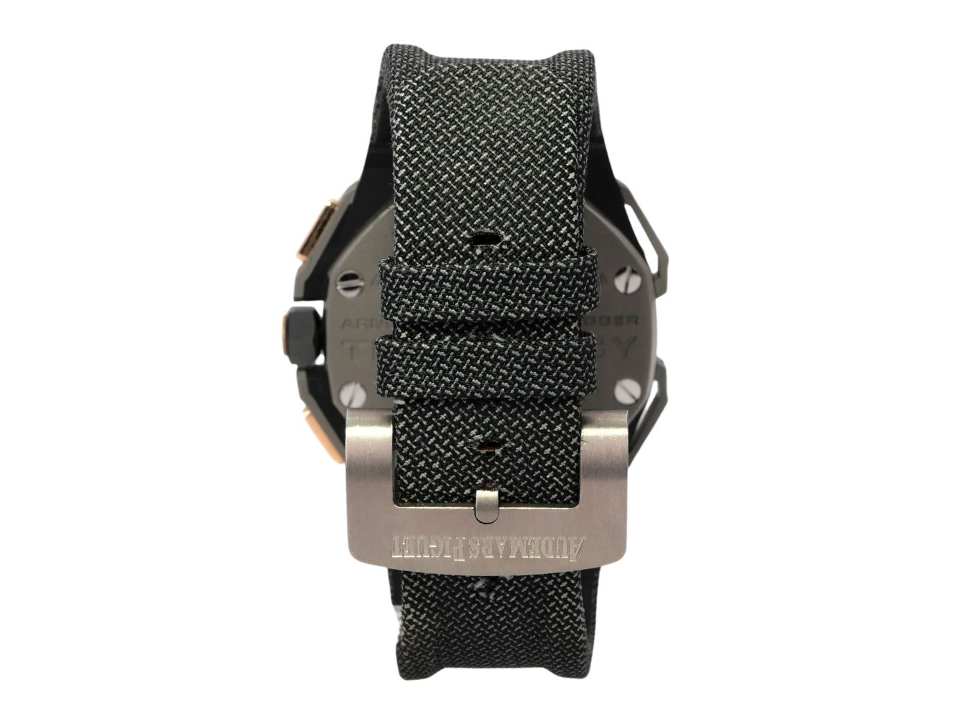 Audemars Piguet Royal Oak Offshore Arnold Schwarzenegger Legacy 26378IO.OO.A001KE.01Case made of ceramic / polished and satin-finished rose gold, case diameter 48 mm, black ceramic bezel, black leather strap with pin buckle, black dial with luminous markers, black subdials, tachymeter scale, self-winding movement, stopwatch, date display, anti-reflective sapphire glass, water-resistant up to 10 bar, limited to 1500 pieces.
