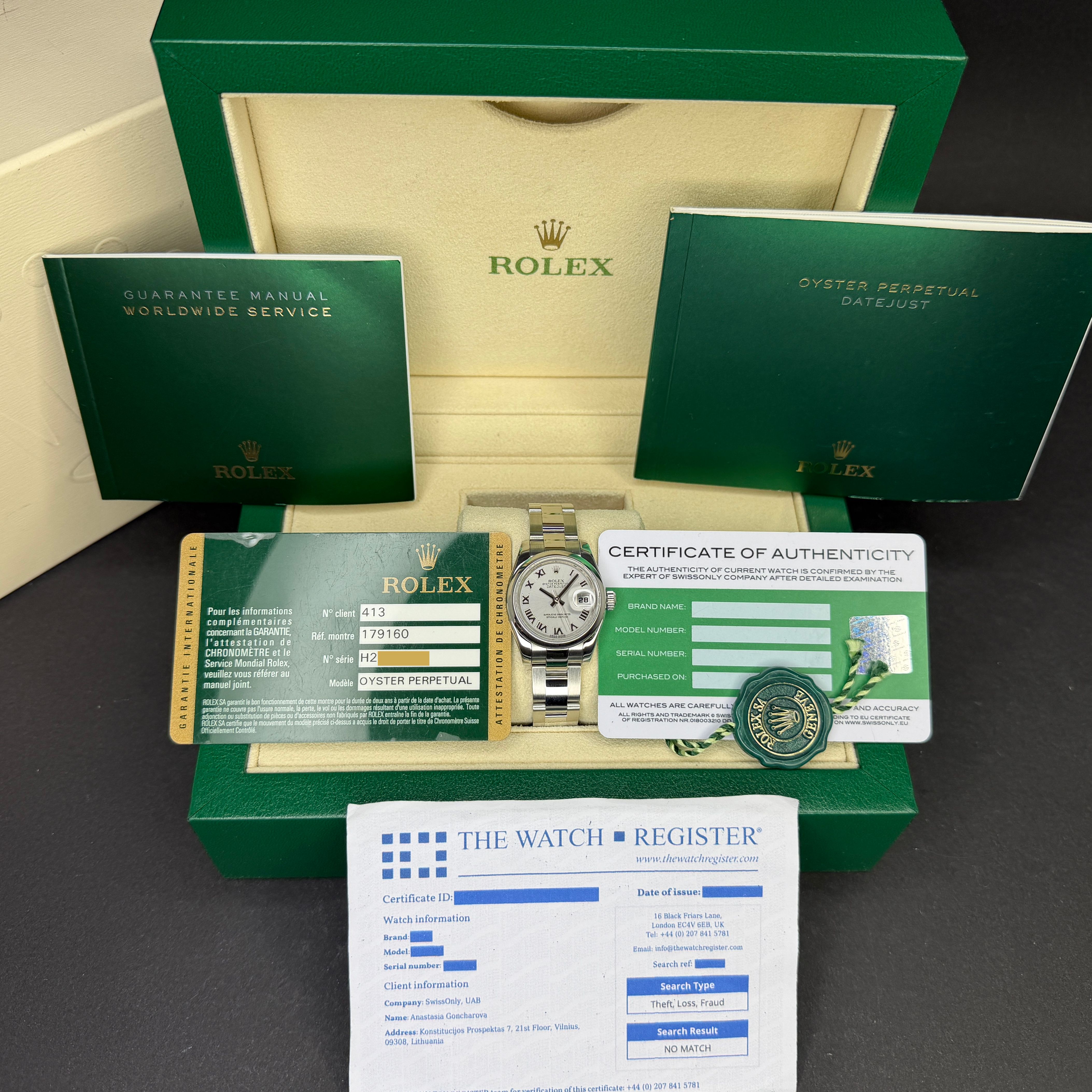 This Rolex Lady-Datejust 179160 features a Grey Roman dial and is crafted from stainless steel, with a production year of 2014.Case No: H25XXXXX