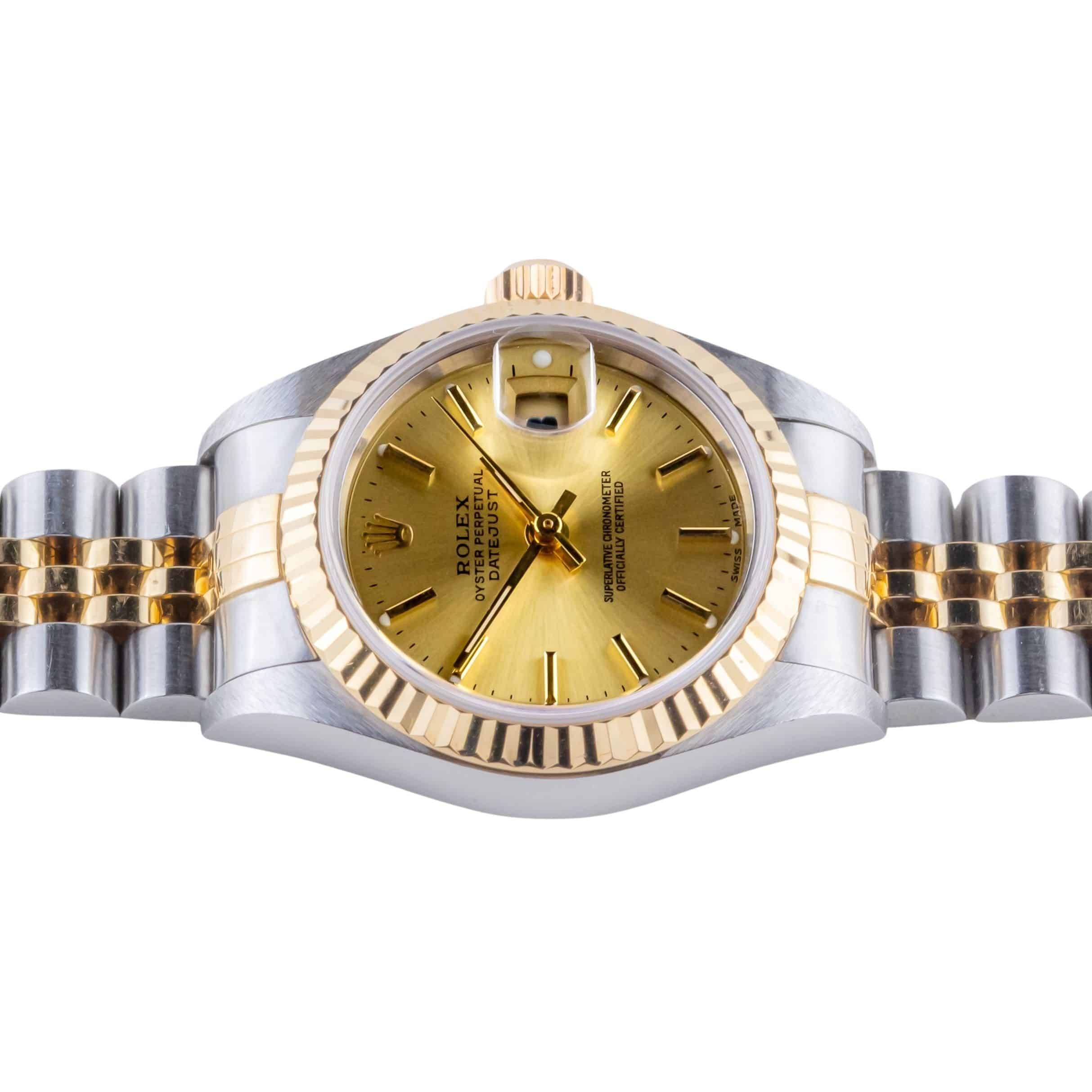 Rolex Oyster Perpetual Lady-Datejust referência 79173 de 1999, incluindo conjunto completo. A Lady-Datejust 79173 possui uma caixa de 26mm em ouro e aço inoxidável, uma pulseira jubilee bicolor e um bezel fluted em ouro 18k. Esta Lady-Datejust 79173 apresenta um movimento automático calibre 2235 com função de data rápida, um cristal de safira resistente a riscos e um mostrador champagne.