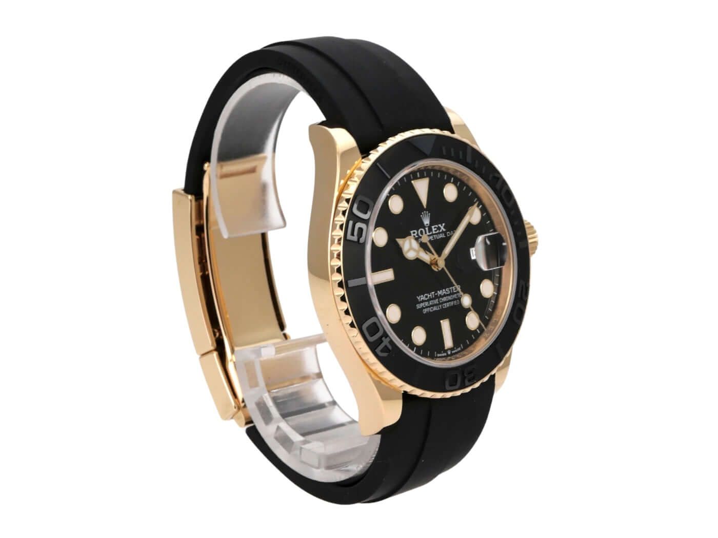 Rolex Yacht-Master 42 Yellow Gold Ref. 226658 from 2023Case made of 18 ct yellow gold, polished and satin-finished, case diameter 42 mm, bezel made of 18 ct yellow gold with ceramic inlay, rotatable both sides, Oyster rubber strap with safety folding clasp, black dial with set luminous indices and luminous dots, luminous hands, automatic movement, Rolex manufacture calibre 3235 with 31 jewels, frequency 28,800 vibrations per hour, 70 hours power reserve, date display, chronometer, scratch-resistant sapphire glass, screw-down crown with flank protection, 18 ct yellow gold screw-down back, water-resistant up to 10 bar.