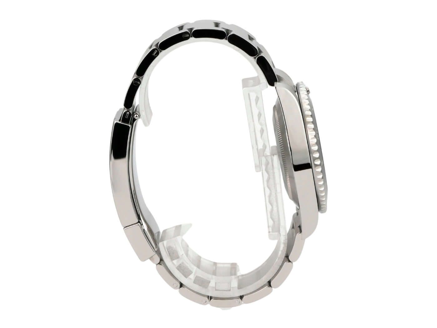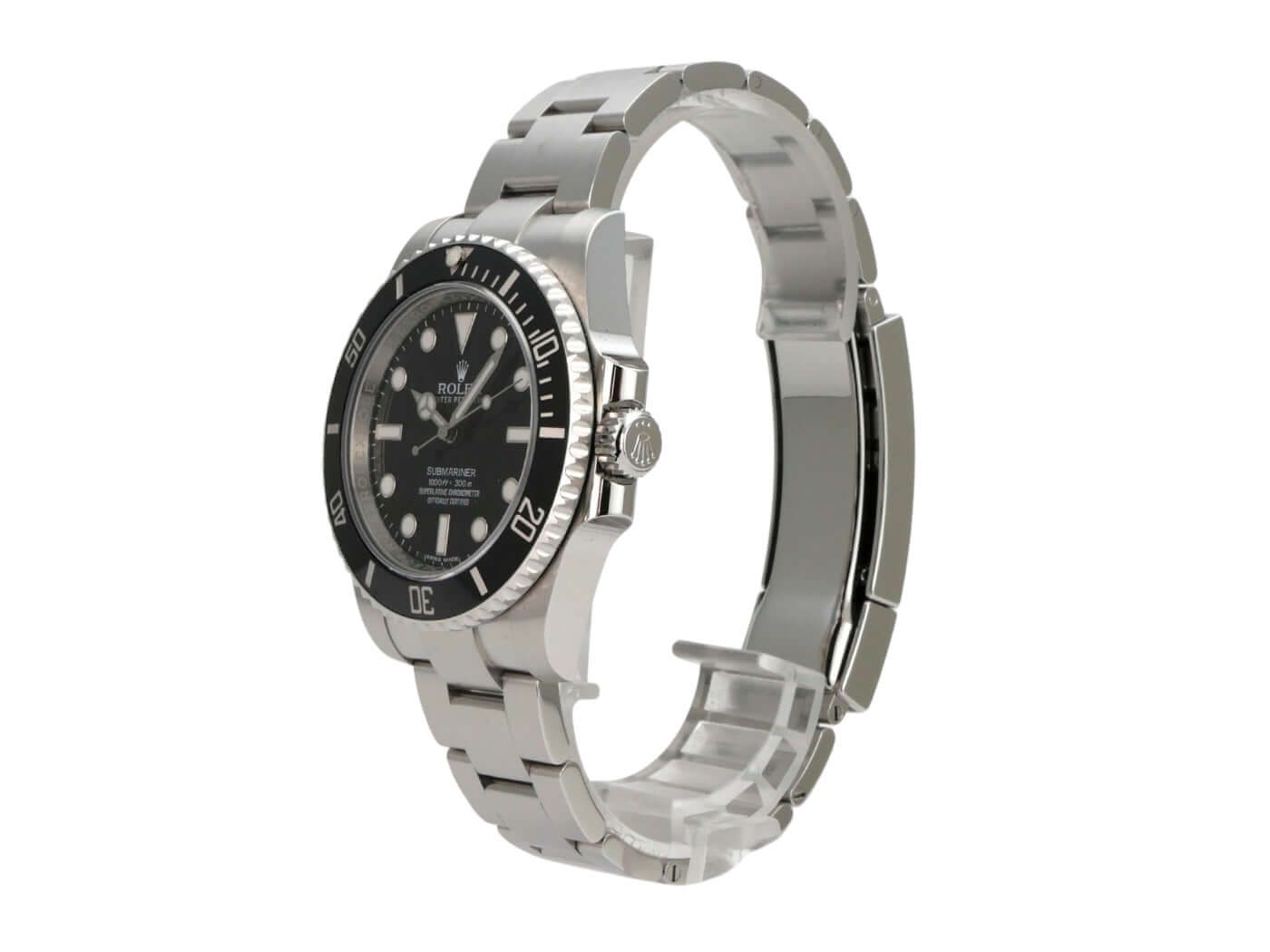 Rolex Submariner No Date 114060Case made of polished and satin-finished stainless steel, case diameter 40 mm, case height 12.5 mm, stainless steel bezel with black ceramic inlay, 60-minute scale and luminous dot, unidirectional rotating, satin-finished Oyster stainless steel bracelet with safety folding clasp, black dial with applied luminous indices and luminous dots, luminous hands, automatic movement, Rolex caliber 3130 with 31 jewels, 28,800 vibrations per hour, chronometer, scratch-resistant sapphire crystal, screw-down crown with flank protection, screwed stainless steel back, water-resistant up to 30 bar.