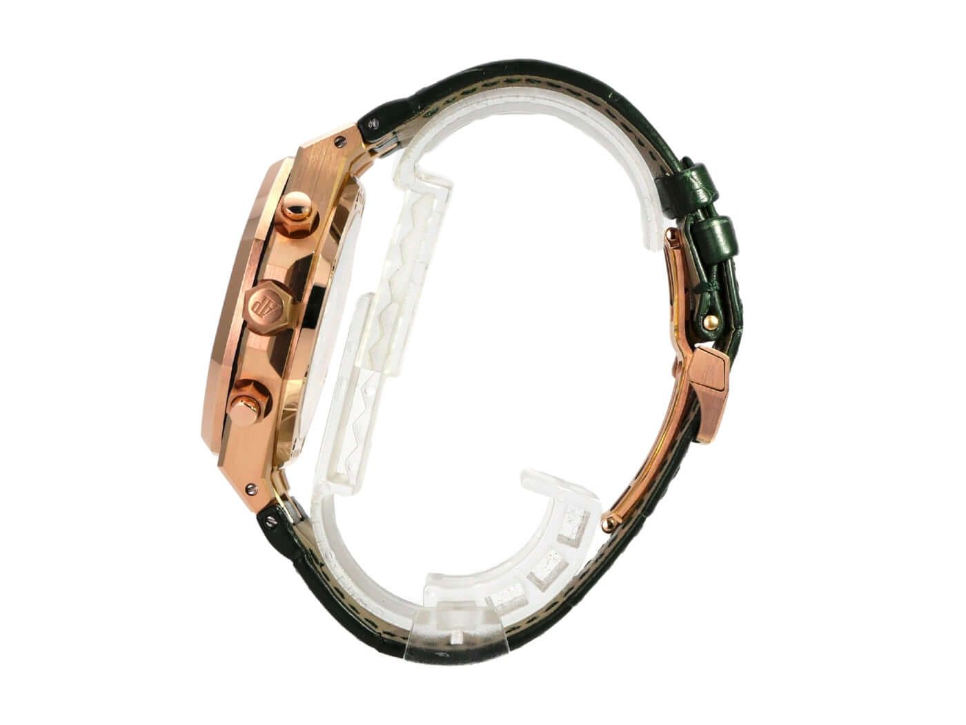 Audemars Piguet Royal Oak Chronograph 26240OR.OO.D404CR.02Case made of 18 kt pink gold, polished and satin-finished, case diameter 41 mm, case height 11 mm, pink gold bezel polished and satin-finished, green leather strap with folding clasp, green dial with luminous markers, luminous hands, subdials in pink, self-winding movement, in-house caliber 4401 with 40 jewels, frequency 28,800 vibrations per hour, power reserve of about 70 hours, date display, anti-reflective sapphire crystal, screwed and engraved 18 kt pink gold back with viewing window, water-resistant up to 5 bar.