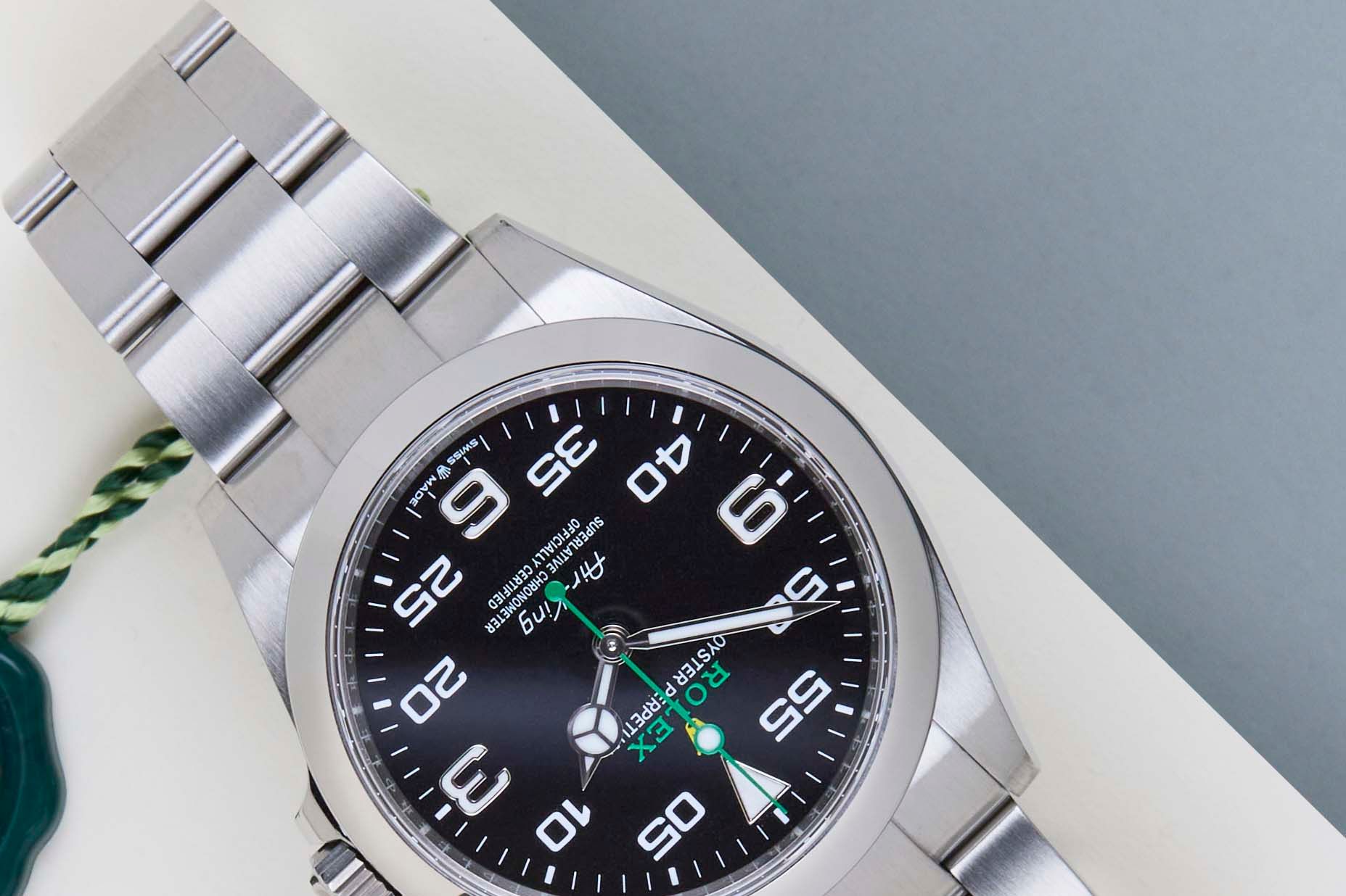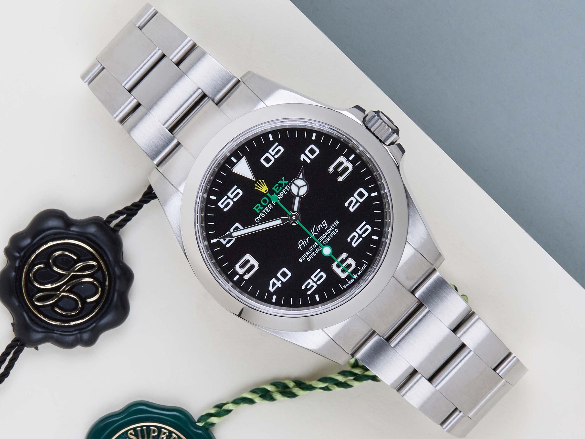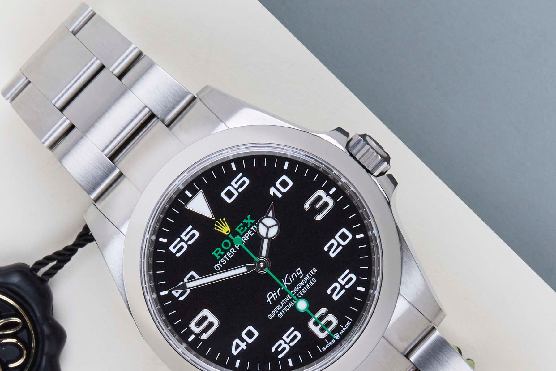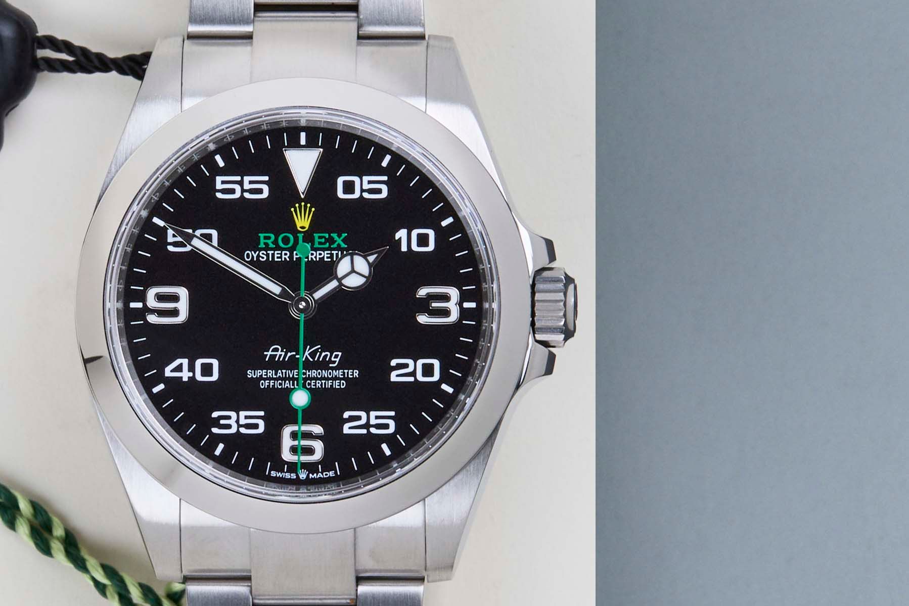 O Rolex Air-King foi apresentado pela primeira vez na década de 1940. Ele é nomeado em homenagem à Força Aérea Real Britânica, que usou relógios Rolex como equipamento padrão para seus pilotos durante a Segunda Guerra Mundial. Este Rolex Air-King foi vendido pela primeira vez em Agosto de 2024.