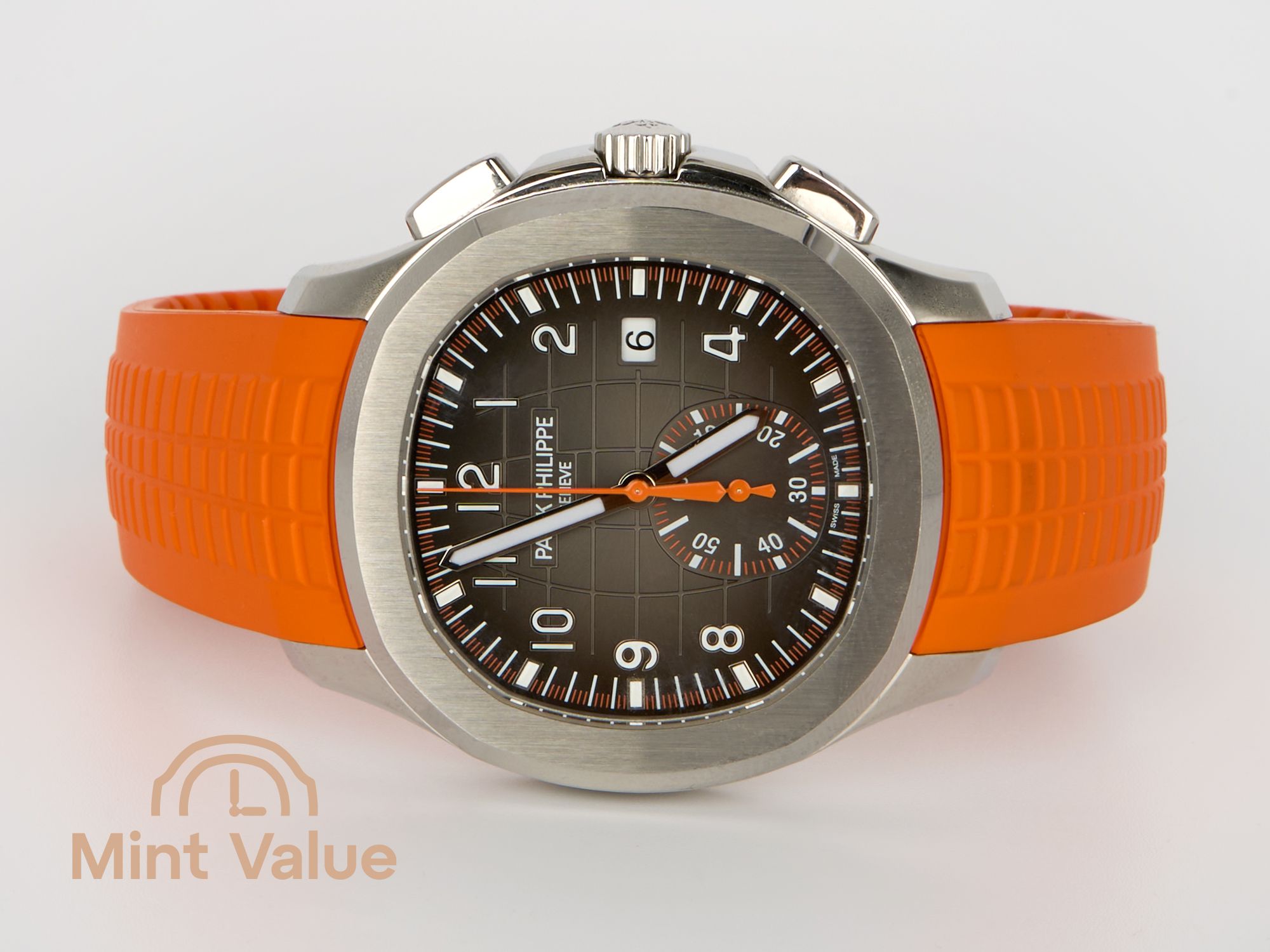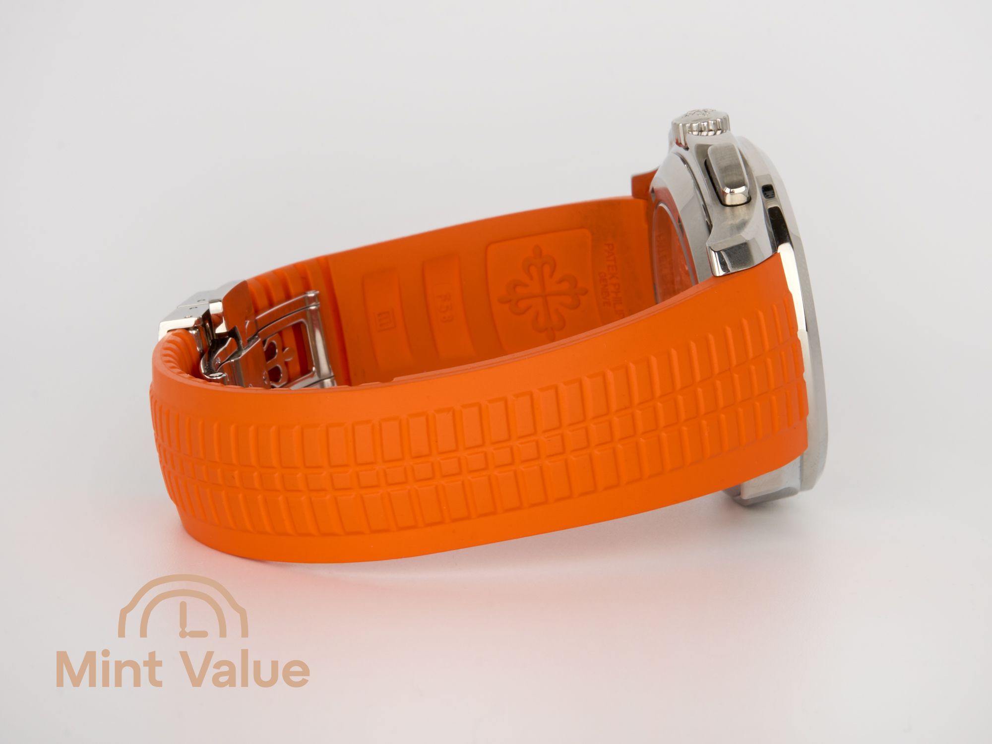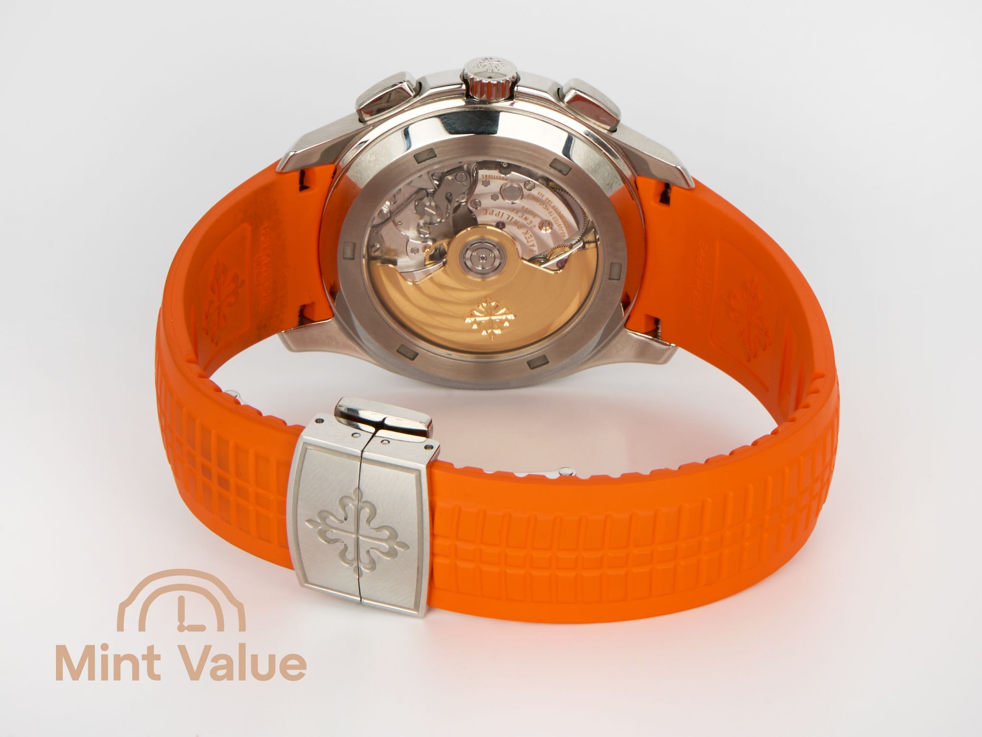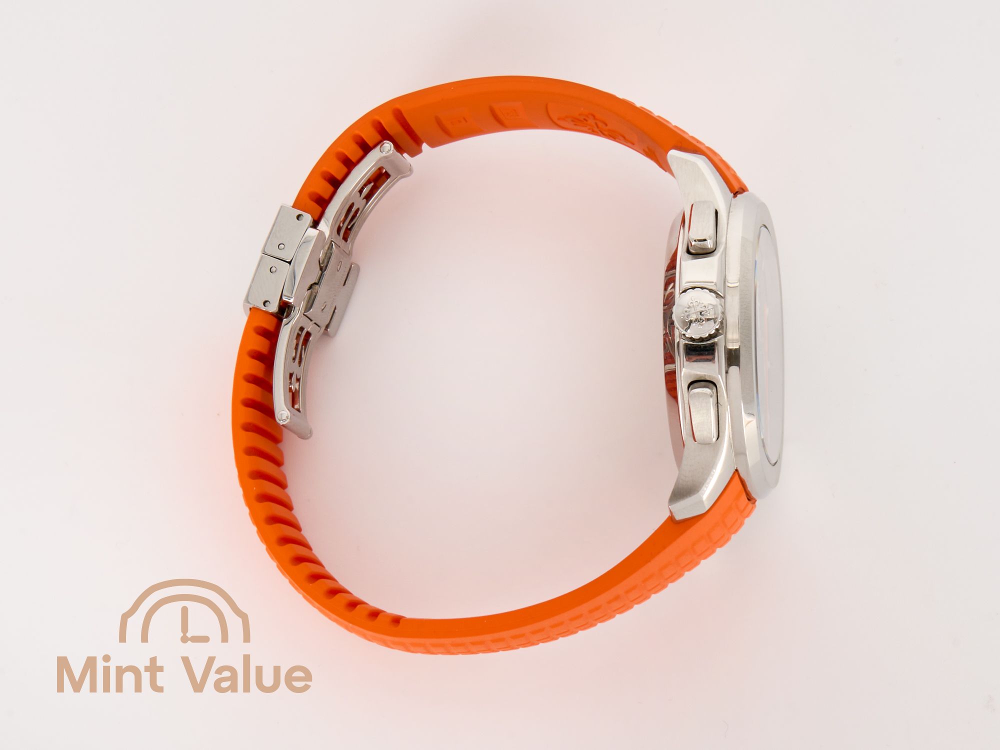 The 42.2 mm stainless-steel case features the signature octagonal bezel with contrasting polished and satin finishes. The watch is delivered as a full set: with the original pin pusher and two interchangeable straps in ultra-resistant composite material — black and orange — secured by Patek Philippe’s patented Aquanaut fold-over clasp with four independent catches, ensuring exceptional comfort and security.