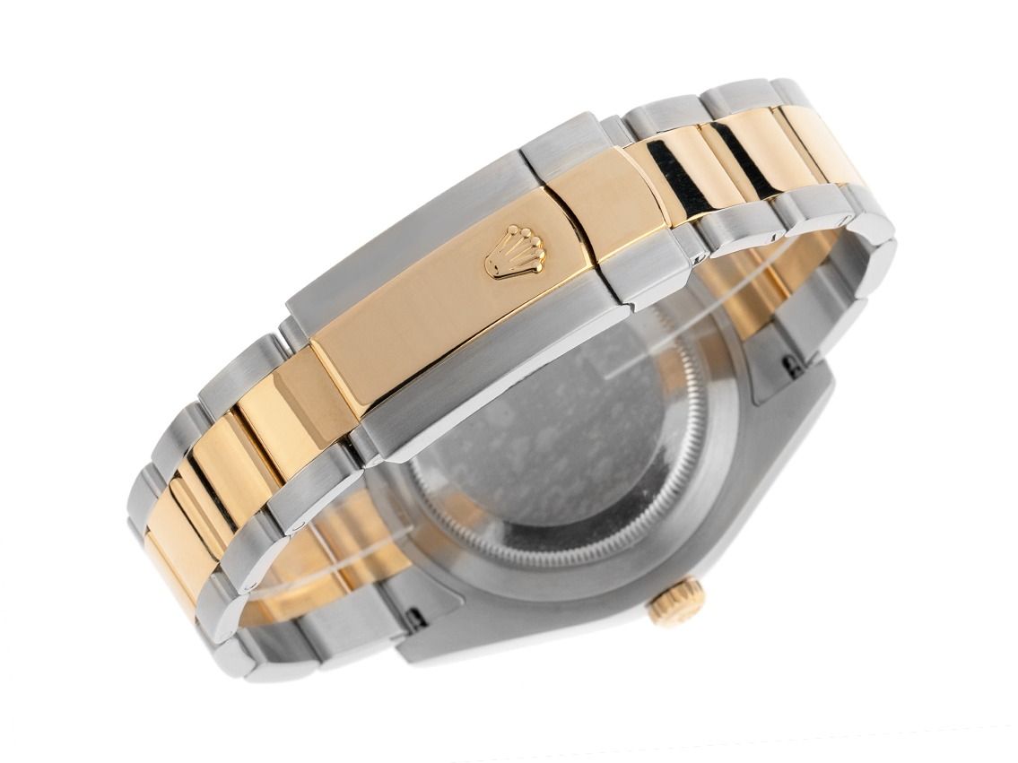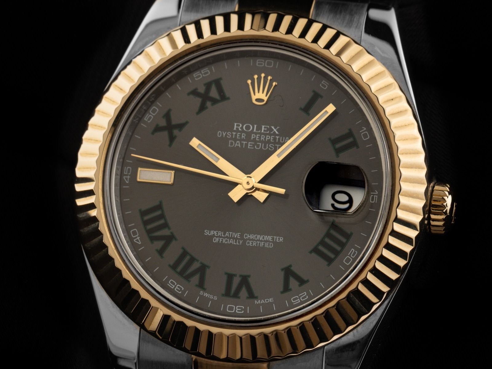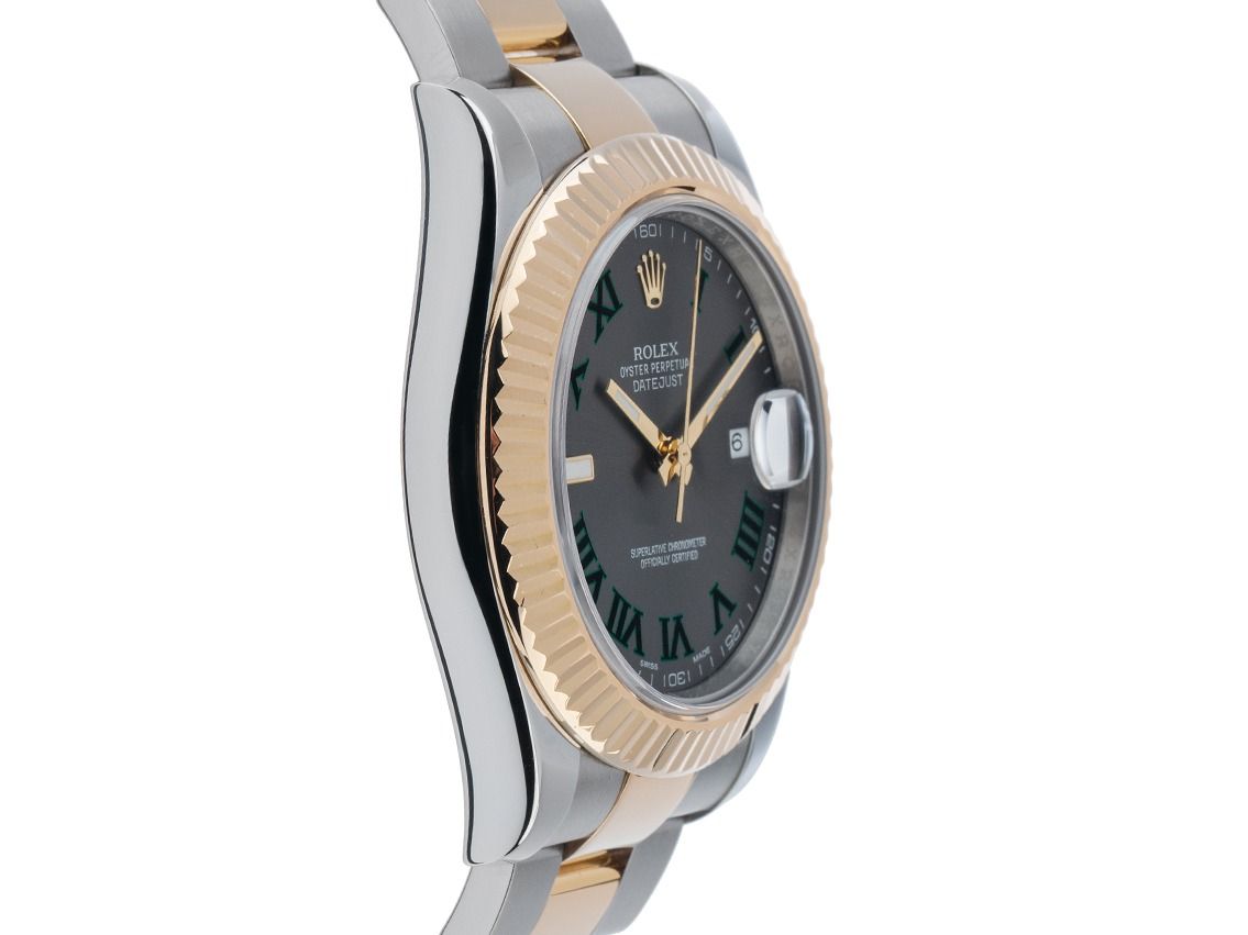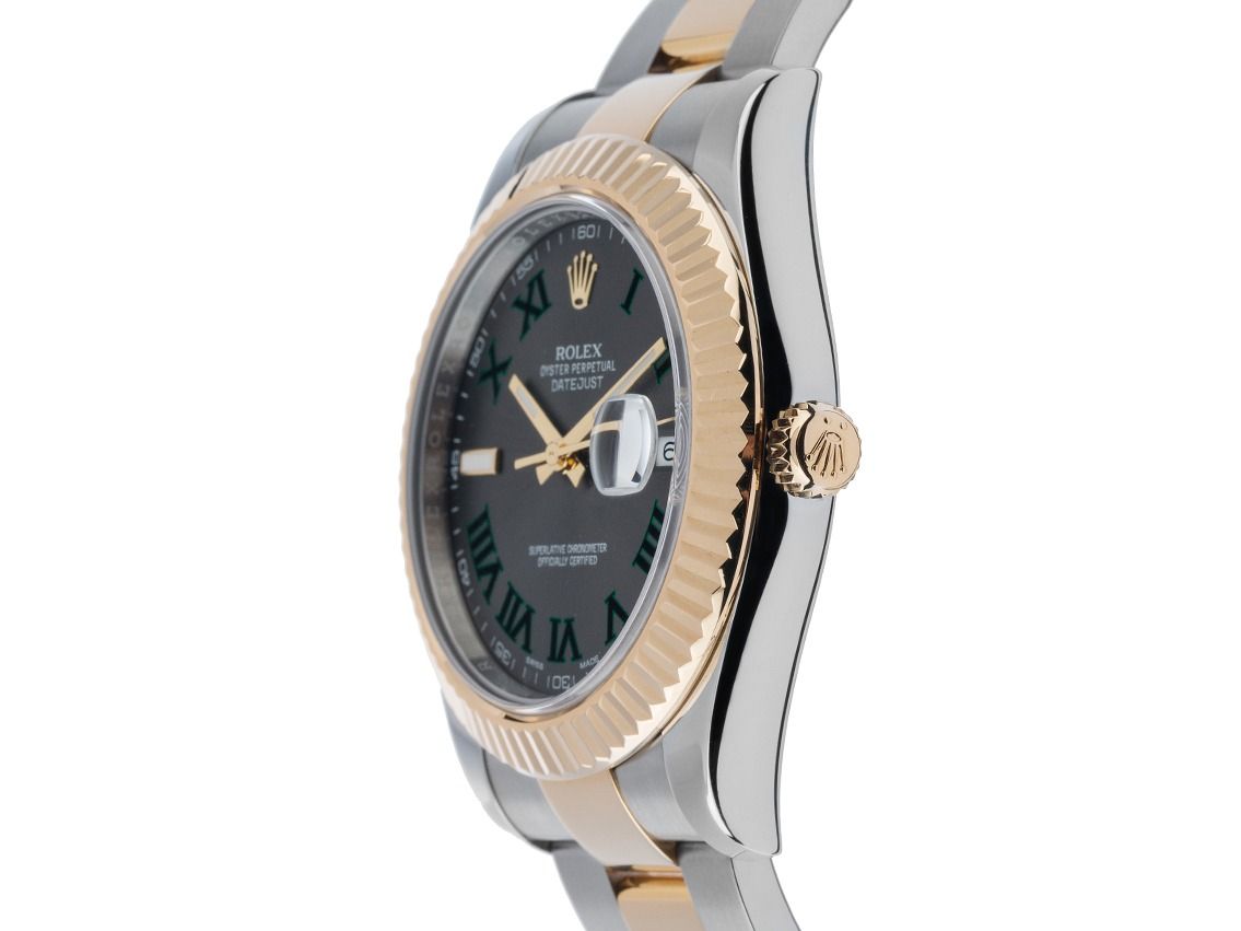 Rolex Datejust II Wimbledon Stahl 18kt Gelbgold Automatik Armband OysterGehäuse Edelstahl poliert und satiniert, Gehäusedurchmesser ohne Krone 41mm, Gehäusehöhe 12mm. Lünette 18kt Gelbgold geriffelt und poliert. Armband Oyster Edelstahl / 18kt Gelbgold poliert und satiniert, Faltschließe Edelstahl / 18kt Gelbgold mit Hersteller-Logo. Zifferblatt Wimbledon schiefergrau mit römischen Ziffern, in Gelbgold gefasstem Index bei 9 Uhr und gelbgoldenen Zeigern. Uhrwerk Automatik, Chronometer mit Zeugnis, Rolex Manufakturkaliber 3136 mit 31 Edelsteinen. Anzeige von Stunde, Minute und Sekunde über Zeiger aus der Mitte mit Sekundenstopp zur sekundengenauen Einstellung der Uhrzeit. Datumsanzeige mit Schnellverstellung unter Glaslupe bei 3 Uhr. Saphirglas kratzfest. Krone verschraubbar mit Hersteller-Logo. Boden Edelstahl verschraubt. Gewicht der Uhr inklusive Armband 157g, Länge des Armbandes inklusive Gehäuse 175mm. Referenznummer: 116333, Gehäusenummer: G237XXXX, ID: P2503230000226H-15900, Artikelnummer: 10000084773. Mit Gangkontrolle und kompletter äußerlicher Aufarbeitung von Februar 2026. Original Rolex Box mit Umkarton und Garantie Papiere von Mai 2013, LC 110 / France EU, sowie Beschreibung, Ledermäppchen, Rolex Chronometer-Siegel und Watchregister Auszug von Februar 2026, The Watch Register Zertifikat / ohne Eintrag (Internationale Datenbank für verlorene oder gestohlene Uhren), Full Set. Superschnäppchen, Kapitalanlage mit Wertsteigerungspotential, sehr seltenes Sammlerstück, aus erster Hand, fast nicht getragen. Wie Neu. Lieferzeit sofort.