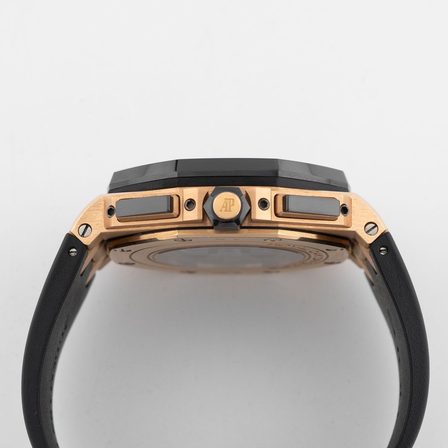 Die Royal Oak Offshore Chronograph 26401RO.OO.A002CA.01 aus dem Jahr 2013 präsentiert sich als markante, kraftvolle Interpretation der ikonischen Offshore-Linie und verbindet modernste Uhrmacherkunst mit der charakteristischen, sportlich-luxuriösen DNA von Audemars Piguet. Das Gehäuse aus Roségold setzt dank seiner satinierten und polierten Flächen ein beeindruckendes Spiel aus Licht und Struktur, während die schwarze Keramiklünette den sportlichen Charakter des Modells mit einer robusten, zeitgemäßen Note hervorhebt. Das schwarze „Méga Tapisserie“-Zifferblatt bietet eine eindrucksvolle Tiefe und trägt mit seinen kontrastierenden roségoldenen Zeigern und Indizes zu einer kraftvollen, gut ausbalancierten Ästhetik bei. Die harmonisch integrierten Totalisatoren unterstreichen die technische Präzision des Chronographen und verleihen dem Zifferblatt eine moderne, dynamische Wirkung. Das schwarze Kautschukarmband greift die sportliche Ausrichtung der Uhr auf und sorgt zugleich für hohen Tragekomfort, während es dem Roségoldgehäuse einen deutlichen, eleganten Kontrast entgegensetzt. Insgesamt tritt die Royal Oak Offshore 26401RO als ein Zeitmesser auf, der luxuriöse Präsenz, entschlossene Sportlichkeit und markantes Design in einer eindrucksvollen Form vereint. Bitte beachten Sie, dass die Auslieferung bis zu 20 Werktage betragen kann. Sie erhalten 1 Jahr Gewährleistung auf die Funktion des Uhrwerks.