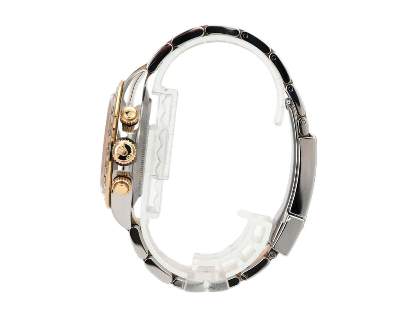 Caixa de 40 mm em aço inoxidável polido e acetinado, bezel em ouro amarelo de 18 kt polido com escala taquimétrica, bracelete Oyster em aço inoxidável / ouro amarelo de 18 kt polido e acetinado com fecho de segurança dobrável, mostrador branco com marcadores luminosos, ponteiros luminosos, automático, calibre 4130 da manufatura Rolex, 44 rubis, reserva de marcha de aproximadamente 72 horas, cronômetro, vidro de safira, coroa rosqueada com proteção lateral, fundo rosqueado em aço inoxidável, resistente à água até 10 bar.