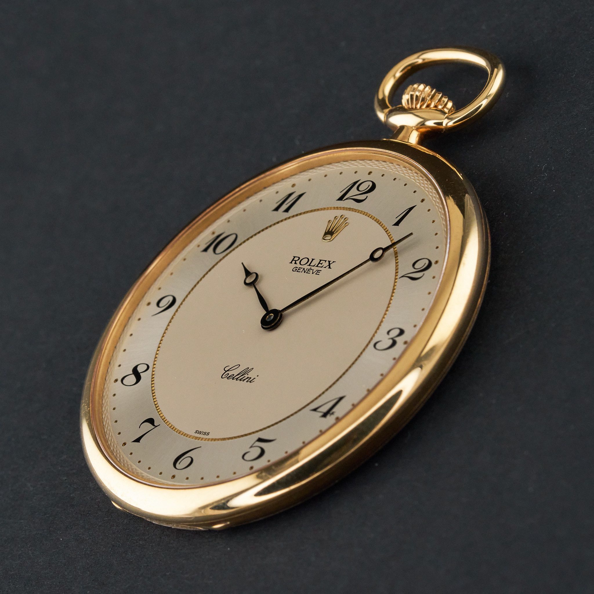 This Rolex Cellini Pocket Watch 3761 features a Silver Arabic dial and is crafted from 18K yellow gold, with a production year of 1995.Case No: W04XXXX