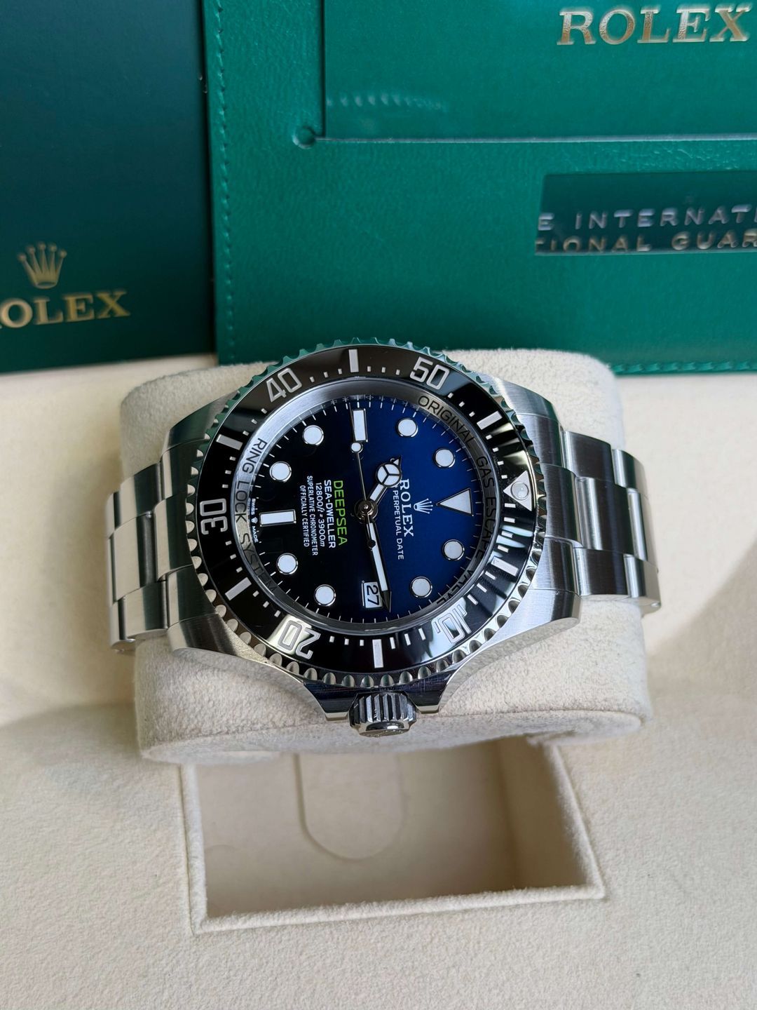 A caixa de 44 mm em Oystersteel com sistema Ringlock foi projetada para profundidades extremas de até 3.900 m, equipada com o icônico mostrador em gradiente D-Blue que vai do azul ao preto em homenagem à mergulho de James Cameron no fundo da Fossa das Marianas. Essa gradação de cores dá ao relógio uma profundidade visual impressionante e o torna imediatamente reconhecível dentro da família Deepsea.