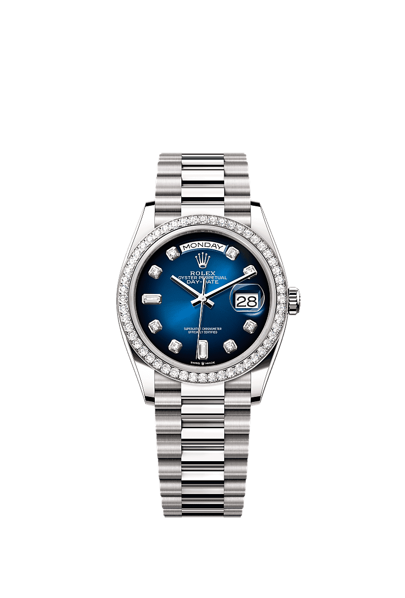 Rolex 128349RBR-0010 Day-Date 36 Ouro Branco / Diamante / Azul Ombré-Diamante / Presidente
