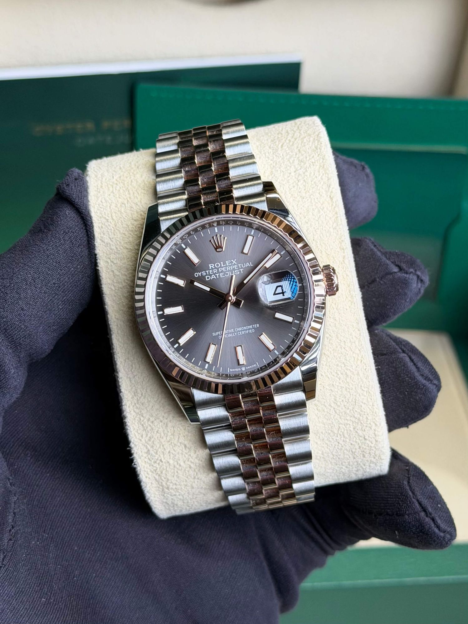 O Rolex Datejust 36 ref. 126231‑0013 com mostrador de ródio escuro, Everose Rolesor e pulseira Jubilee é um relógio elegante e versátil que combina características clássicas da Rolex com uma aparência moderna. A caixa Oystersteel de 36 mm, combinada com o calor do ouro Everose de 18 kt, oferece uma bela estética bicolor e luxo atemporal. O mostrador de ródio escuro com efeito sunburst capta a luz de maneira sutil e muda de tons de cinza, adicionando profundidade e caráter ao relógio. No pulso, está a icônica e confortável pulseira Jubilee que se encaixa perfeitamente na luneta fluted de ouro Everose. O movimento Calibre 3235 oferece cerca de 70 horas de reserva de marcha, uma indicação de data precisa com lente cyclops e resistência à água até 100 m, tornando este modelo tanto elegante quanto prático. Uma escolha estilosa para quem deseja usar um Datejust refinado com um toque de cor sutil e distinto que combina com qualquer ocasião.