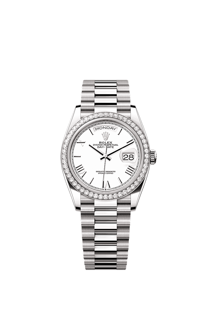 Rolex 128349RBR-0043 - Day-Date 36 White Gold - Diamond / White - Roman / President