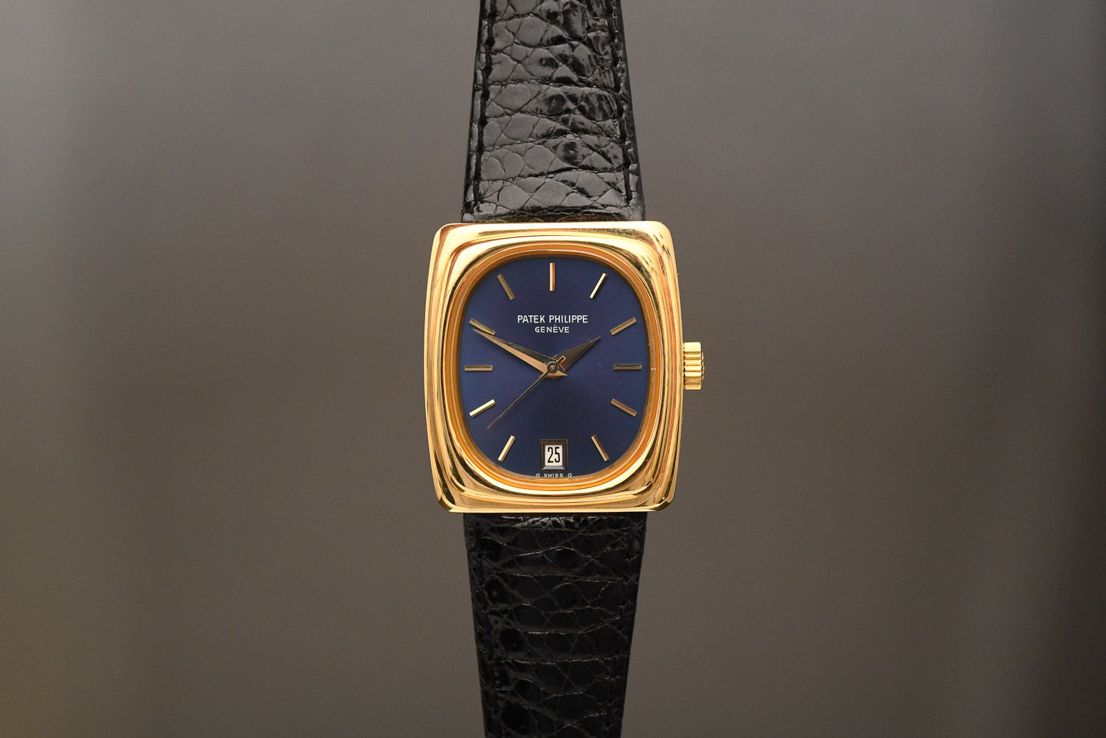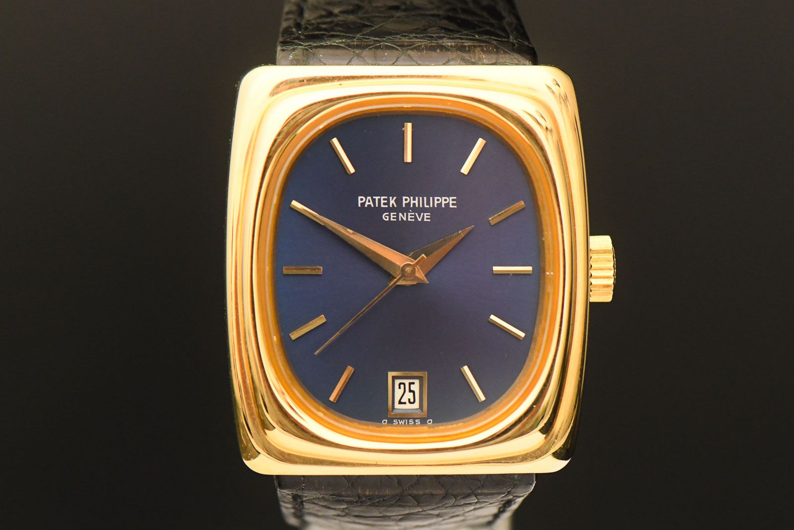 Patek Philippe 1985 Beta 21 as full Set in TOP condition. Patek Philippe Beta 21 – A rare piece of watchmaking history. This time, we are presenting an exceptionally rare collector’s item: a Patek Philippe with the Beta 21 calibre. It is estimated that Patek Philippe produced only about 500 pieces with this movement, spread across the references 3603 and 3587. Historical background The Beta 21 was the result of a visionary development in the early 1960s. At the Centre Electronique Horologer (CEH), renowned brands such as Rolex and Patek Philippe worked together on the future of timekeeping. By the end of the 1960s, only around 6,000 of these Beta 21 movements had been produced. Technically, they were almost identical and differed only in minor details depending on the brand. Details about this particular model This watch captivates with its striking, stepped yellow gold case. The angular edges form a striking contrast to the oval, elliptical dial opening. Dial: The blue dial is in fantastic condition. The white lettering is razor sharp. The Sigma markings at the bottom confirm that the hour markers are made of solid gold. Condition & accessories: The watch comes with the original leather strap and a Patek Philippe yellow gold pin buckle. Our watchmaker has fully checked the movement and fitted it with a new battery. Provenance: A real highlight is the complete history. The watch was first sold in Linz in 1985 and came directly to us via an intermediate stop. The set is complete: it includes the original box and the original certificate with the matching movement number.