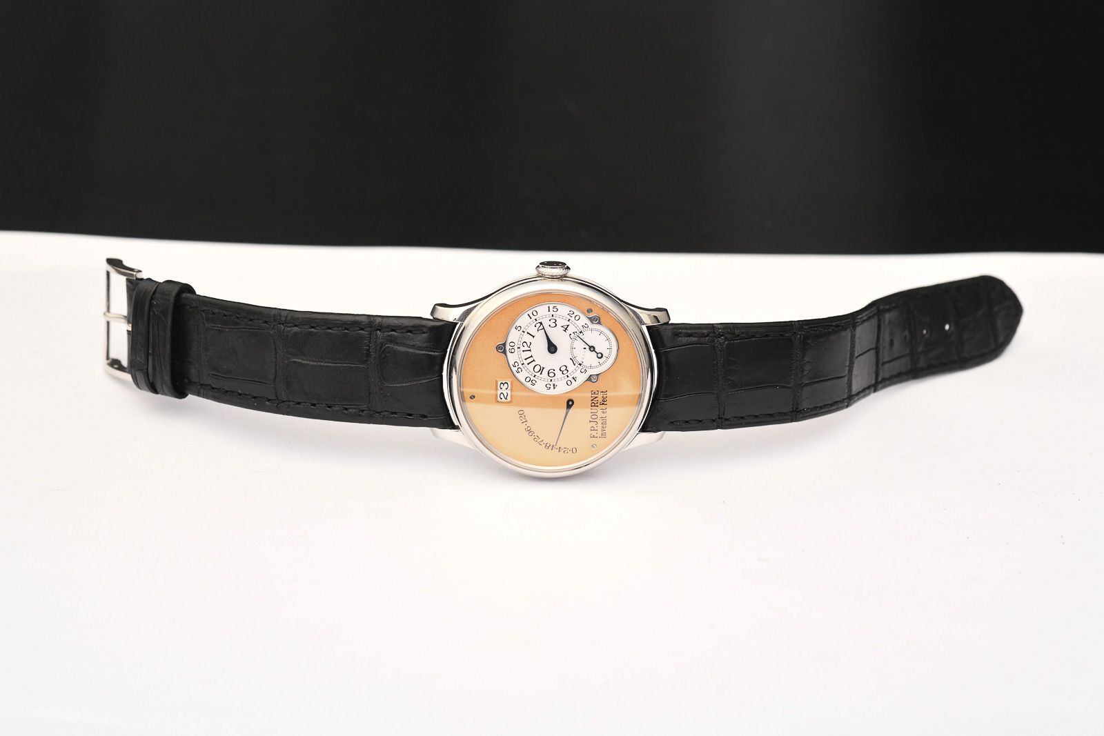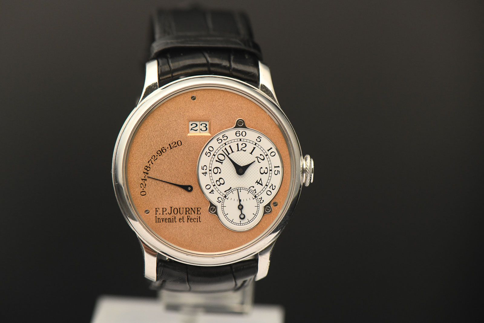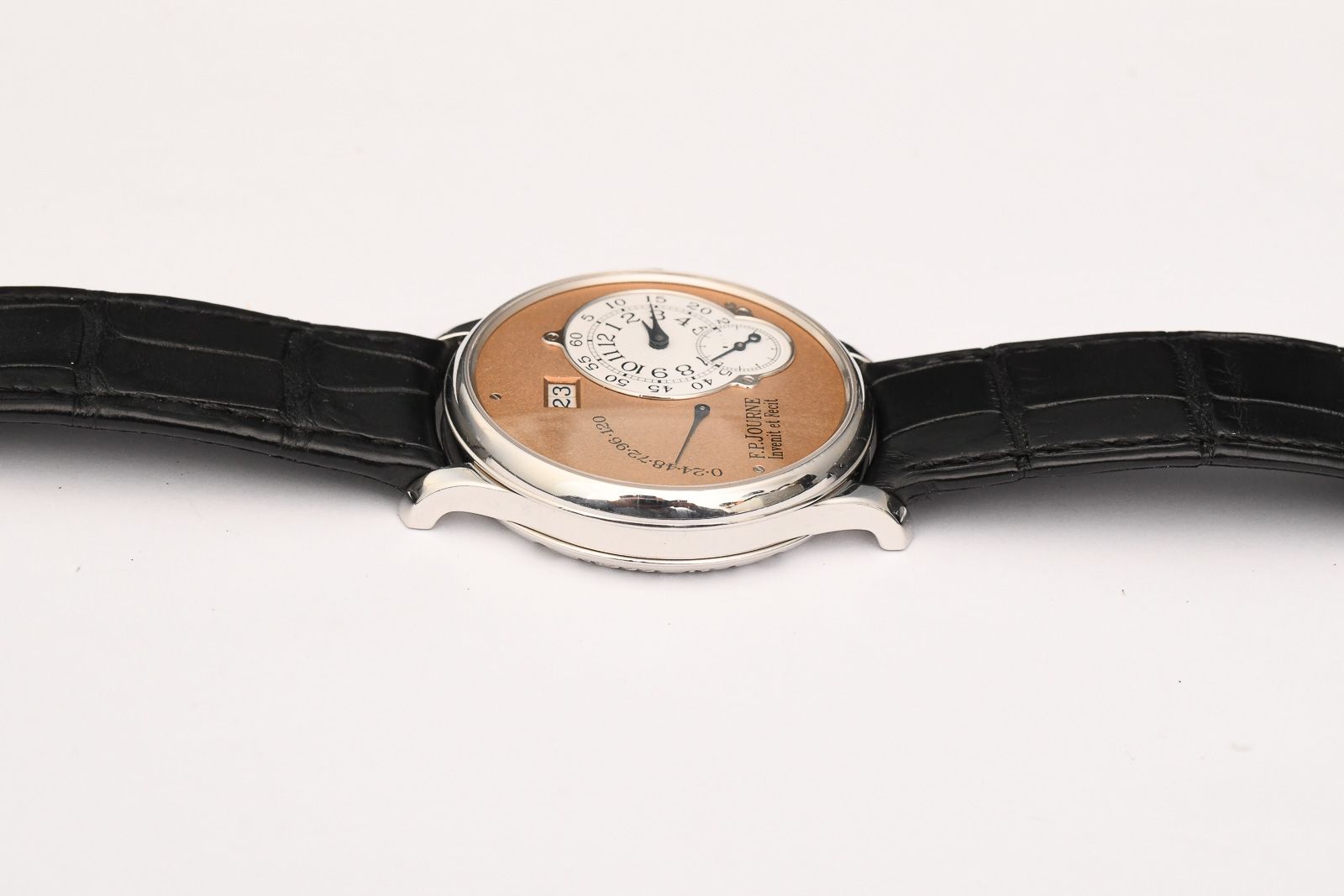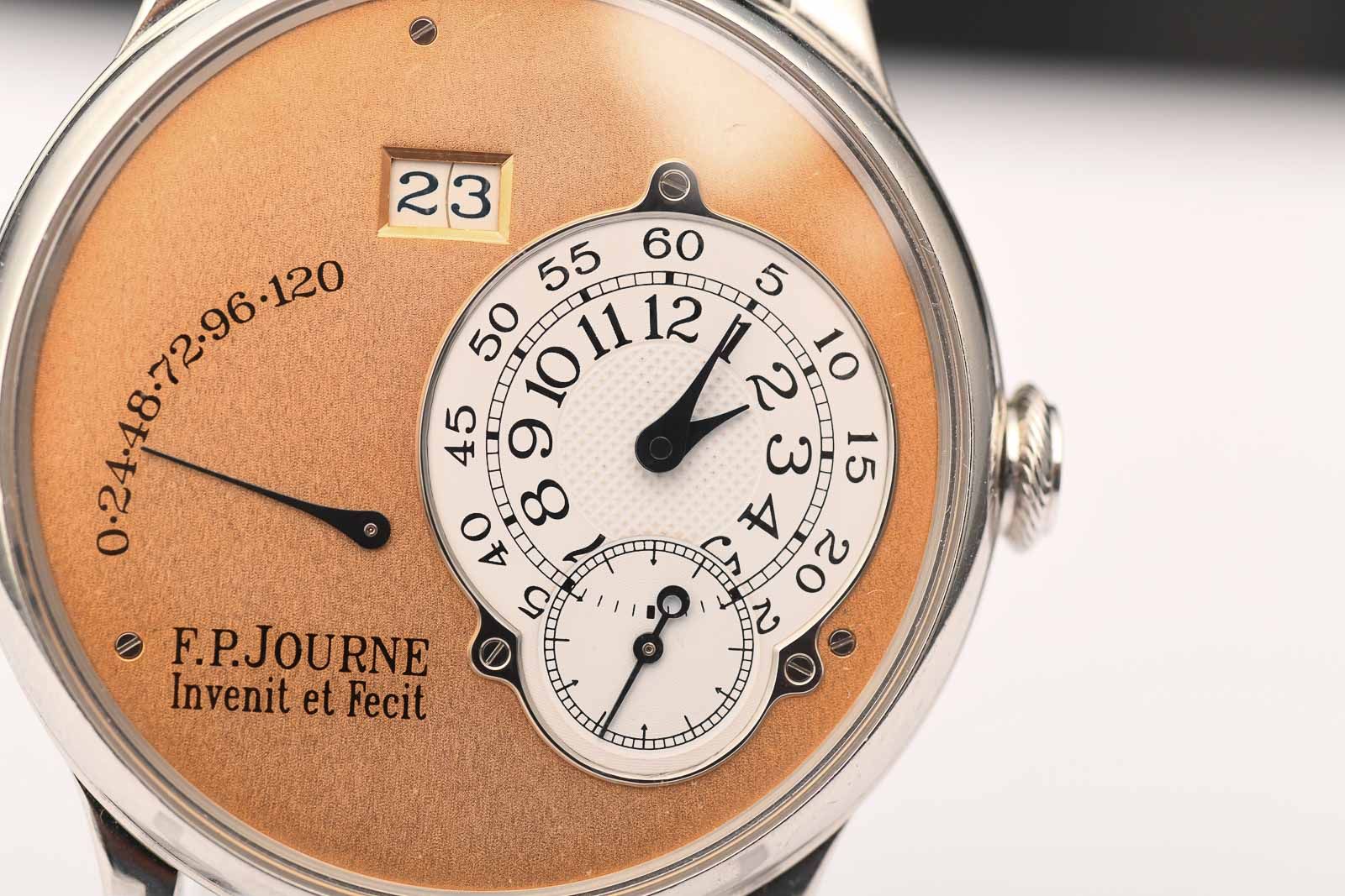 F.P. Jouren Octa 2002 Cassique Reserve de Marche Platin/Salmon. We are pleased to offer you an exceedingly rare F.P. Journe from the Classique Collection; it is a model from the Octa Réserve de Marche series. Featuring a 38mm platinum case and a breathtaking rose gold dial, this watch was arguably chosen in the finest possible configuration available at the time. In early F.P. Journe pieces such as this one, the Calibre 1300 movement was crafted with brass plates. These watches are significantly more popular among collectors and are therefore valued higher than subsequent models. This particular piece belongs to the 02A series, dating from the 2002 model year. The watch is accompanied by its original box and an F.P. Journe certificate issued in 2023, confirming the watch’s current configuration and authenticity.