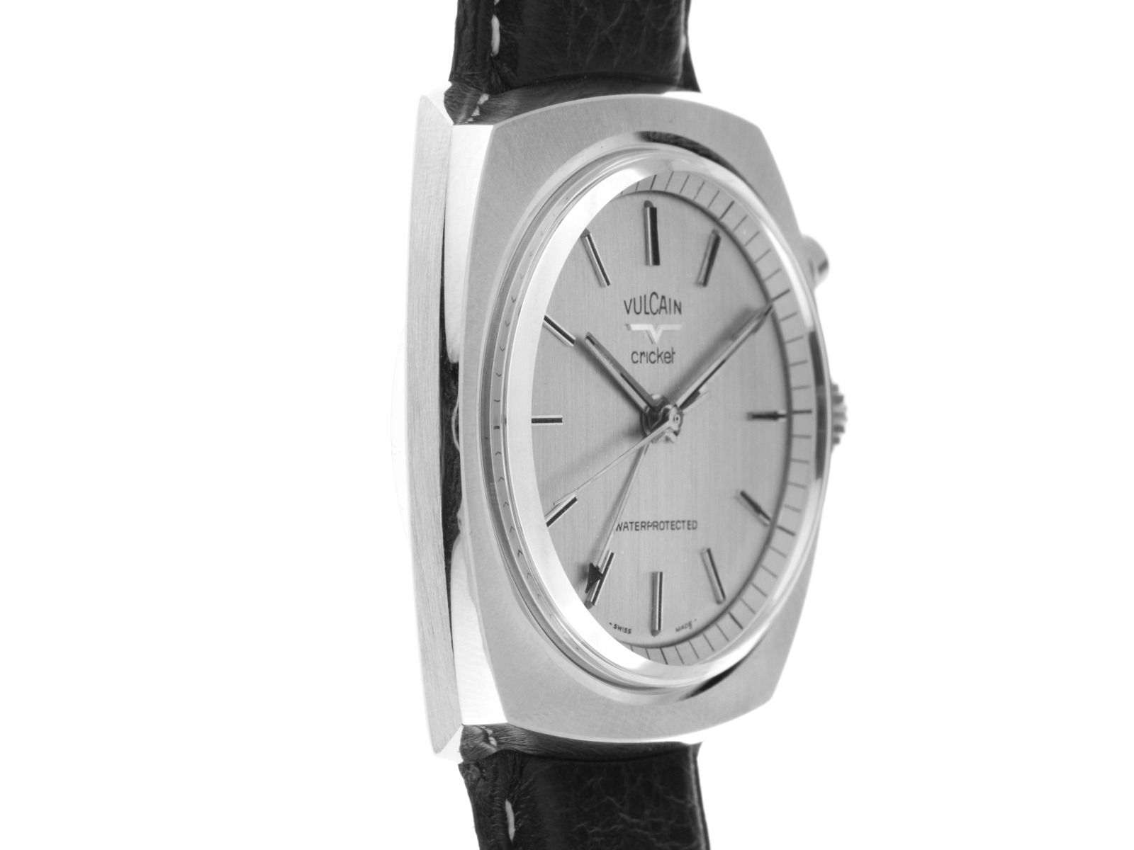 Vulcain Cricket Stahl Handaufzug Wecker Armband LederGehäuse Edelstahl satiniert, Gehäusemaße ohne Krone (L x B x H) 40 x 38 x 11,0mm. Armband Leder schwarz, Anstoßbreite 22mm, Stiftschließe Edelstahl. Zifferblatt silberfarben mit aufgesetzten Indexen und Edelstahl Zeigern. Uhrwerk Handaufzug, Weckerfunktion, Kaliber MSR S2 mit 17 Edelsteinen. Anzeige von Stunde, Minute und Sekunde über Zeiger aus der Mitte. Plexiglas. Krone zur Einstellung der Weckzeit mit Hersteller-Logo bei 2 Uhr, Krone zur Einstellung der Uhrzeit bei 3 Uhr. Boden Edelstahl verschraubt und graviert. Gewicht der Uhr inklusive Armband 66g. Referenznummer: S2326B, Gehäusenummer: 929058/93XXX, Baujahr: 1970, ID: KT157920000925H-3400, Artikelnummer: 10000081857. Mit Gangkontrolle und kompletter äußerlicher Aufarbeitung von September 2025. Mit Watchregister Auszug von September 2025, The Watch Register Zertifikat / ohne Eintrag (Internationale Datenbank für verlorene oder gestohlene Uhren). Sehr guter Zustand. Lieferzeit sofort.