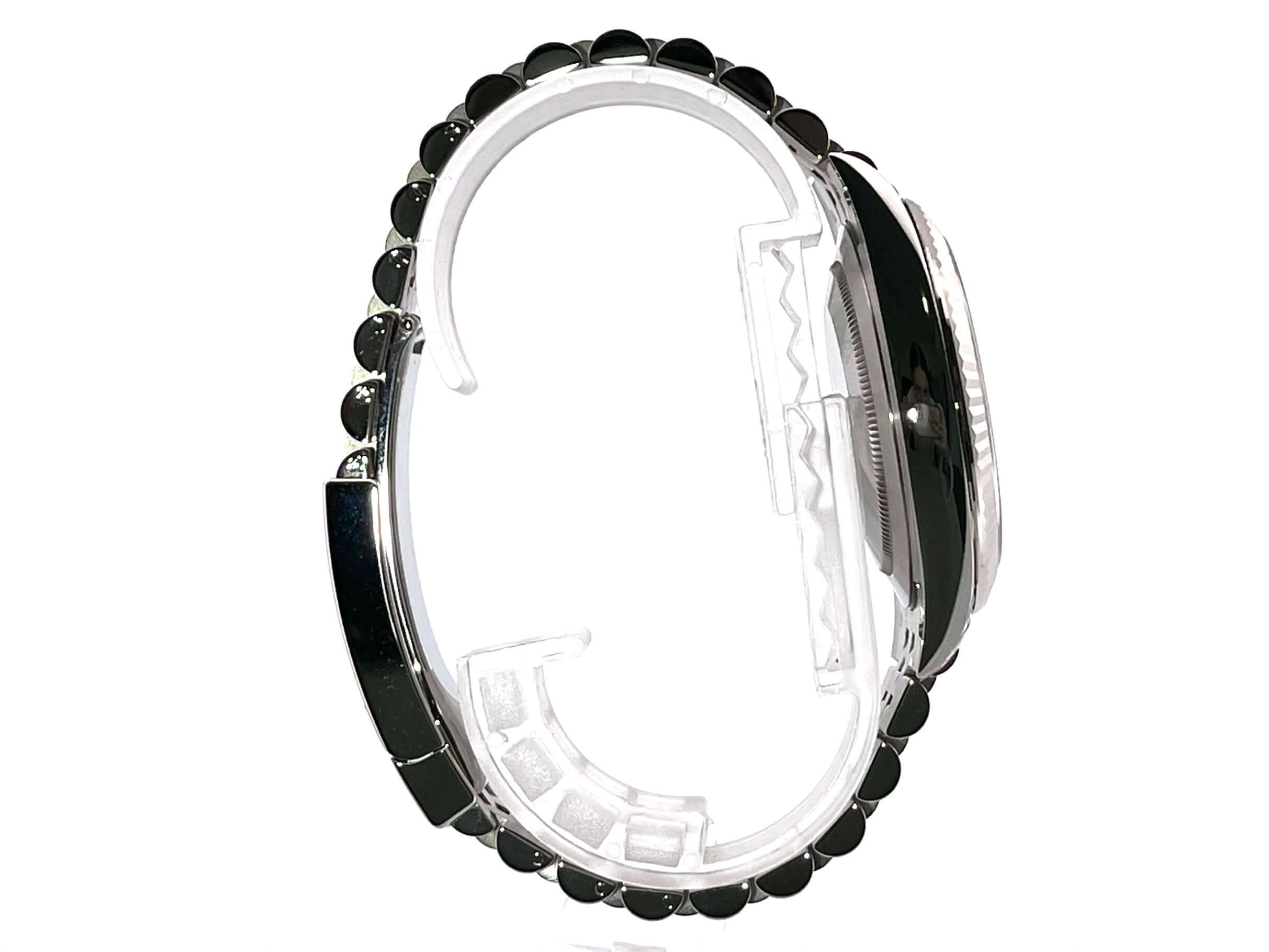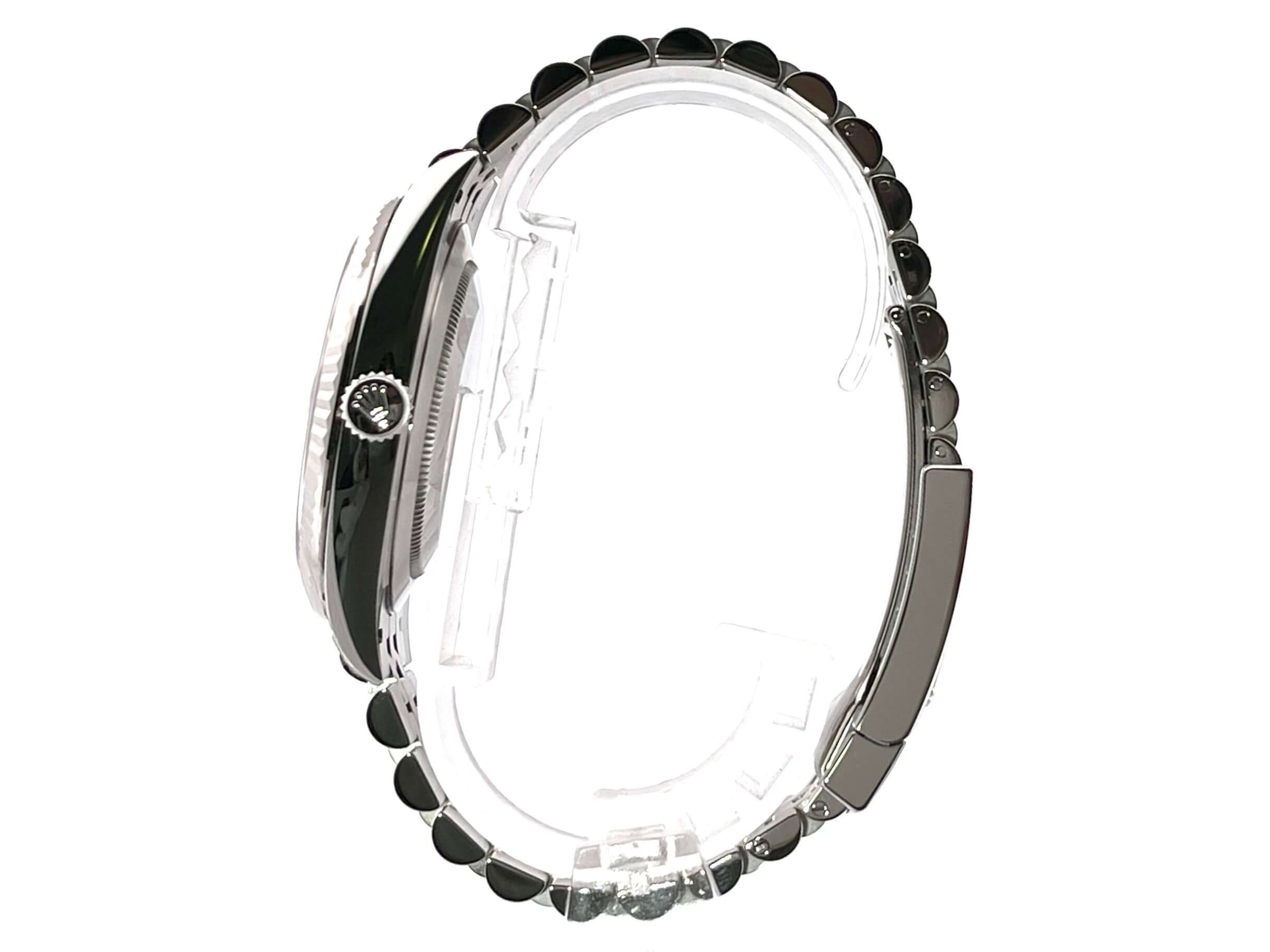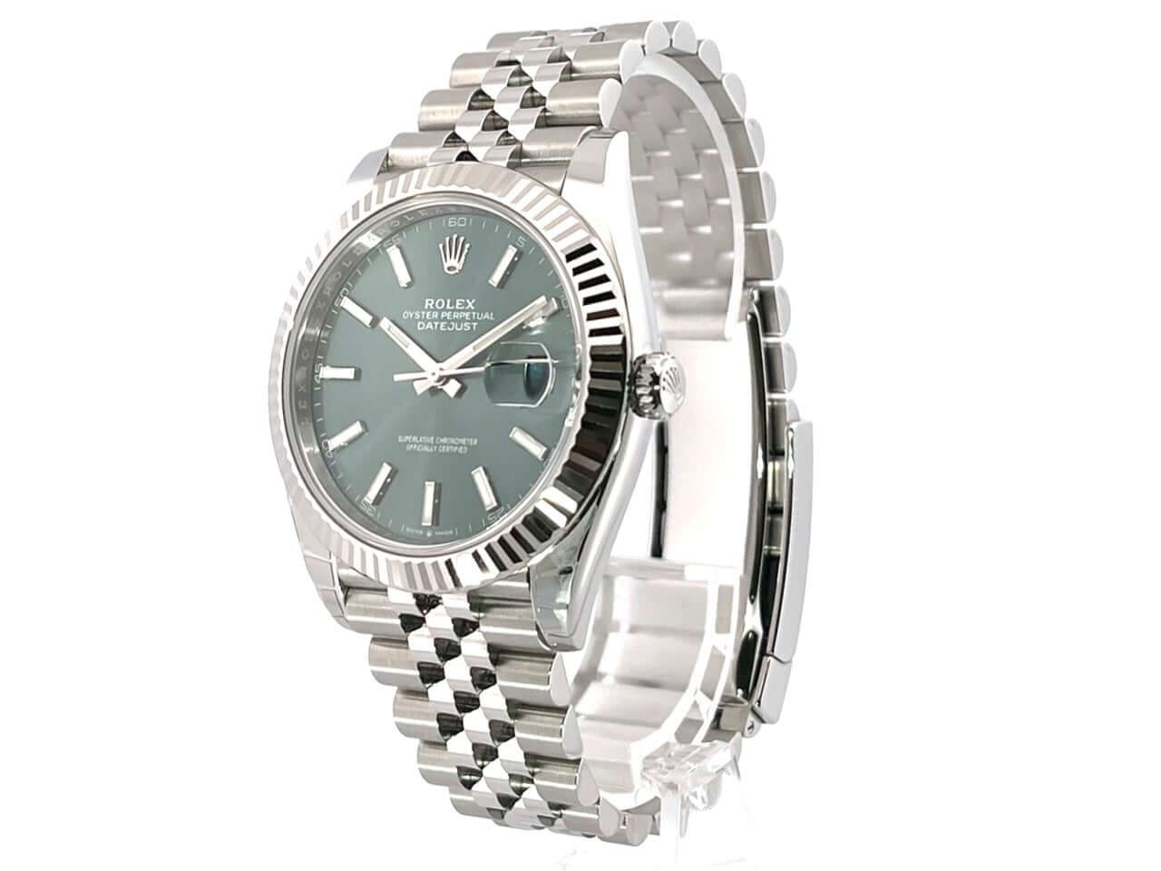 Rolex Datejust 41 Stainless Steel White Gold 126334 Mint Green Jubilee BraceletCase made of polished and satin-finished stainless steel, case diameter 41 mm, fluted 18 kt white gold bezel, Jubilee bracelet made of polished and satin-finished stainless steel with folding clasp, mint green dial with 18 kt white gold luminous indices, luminous hands, automatic movement, Rolex manufacture caliber 3235, chronometer, 70-hour power reserve, date display, scratch-resistant sapphire crystal, screw-down crown, screwed stainless steel case back, water-resistant up to 10 bar.