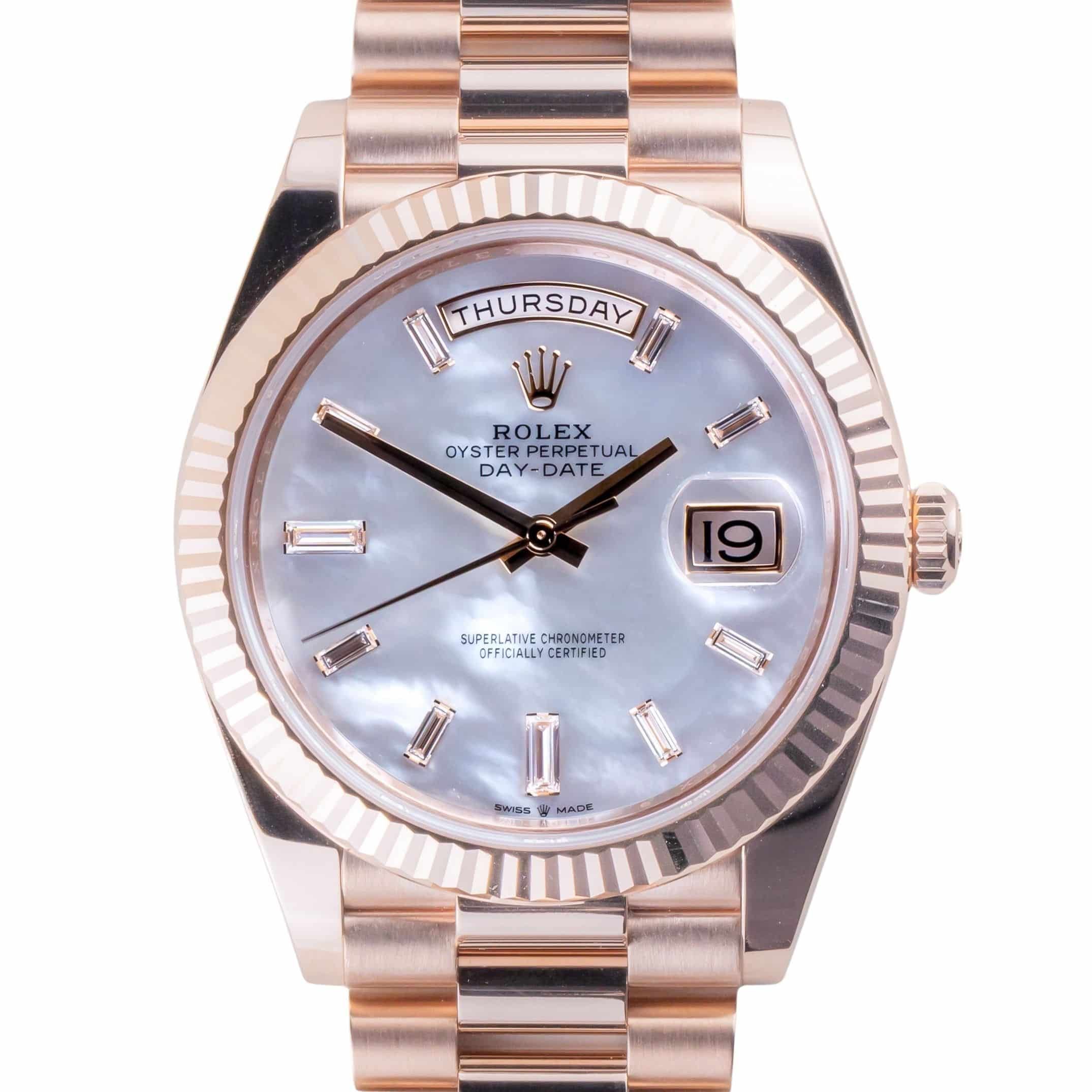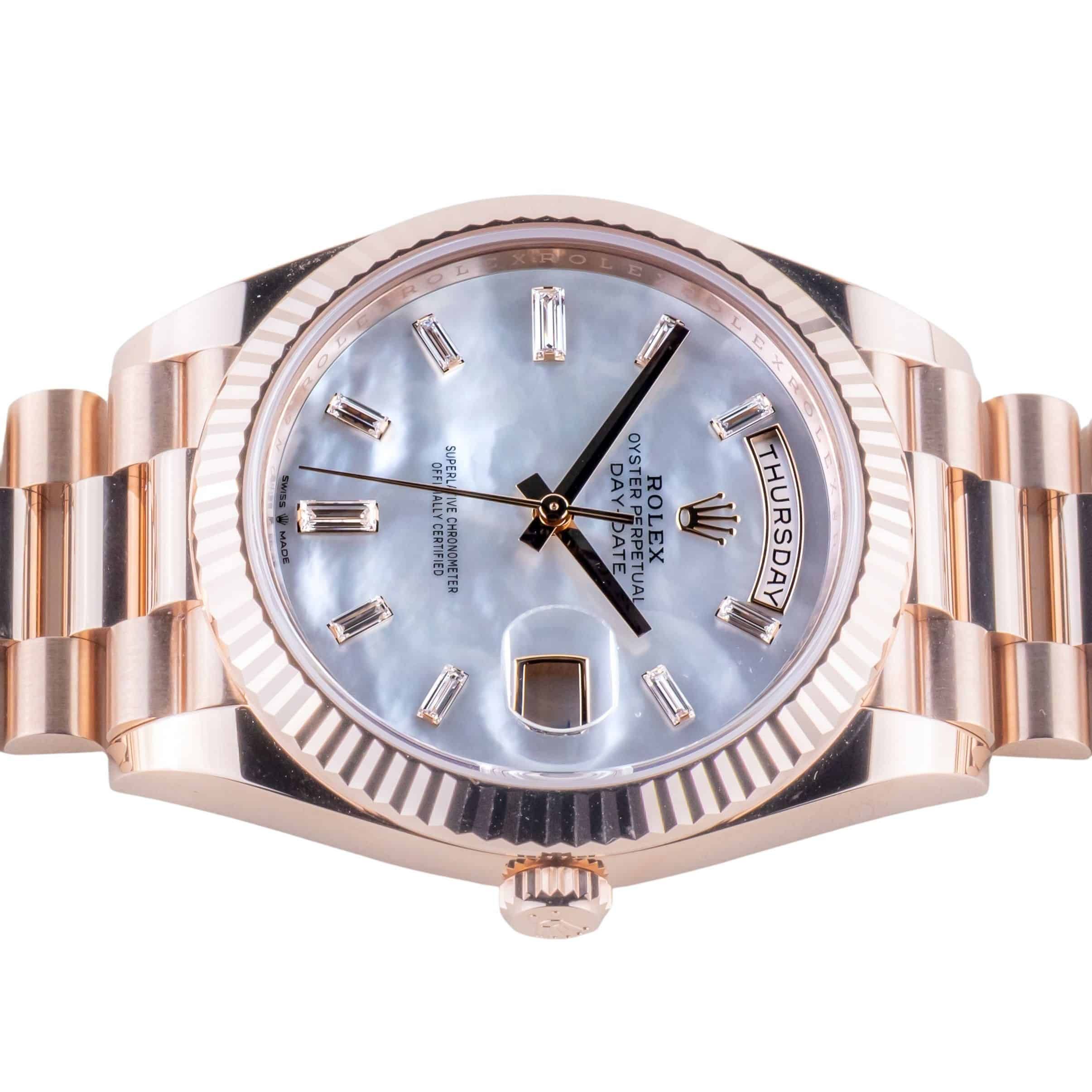 NEW Rolex Day-Date Reference 228235 from 2026 including full set. The Day-Date 228235 measures a 40mm 18k rose gold case, a 18k rosegold President bracelet with Crownclasp and fluted 18k rosegold bezel. The Day-Date 228235 features an automatic movement caliber 3255 with a double quickset date and day function, a scratch resistance sapphire crystal and a MOP dial with Baguette hour markers.