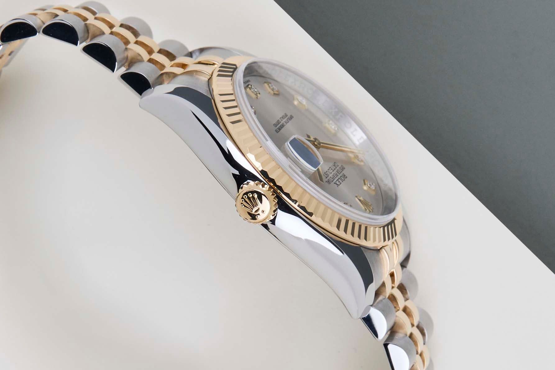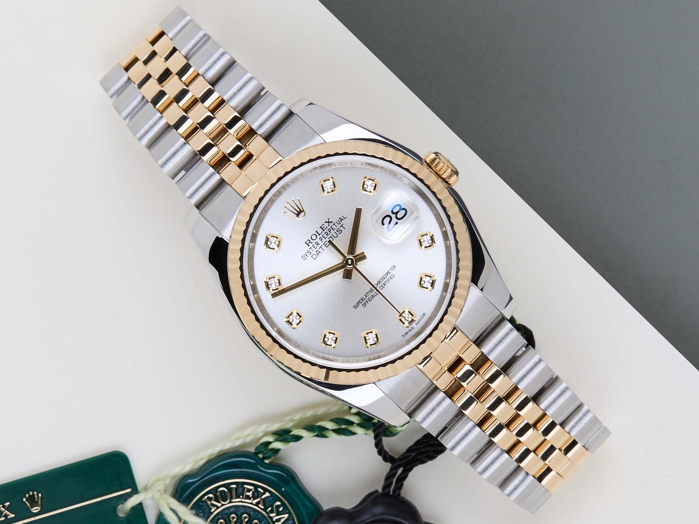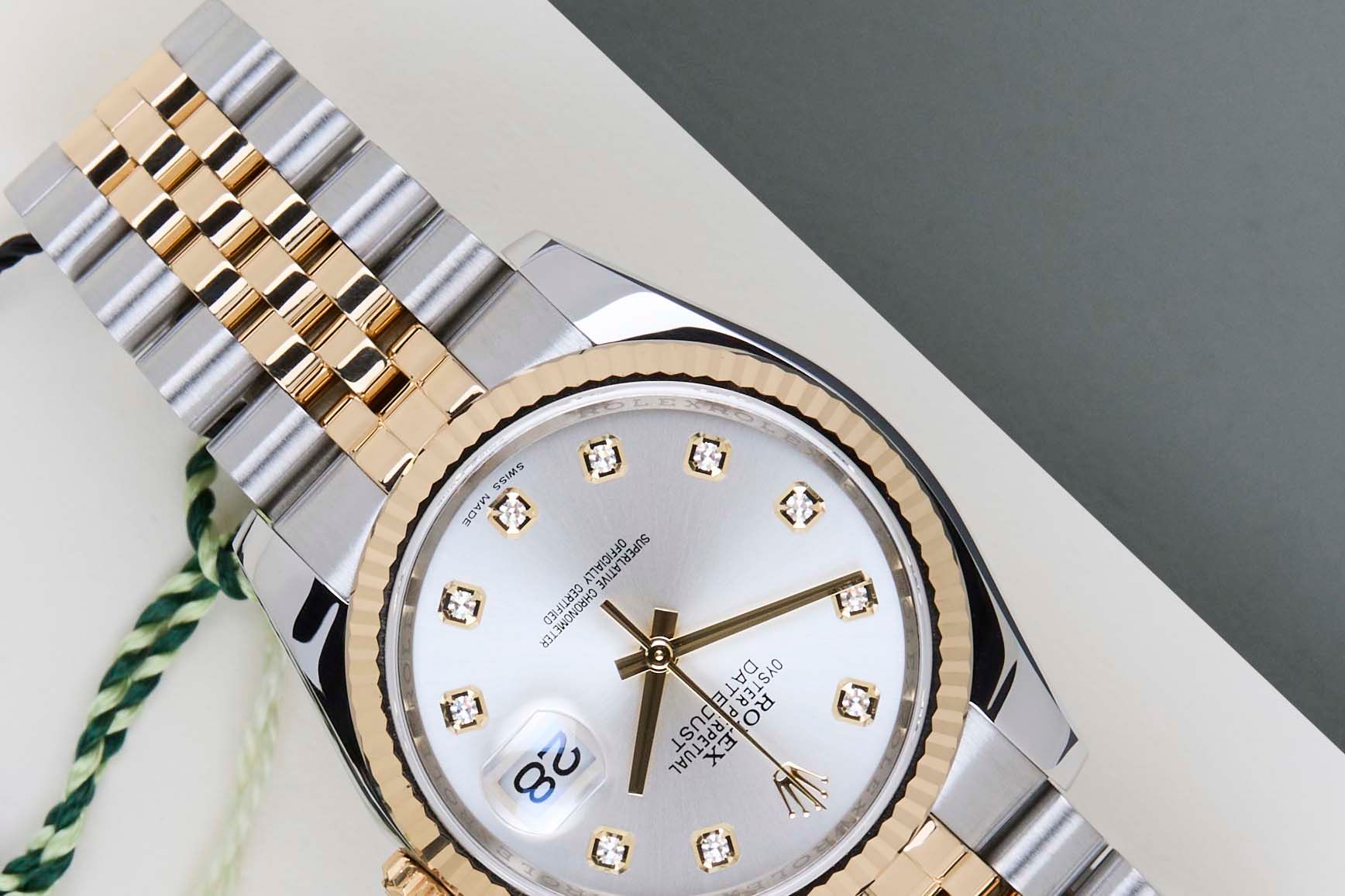 Full Set | Including Rolex Green TagRolex introduced the original Datejust in 1945 to celebrate the company's 40th anniversary. Due to the various case sizes and materials, the Datejust has been ingrained in Rolex's history and remains incredibly popular for 75 years.This Rolex Datejust 'Silver Diamond Dial' was sold for the first time in October 2015.This Datejust is made of a combination of 18k Yellow Gold and stainless steel and is fitted with a Jubilee bracelet which conceals the Crownclasp. The timepiece features a Silver Dial.This Rolex Datejust 36 is in Mint condition and comes with the original Rolex Warranty Papers and Box. Furthermore, the watch has been serviced by our watchmaker, and therefore it comes with one year of warranty.