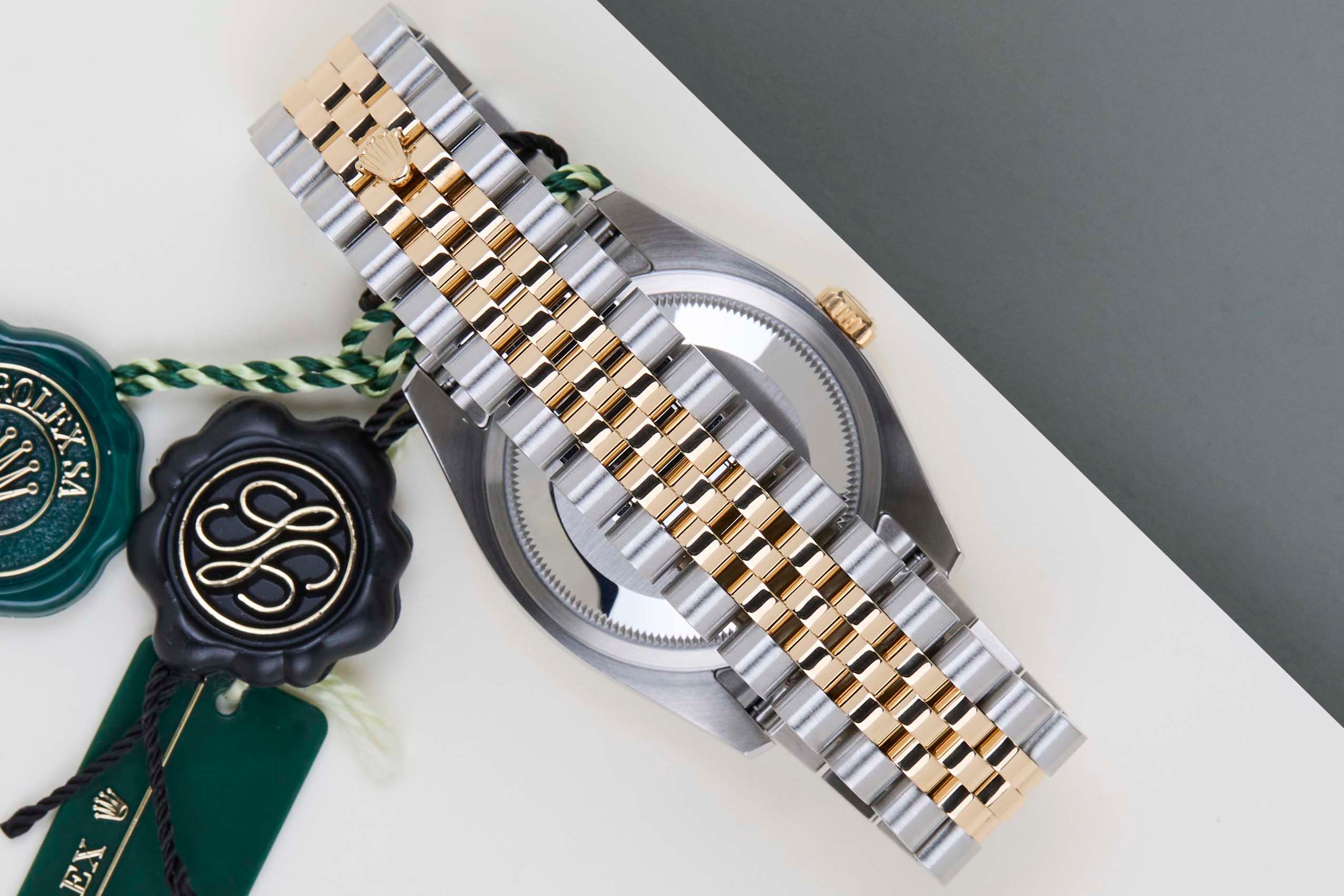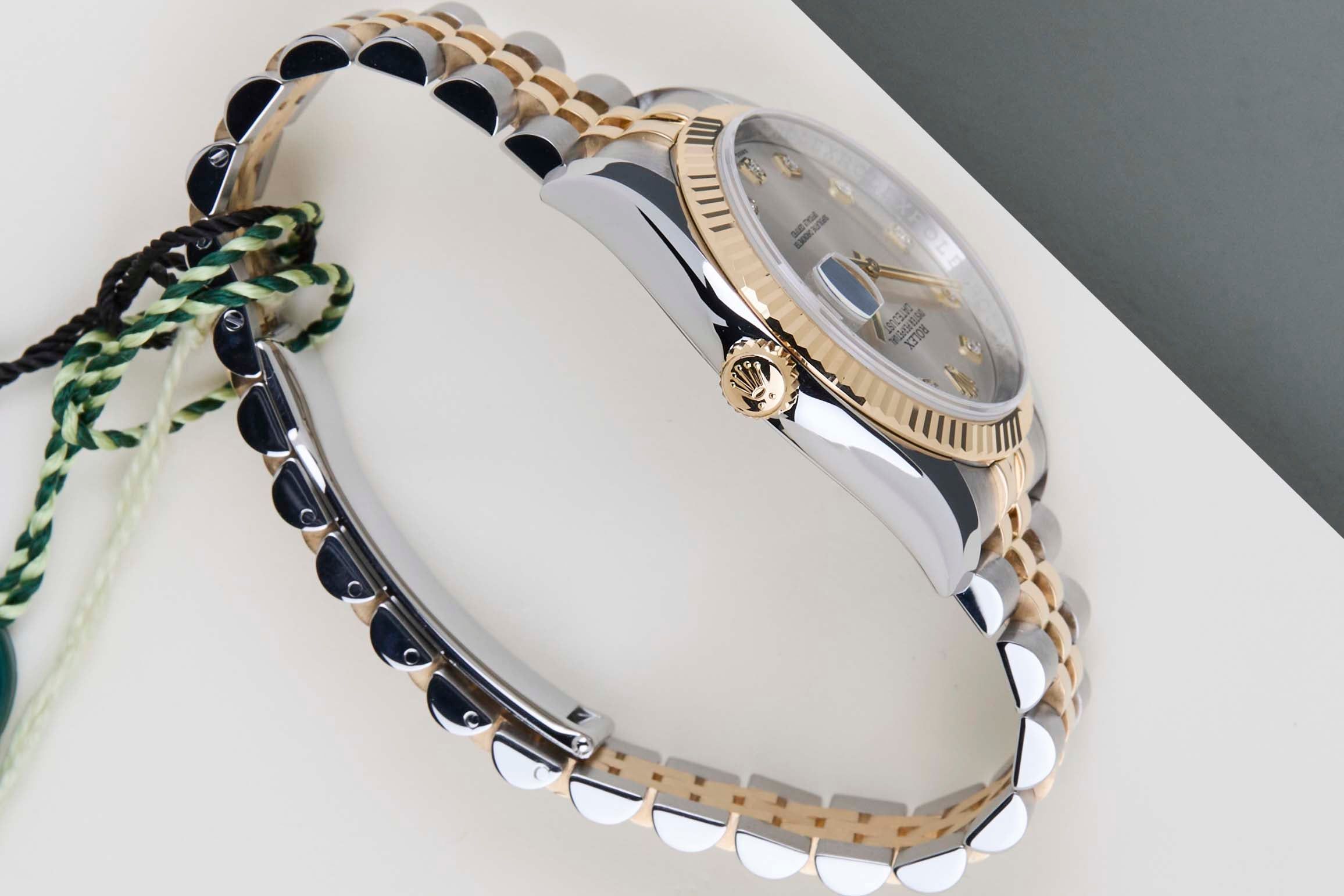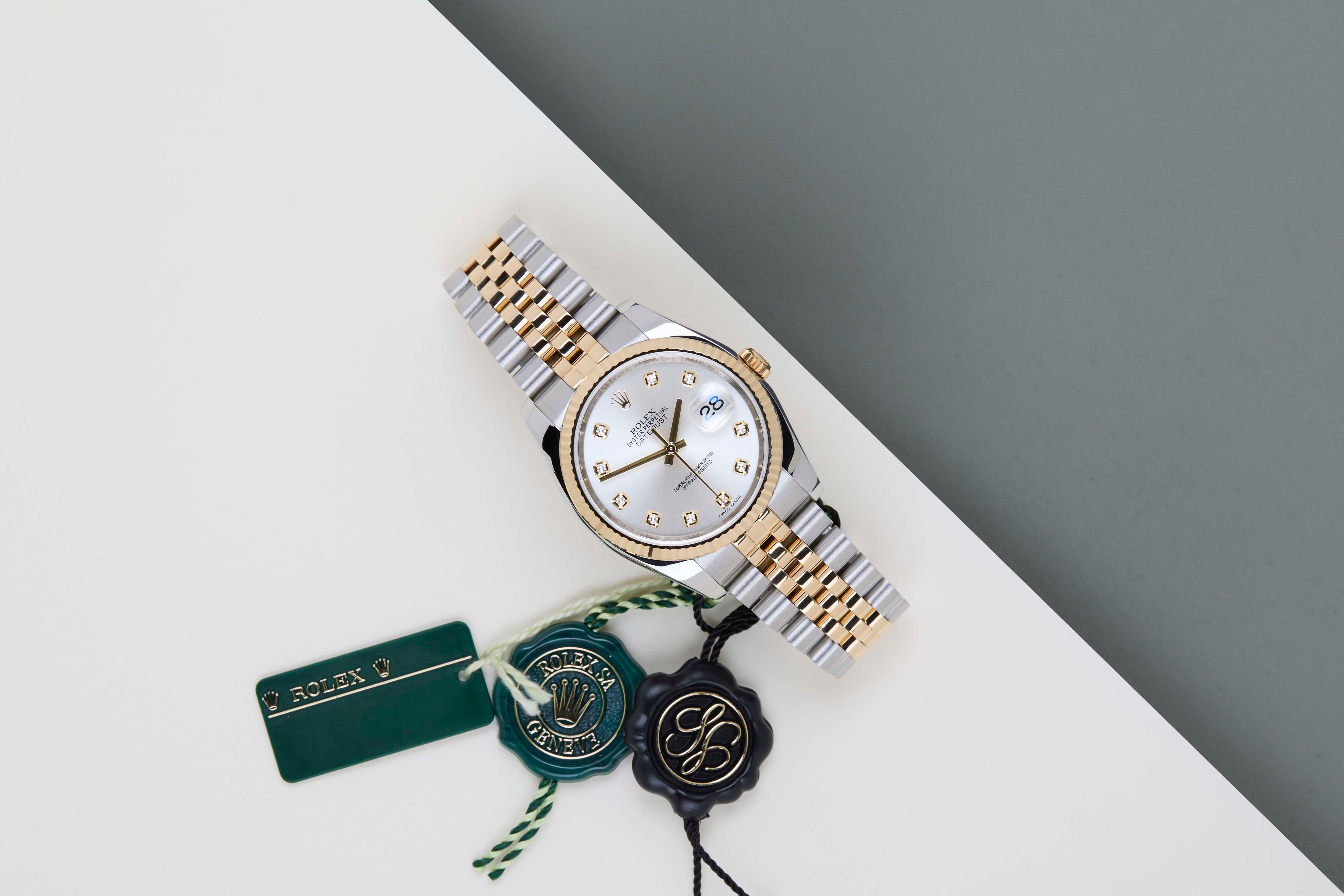 Full Set | Including Rolex Green TagRolex introduced the original Datejust in 1945 to celebrate the company's 40th anniversary. Due to the various case sizes and materials, the Datejust has been ingrained in Rolex's history and remains incredibly popular for 75 years.This Rolex Datejust 'Silver Diamond Dial' was sold for the first time in October 2015.This Datejust is made of a combination of 18k Yellow Gold and stainless steel and is fitted with a Jubilee bracelet which conceals the Crownclasp. The timepiece features a Silver Dial.This Rolex Datejust 36 is in Mint condition and comes with the original Rolex Warranty Papers and Box. Furthermore, the watch has been serviced by our watchmaker, and therefore it comes with one year of warranty.