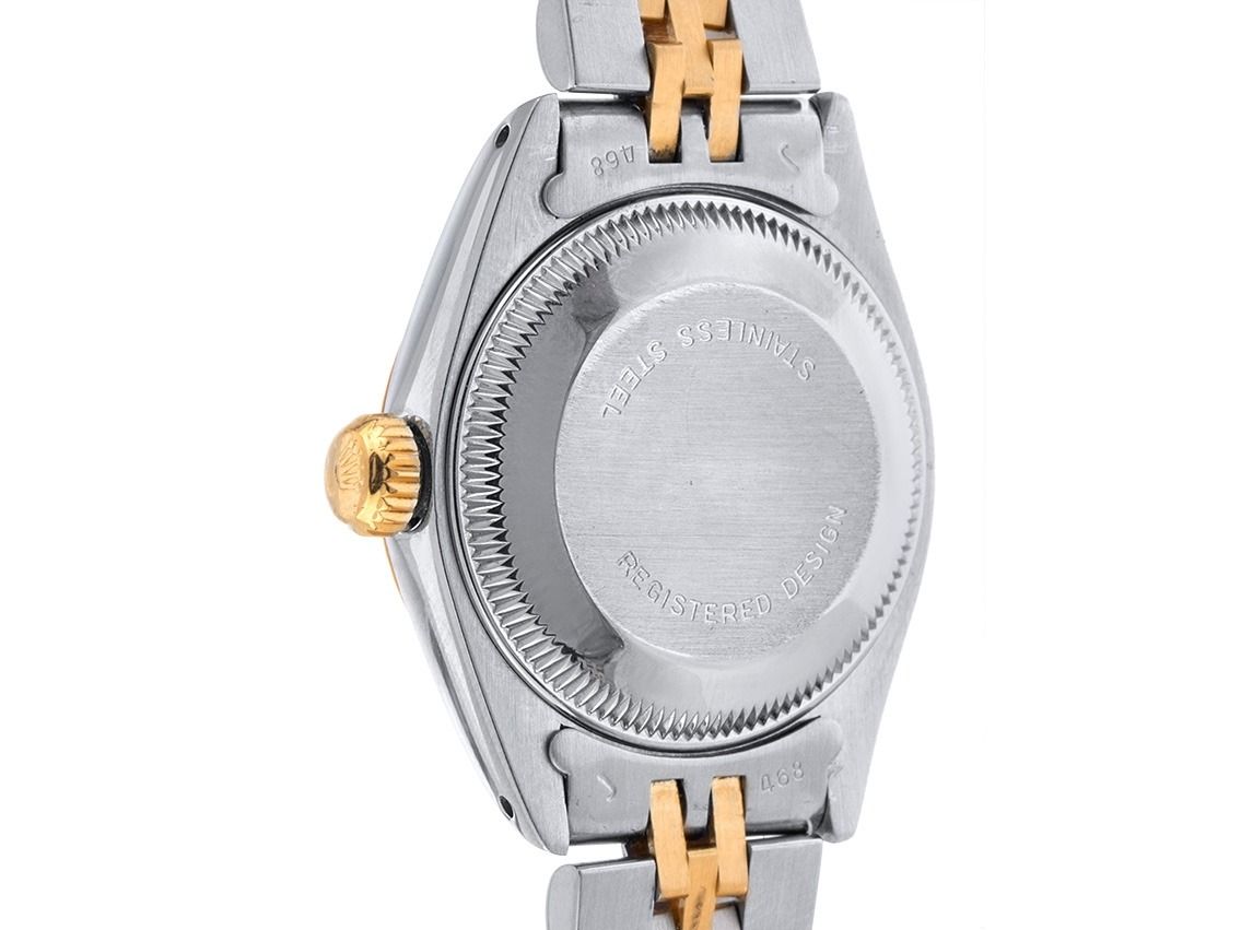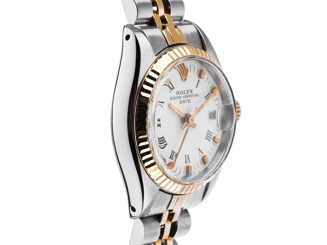 Rolex Oyster Perpetual Date Lady Stahl 18kt Gelbgold Automatik Armband JubiléGehäuse Edelstahl poliert und satiniert, Gehäusedurchmesser ohne Krone 26mm, Gehäusehöhe 10,9mm. Lünette 18kt Gelbgold geriffelt und poliert. Armband Jubilé Edelstahl / 18kt Gelbgold poliert und satiniert, Faltschließe Edelstahl mit Hersteller-Logo. Zifferblatt weiß mit aufgesetzten gelbgoldenen Indexen und gelbgoldenen Zeigern. Uhrwerk Automatik, Chronometer mit Zeugnis, Rolex Manufakturkaliber 2030 mit 28 Edelsteinen. Anzeige von Stunde, Minute und Sekunde über Zeiger aus der Mitte mit Sekundenstopp zur sekundengenauen Einstellung der Uhrzeit, Datumsanzeige unter Glaslupe bei 3 Uhr, open 6/9 (offene 6 und 9 in der Datumsanzeige). Plexiglas. Krone verschraubbar mit Hersteller-Logo. Boden Edelstahl verschraubt und graviert. Gewicht der Uhr inklusive Armband 51g, Länge des Armbandes inklusive Gehäuse 170mm. Referenznummer: 6917, Baujahr: 1977, Gehäusenummer: 5167XXX, ID: P247160000226H-6900, Artikelnummer: 10000084709. Mit Gangkontrolle und kompletter äußerlicher Aufarbeitung von Februar 2026. Original Rolex Box mit Umkarton und Beschreibung, Ledermäppchen, Übersetzungsheft, Rolex Chronometer-Siegel sowie Watchregister Auszug von Februar 2026, The Watch Register Zertifikat / ohne Eintrag (Internationale Datenbank für verlorene oder gestohlene Uhren). Superschnäppchen, Kapitalanlage mit Wertsteigerungspotential, extrem seltenes Sammlerstück. Sehr guter Zustand. Lieferzeit sofort.