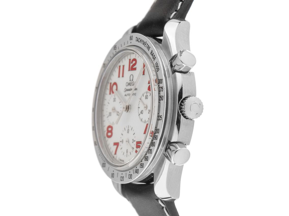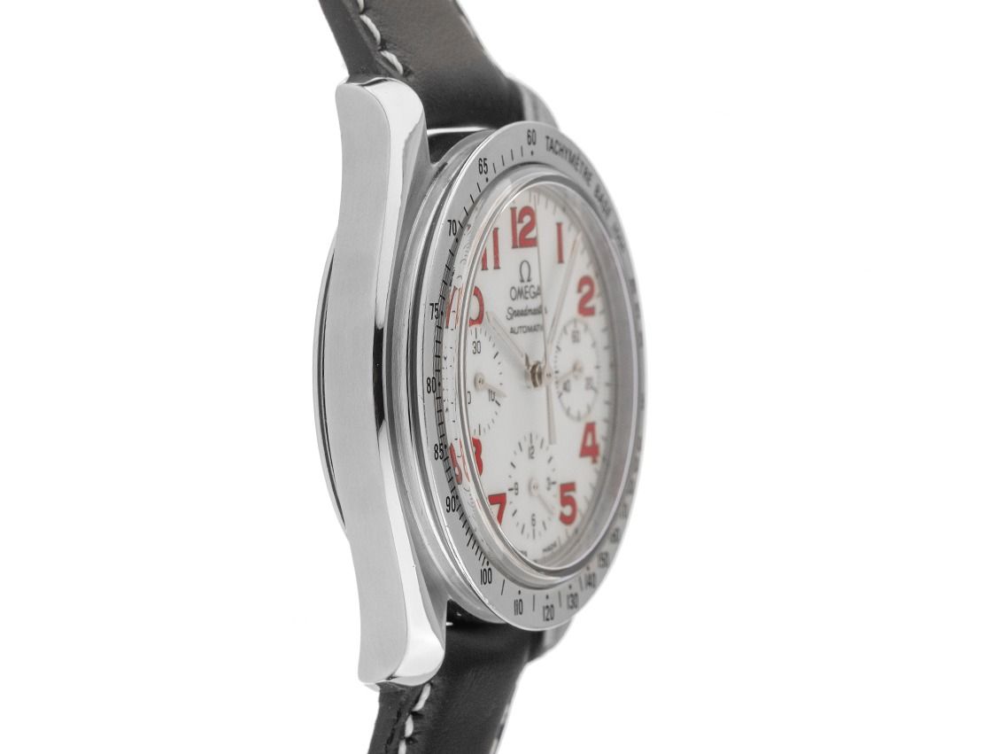 Caixa em aço polido e acetinado, diâmetro da caixa sem coroa 39mm, altura da caixa 12,6mm. Luneta em aço polido com escala taquimétrica. Pulseira de couro preto com costura clara, largura das asas 18mm, fecho de pino em aço inoxidável. Mostrador pérola claro com números árabes vermelhos e ponteiros polidos em aço inoxidável. Movimento automático, cronógrafo, cronômetro, calibre Omega manufatura 3220A com 47 pedras preciosas. Exibição de horas e minutos através de ponteiros centrais, pequeno segundo com parada de segundos para ajuste preciso da hora às 3 horas. Vidro de safira resistente a riscos. Coroa em aço inoxidável com logotipo do fabricante. Fundo em aço inoxidável gravado. Peso do relógio incluindo a pulseira 67g. Número de referência: 175.0042, número da caixa: 59800XXX, ano de fabricação: 1997, ID: P256340000226H-5800, número do artigo: 10000084886. Com controle de precisão e completa restauração externa de fevereiro de 2026. Caixa original Omega com embalagem e descrição, além de extrato do Watch Register de fevereiro de 2026, Certificado do Watch Register / sem registro (Banco de dados internacional para relógios perdidos ou roubados). Super oferta, peça de colecionador extremamente rara, quase não usada. Muito bom estado. Prazo de entrega imediato.