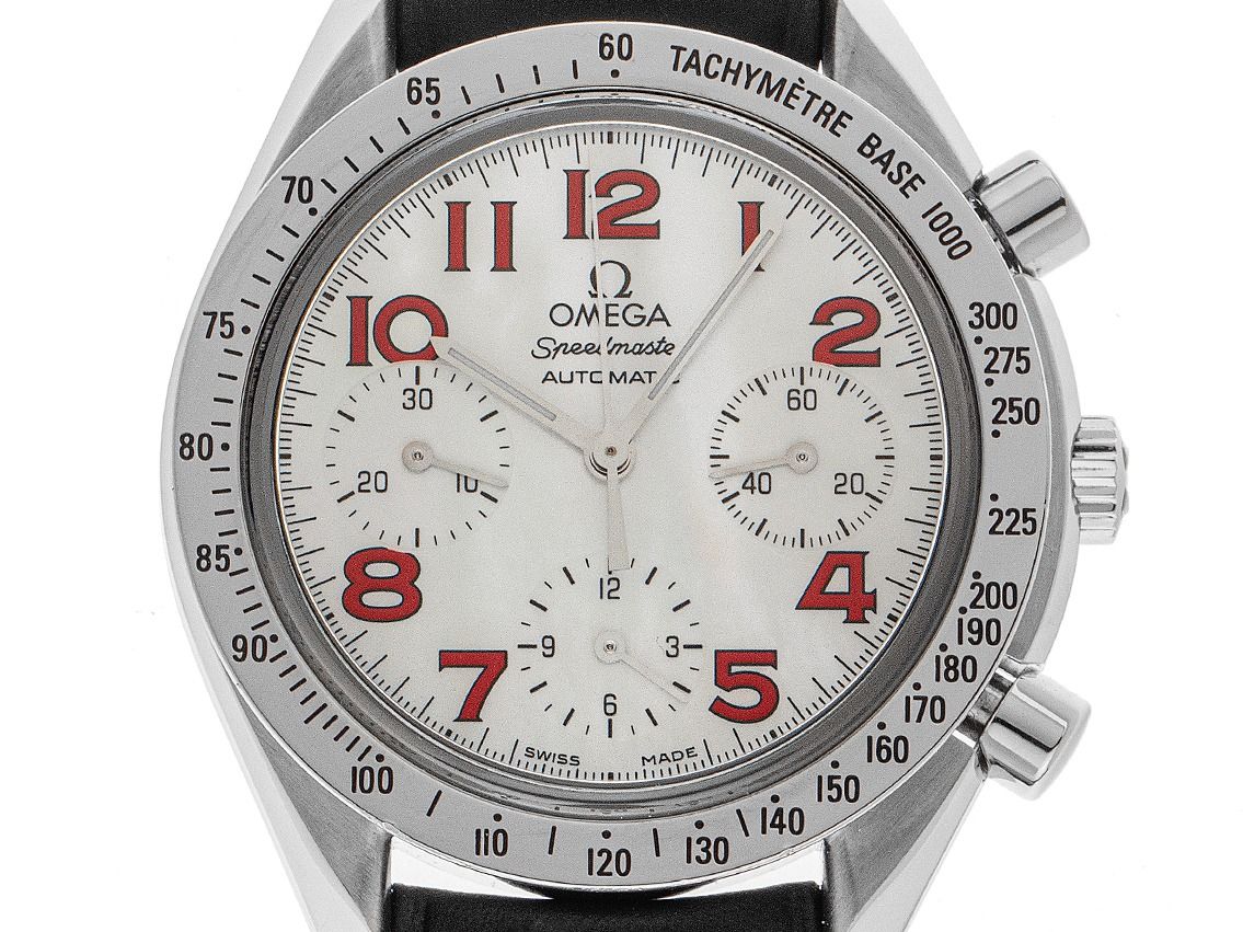 Omega Speedmaster Reduced Stahl Perlmutt Automatik Chronograph Armband LederGehäuse Edelstahl poliert und satiniert, Gehäusedurchmesser ohne Krone 39mm, Gehäusehöhe 12,6mm. Lünette Edelstahl poliert mit Tachymeterskala. Armband Leder schwarz mit heller Ziernaht, Anstoßbreite 18mm, Stiftschließe Edelstahl. Zifferblatt Perlmutt hell mit roten arabischen Ziffern und polierten Edelstahl Zeigern. Uhrwerk Automatik, Chronograph, Chronometer, Omega Manufakturkaliber 3220A mit 47 Edelsteinen. Anzeige von Stunde und Minute über Zeiger aus der Mitte, kleine Sekunde mit Sekundenstopp zur sekundengenauen Einstellung der Uhrzeit bei 3 Uhr. Saphirglas kratzfest. Krone Edelstahl mit Hersteller-Logo. Boden Edelstahl graviert. Gewicht der Uhr inklusive Armband 67g. Referenznummer: 175.0042, Gehäusenummer: 59800XXX, Baujahr: 1997, ID: P256340000226H-5800, Artikelnummer: 10000084886. Mit Gangkontrolle und kompletter äußerlicher Aufarbeitung von Februar 2026. Original Omega Box mit Umkarton und Beschreibung sowie Watchregister Auszug von Februar 2026, The Watch Register Zertifikat / ohne Eintrag (Internationale Datenbank für verlorene oder gestohlene Uhren). Superschnäppchen, extrem seltenes Sammlerstück, fast nicht getragen. Sehr guter Zustand. Lieferzeit sofort.
