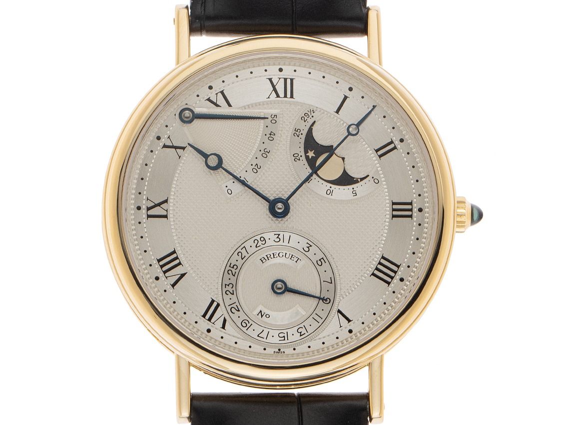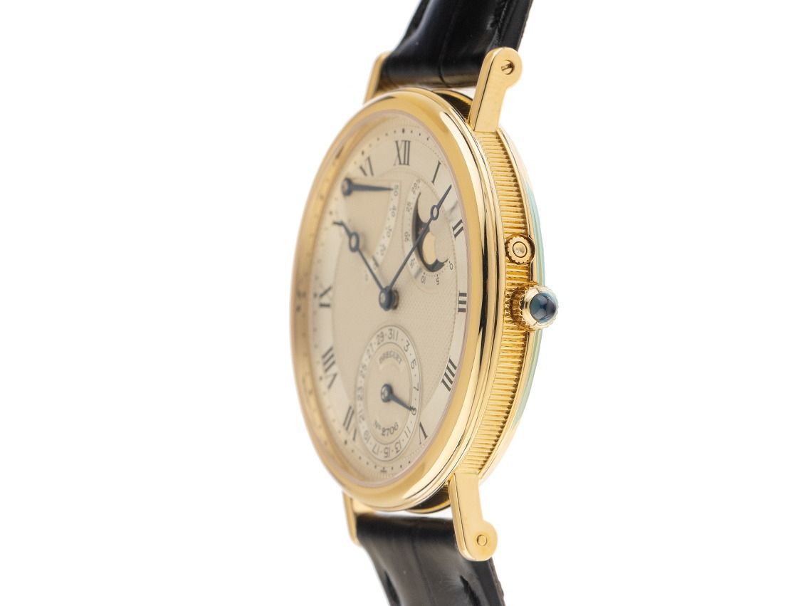 Breguet Classique 18kt Gelbgold Automatik Armband LederGehäuse 18kt Gelbgold poliert, Gehäusedurchmesser ohne Krone 36mm, Gehäusehöhe 7,6mm, Gehäuseflanken kanneliert. Breguet Armband Leder schwarz mit Ziernaht, Anstoßbreite 18mm, Stiftschließe 18kt Gelbgold. Zifferblatt silberfarben teilguillochiert mit schwarzen römischen Ziffern und gebläuten Zeigern. Uhrwerk Automatik, Breguet Manufakturkaliber 502 mit 37 Edelsteinen. Anzeige von Stunde und Minute über Zeiger aus der Mitte, Datumsanzeige über Zeiger bei 6 Uhr, Mondphasenanzeige zwischen 1 und 2 Uhr, Gangreserveanzeige zwischen 10 und 11 Uhr. Saphirglas kratzfest. Krone geriffelt mit Saphir Cabochon. Boden 18kt Gelbgold graviert. Gewicht der Uhr inklusive Armband 59g. Referenznummer: BA 3130, Gehäusenummer: 27XXX, ID: P183614000ST33781125H-21900, Artikelnummer: 10000054614. Original Breguet Holz Box und Garantie Papiere von November 1998 sowie Beschreibung, Stellstift, komplett Service von Breguet mit neuem Band und Revision von Februar 2026 sowie Watchregister Auszug von November 2025, The Watch Register Zertifikat / ohne Eintrag (Internationale Datenbank für verlorene oder gestohlene Uhren), Full Set. Superschnäppchen, Kapitalanlage mit Wertsteigerungspotential, seltenes Sammlerstück, fast nicht getragen. Wie Neu. Lieferzeit sofort.