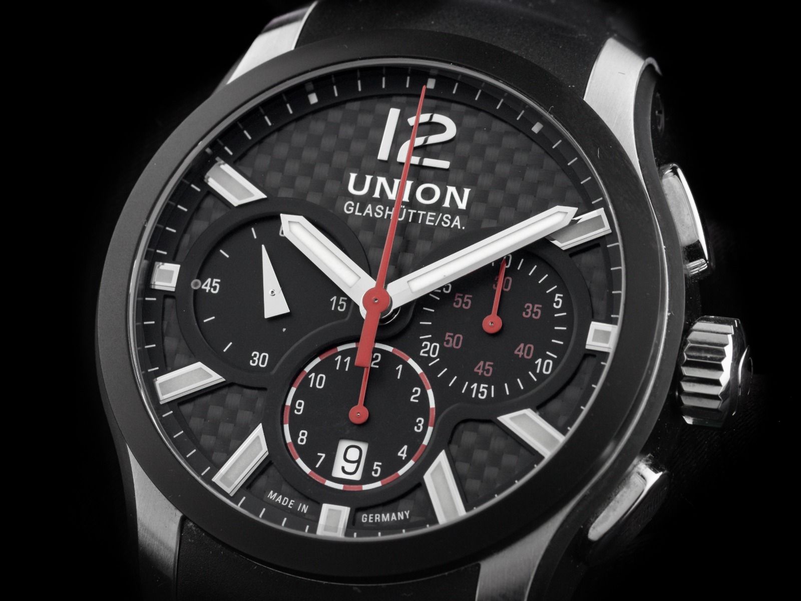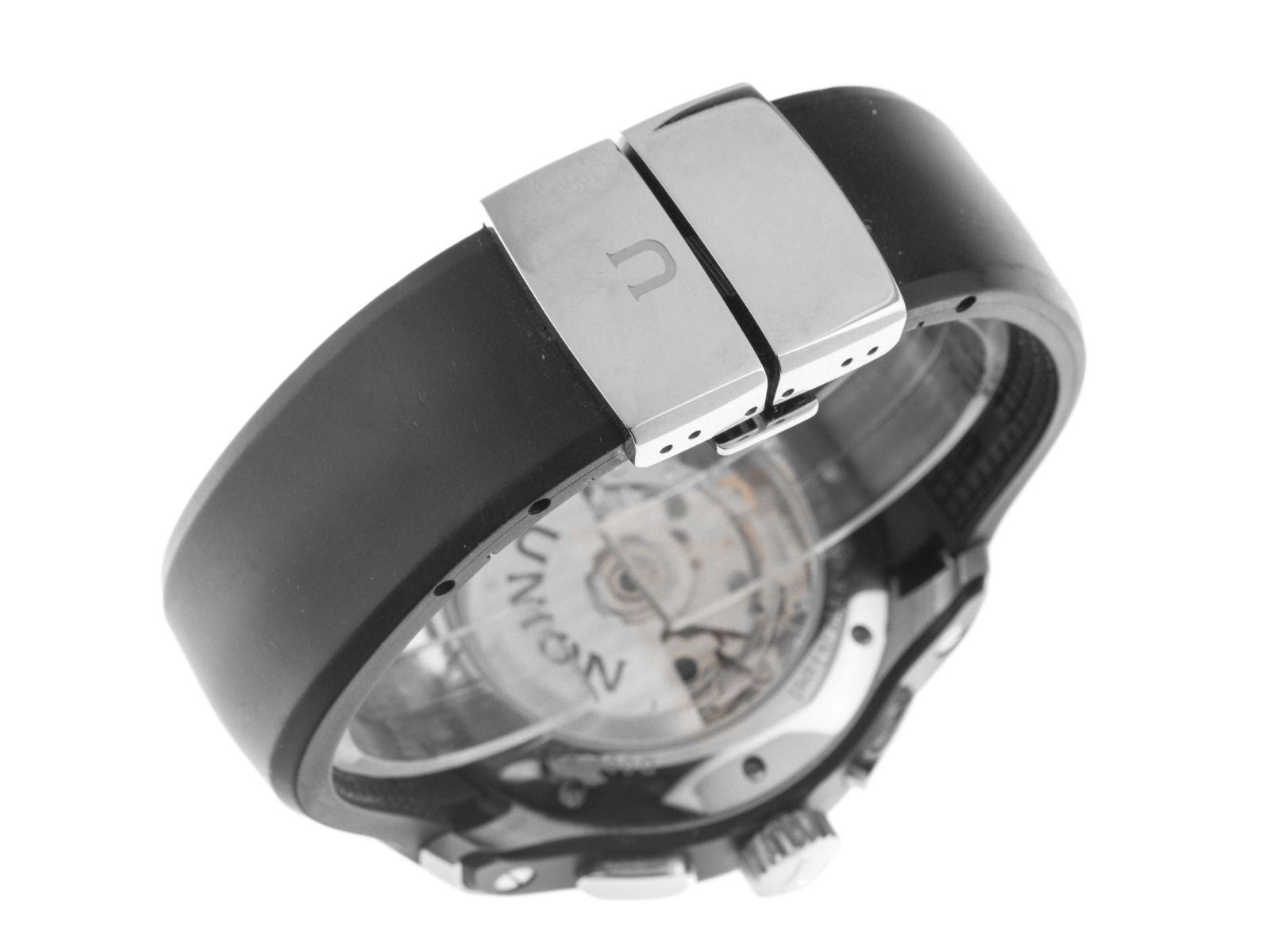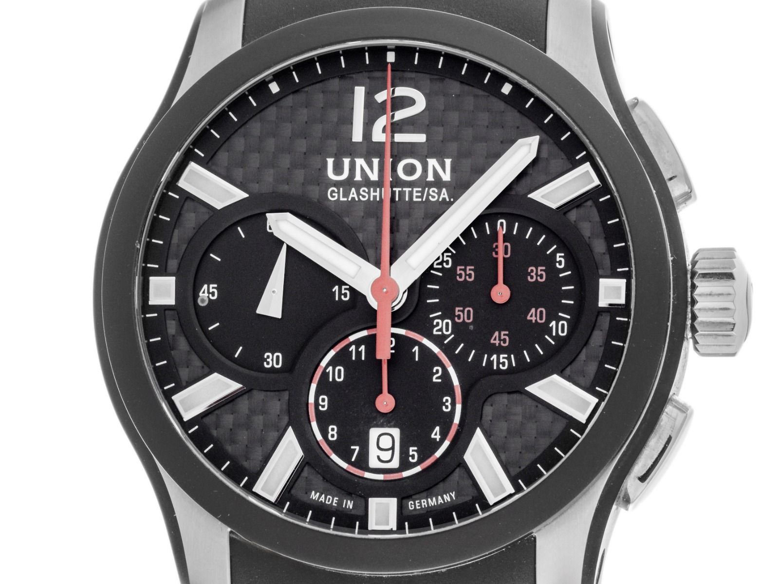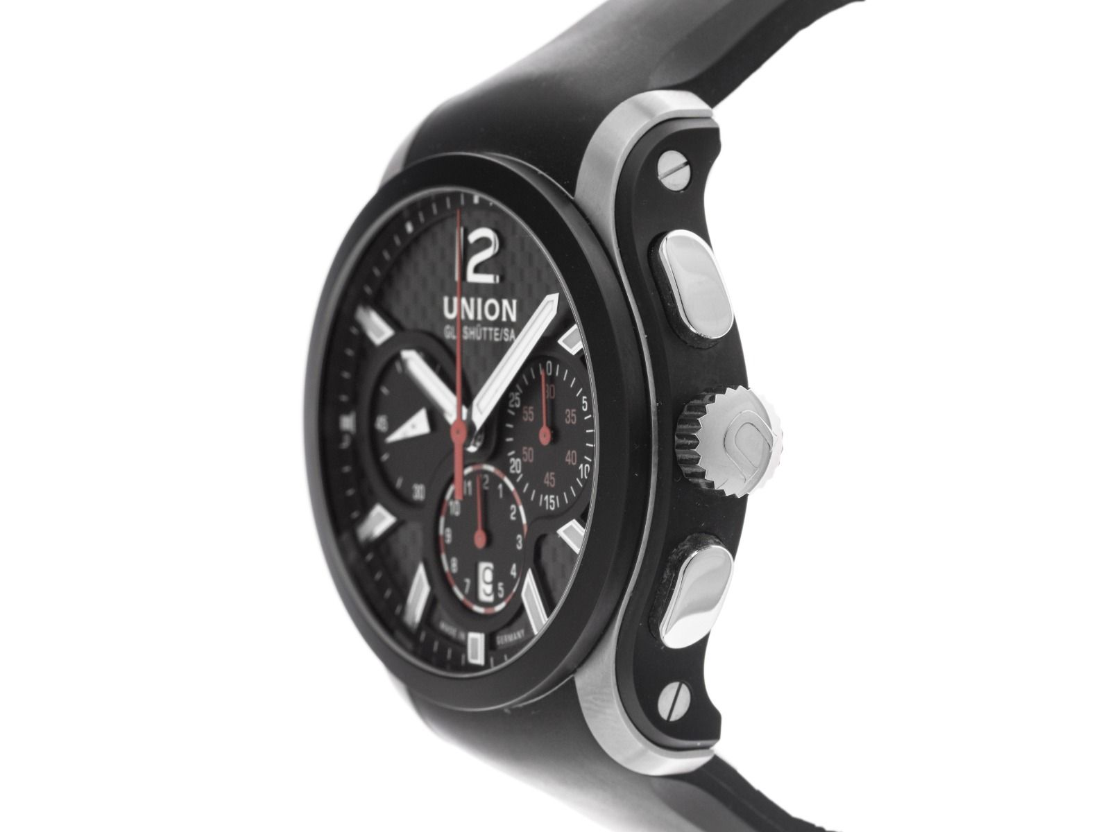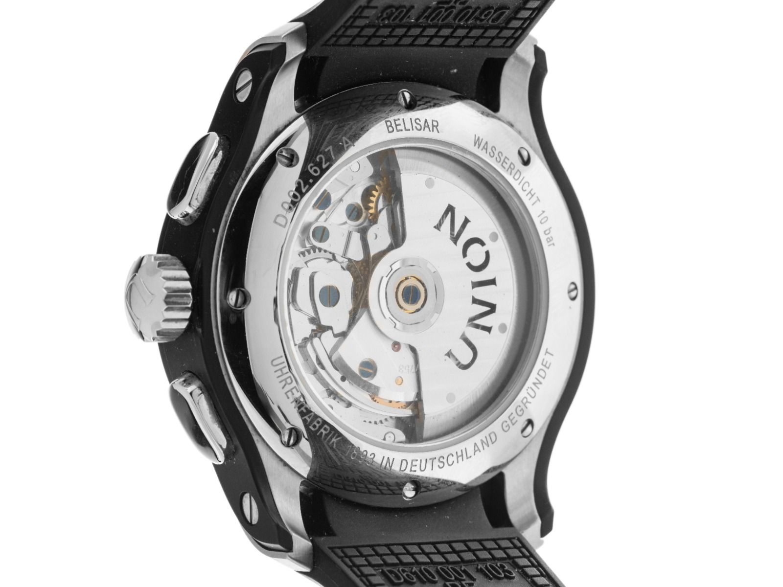 Caixa em aço inoxidável com revestimento PVD polido e acetinado, diâmetro da caixa sem coroa 43mm, altura da caixa 13,9mm. Bezel em aço inoxidável com revestimento PVD preto. Pulseira de borracha preta, largura da alça 22mm, fecho de segurança dobrável em aço inoxidável com logotipo do fabricante. Mostrador preto com índices em aço inoxidável aplicados e ponteiros em aço inoxidável. Movimento automático, cronógrafo, calibre de manufatura Union Glashütte U 7753 com 27 pedras preciosas. Exibição de horas e minutos através de ponteiros centrais, pequeno segundo com parada de segundos para ajuste preciso da hora às 9 horas, exibição de data com ajuste rápido às 6 horas, ajustável através de botão às 10 horas. Vidro de safira resistente a riscos. Coroa com logotipo do fabricante. Fundo em aço inoxidável, 8 vezes rosqueado e gravado com janela de vidro de safira. Peso do relógio incluindo a pulseira 138g. Número de referência: D002.627.27.207.01, número da caixa: 024XXX, ID: P258413500226H-3400. Número do artigo: 10000084930. Com controle de marcha e completa revisão externa de fevereiro de 2026. Caixa original Union Glashütte com embalagem e documentos de garantia de novembro de 2018, além de descrição, nota fiscal de compra e extrato do Watchregister de fevereiro de 2026, Certificado do Watch Register / sem registro (Banco de dados internacional para relógios perdidos ou roubados), Full Set. Como Novo. Prazo de entrega imediato.