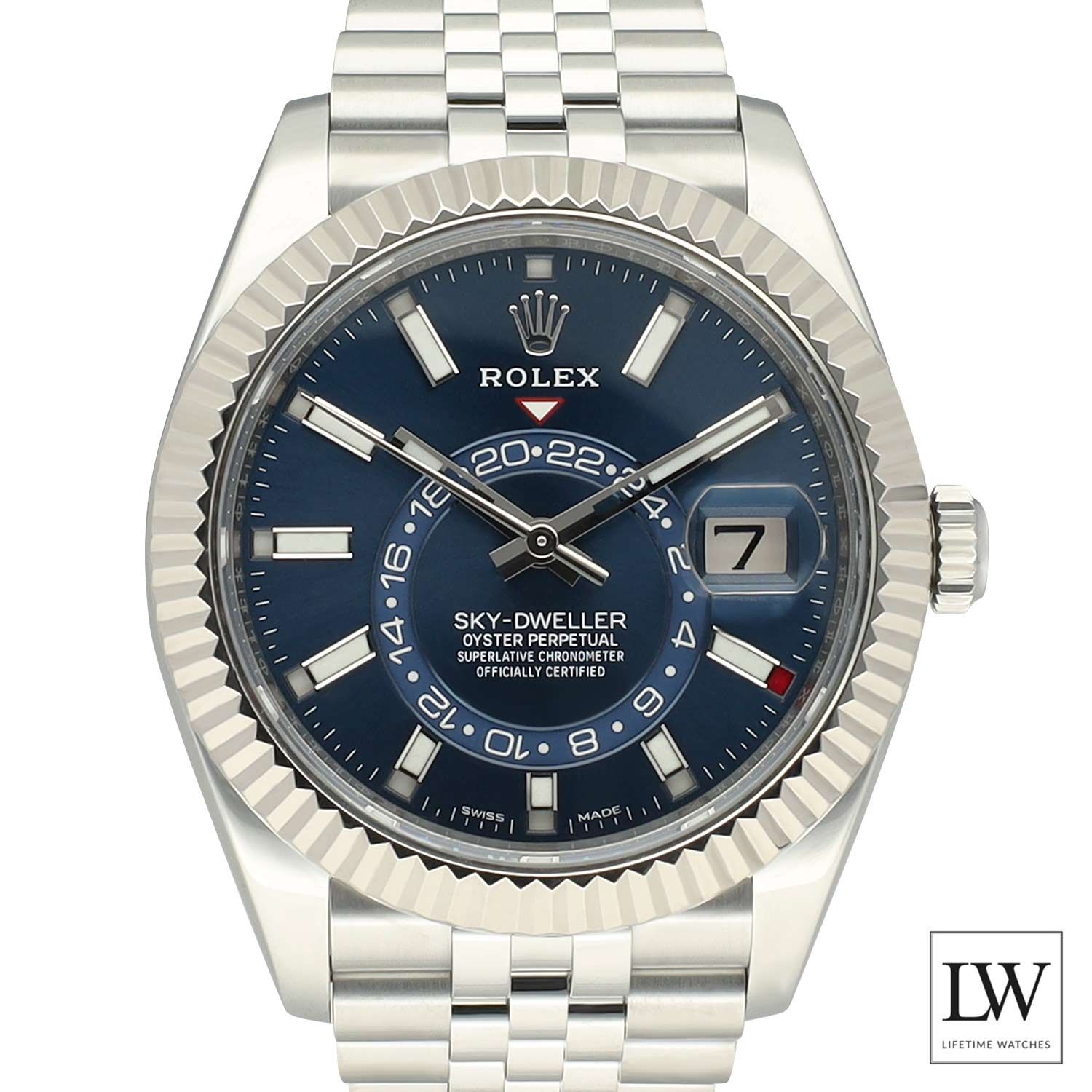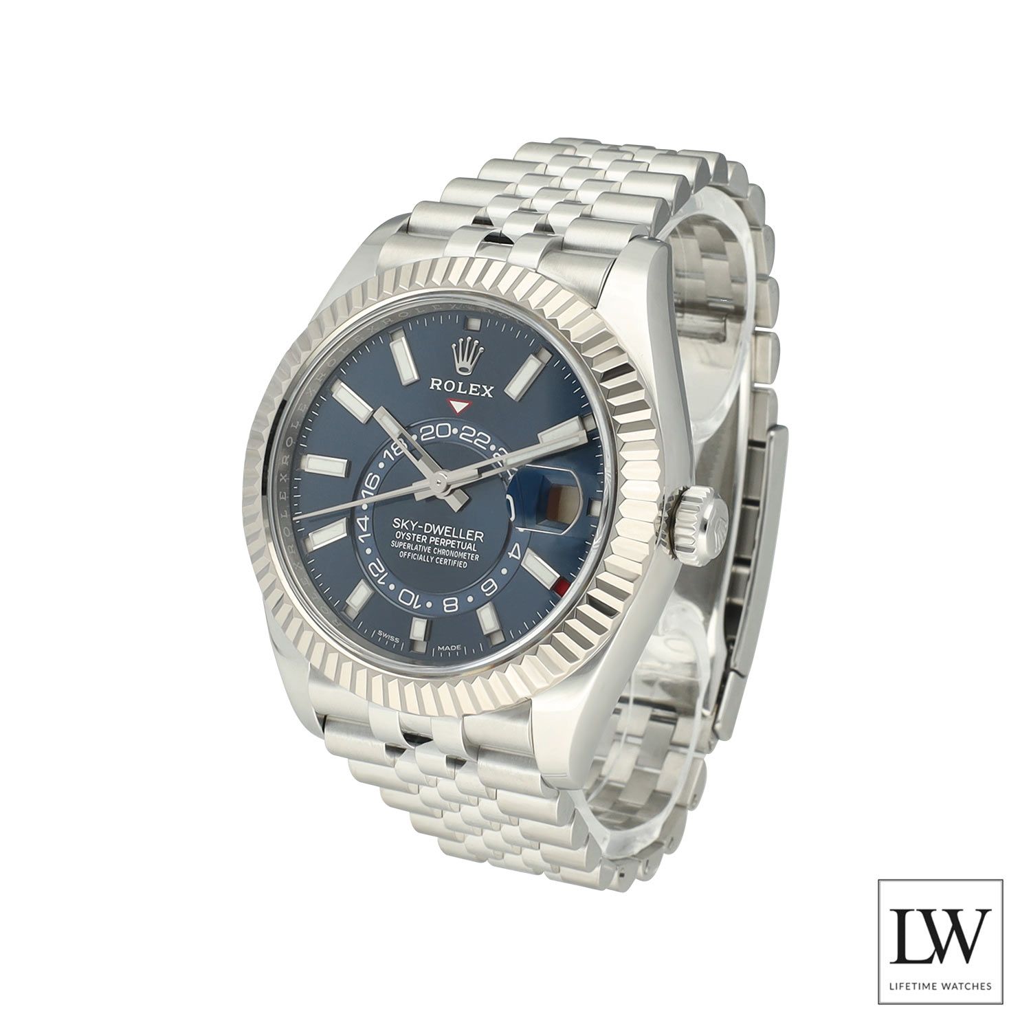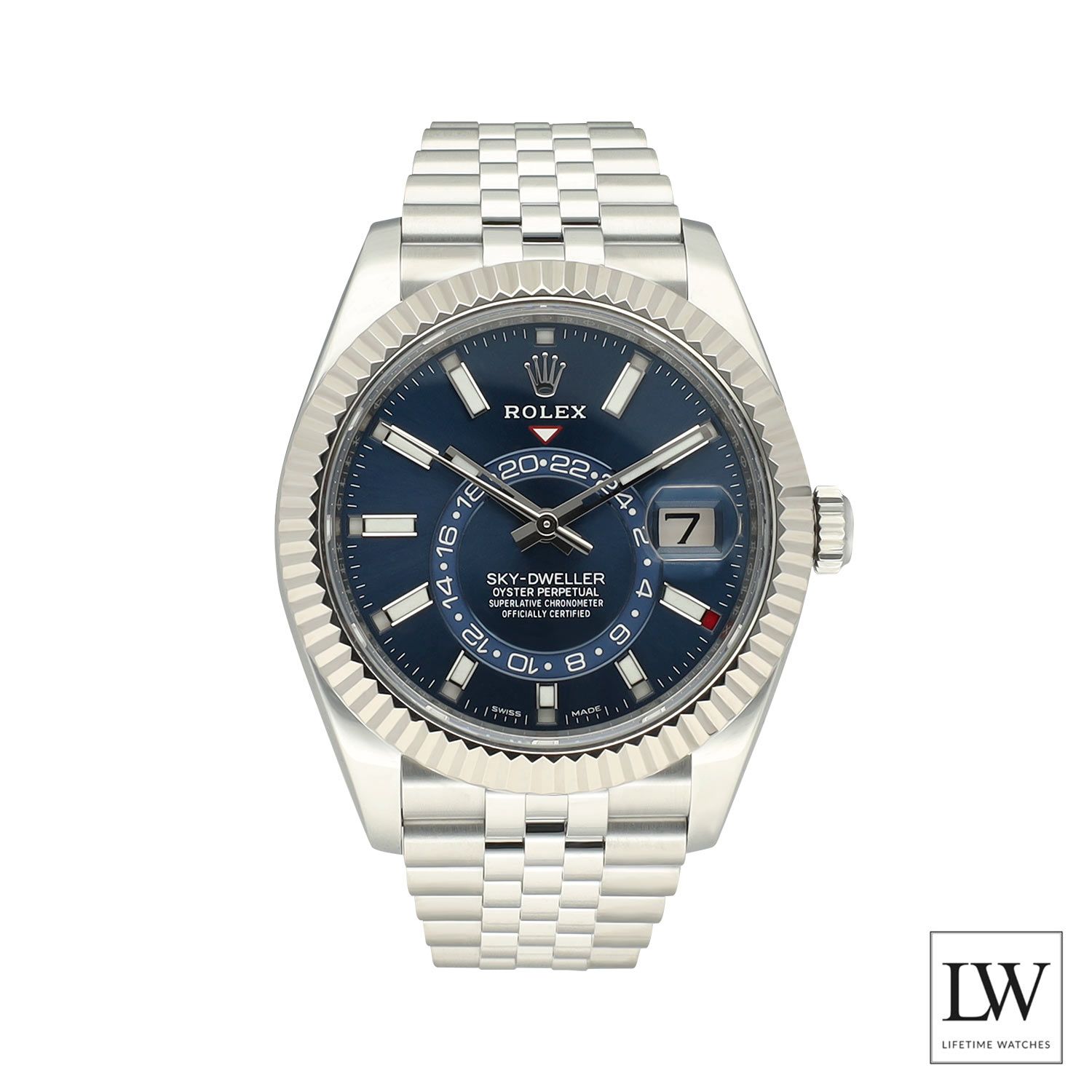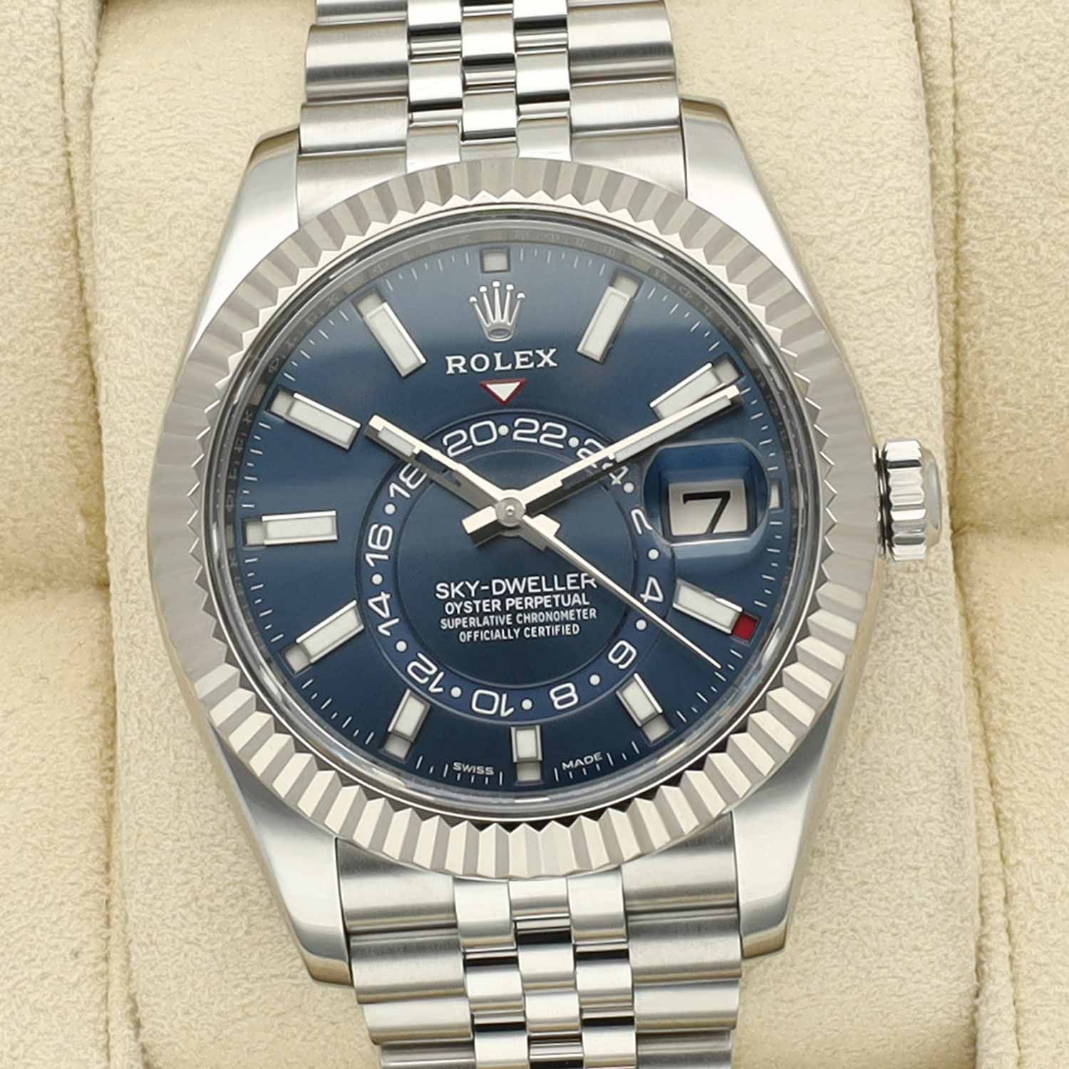 The Rolex Sky-Dweller ref. 326934 is one of the most sophisticated models within the Rolex collection, designed for global travelers who value both functionality and elegance. This configuration features the highly desirable blue dial, creating a striking contrast with the Oystersteel case and the 18-carat white gold fluted bezel. Combined with the Jubilee bracelet, the watch offers a refined yet sporty appearance that remains instantly recognizable.