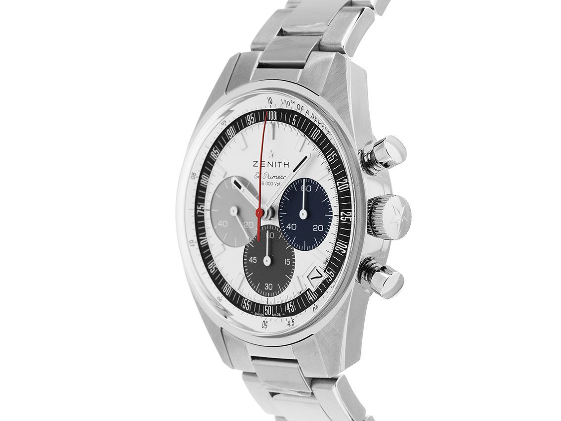 Caixa em aço inoxidável polido e acetinado, diâmetro da caixa sem coroa 38mm, altura da caixa 13,0mm. Bezel em aço inoxidável liso e polido com escala de taquímetro sob vidro. Pulseira em aço inoxidável polido e acetinado, fecho de segurança dobrável em aço inoxidável com logotipo do fabricante. Mostrador branco com índices luminosos em aço inoxidável aplicados e ponteiros luminosos brancos. Movimento automático, cronógrafo, calibre El Primero 3600 da manufatura Zenith com 35 pedras preciosas, reserva de marcha de aproximadamente 60 horas. Exibição de horas e minutos através de ponteiros centrais, pequeno segundo com parada de segundos para ajuste preciso da hora às 9 horas, exibição de data com ajuste rápido entre 4 e 5 horas. Vidro de safira resistente a riscos e curvado. Coroa estriada com logotipo do fabricante. Fundo em aço inoxidável rosqueado e gravado com janela de vidro de safira. Peso do relógio incluindo a pulseira 131g, comprimento da pulseira incluindo a caixa 200mm. À prova d'água até 5 ATM. Número de referência: 03.3200.3600/69.M3200, ID: ST1160141280326H-10800, número do artigo: 10000085013. Caixa original Zenith com embalagem e documentos de garantia de janeiro de 2026, conjunto completo. Não usado. Prazo de entrega imediato.