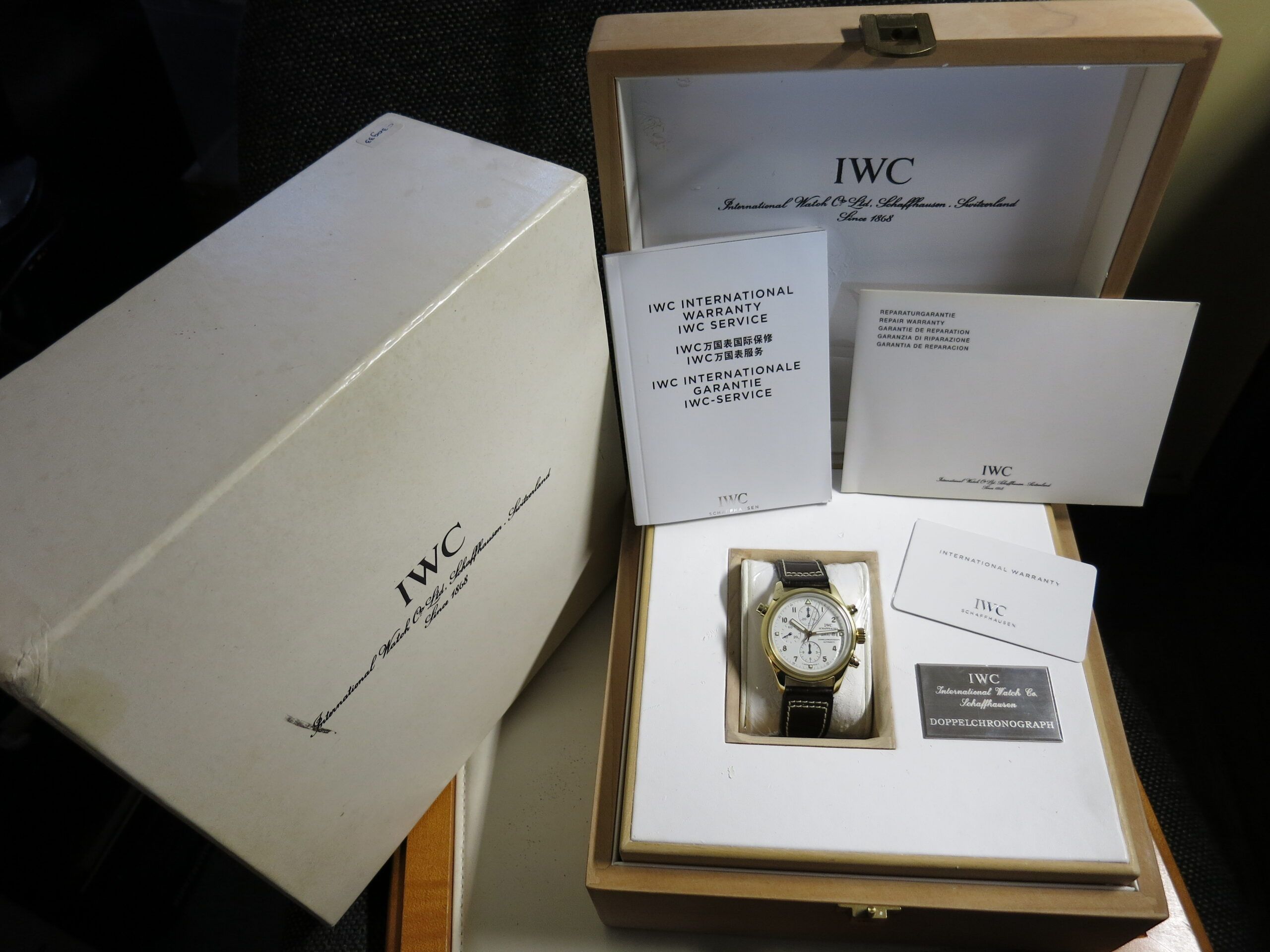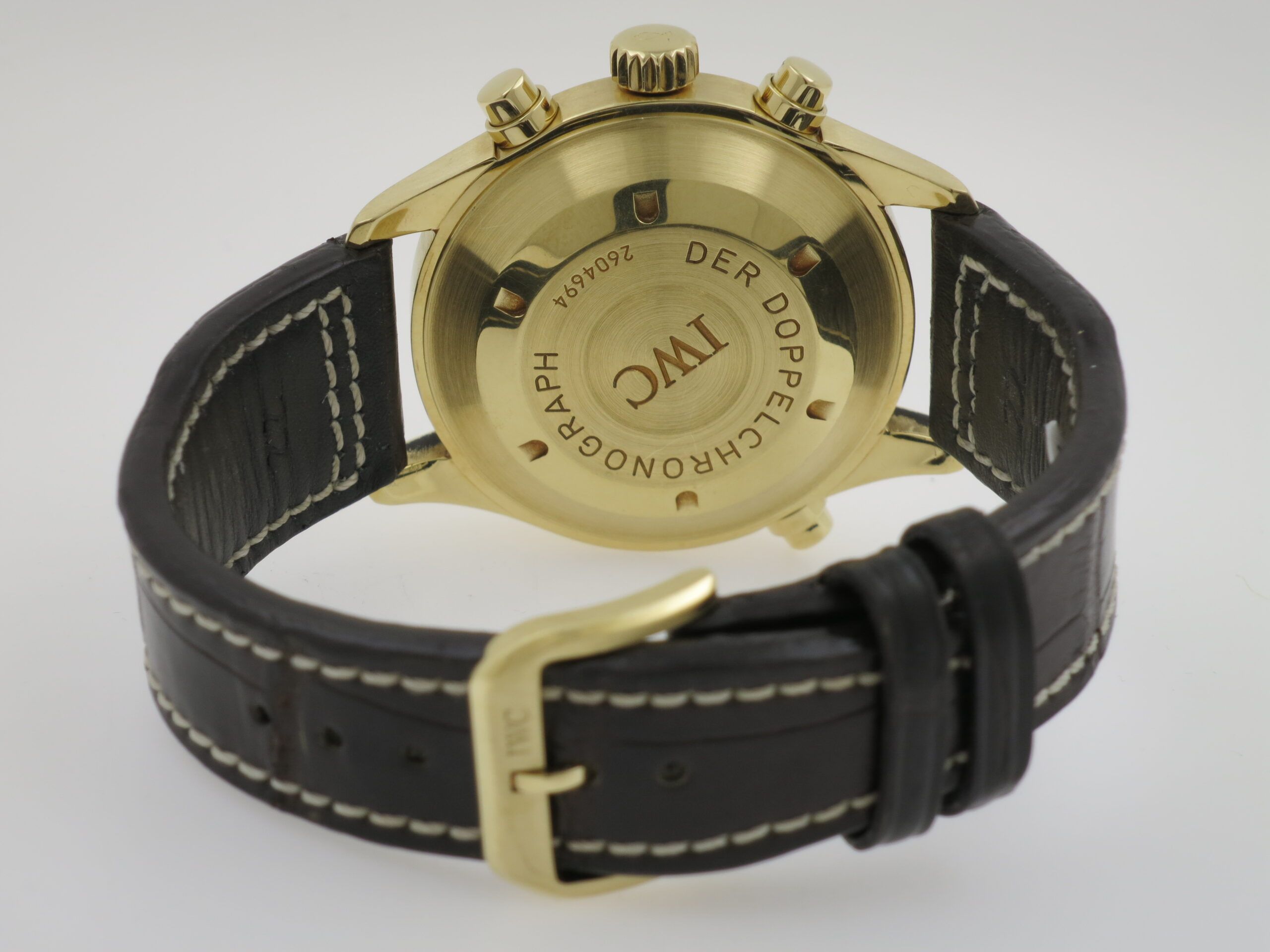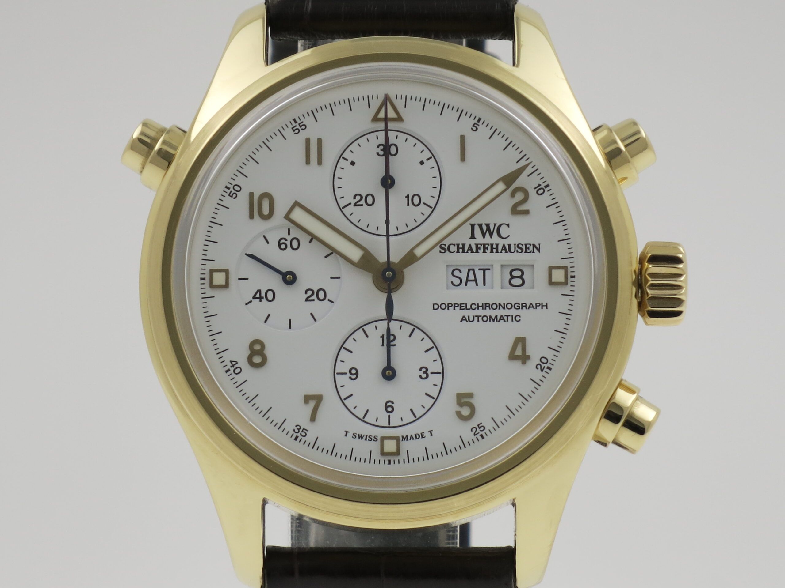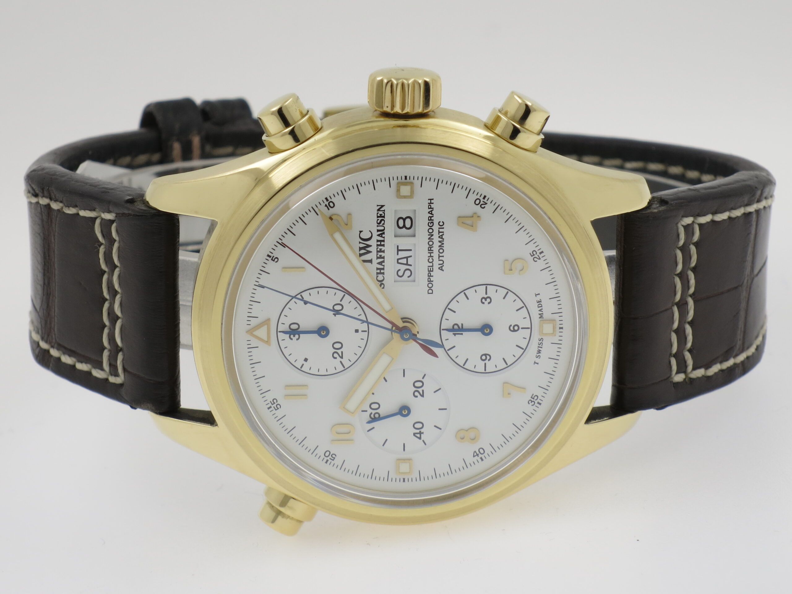 IWC Pilot Double Chronograph "Doppelchronograph Pilot" 18K golden 42mm. case. Rattrapante movement. Beautiful white dial in a 42 mm yellow gold case with yellow gold bezel. Shipping immediately upon receipt of payment. Our photos are NOT edited! What you see is what you get. Shipped registered and insured with Fedex Priority.