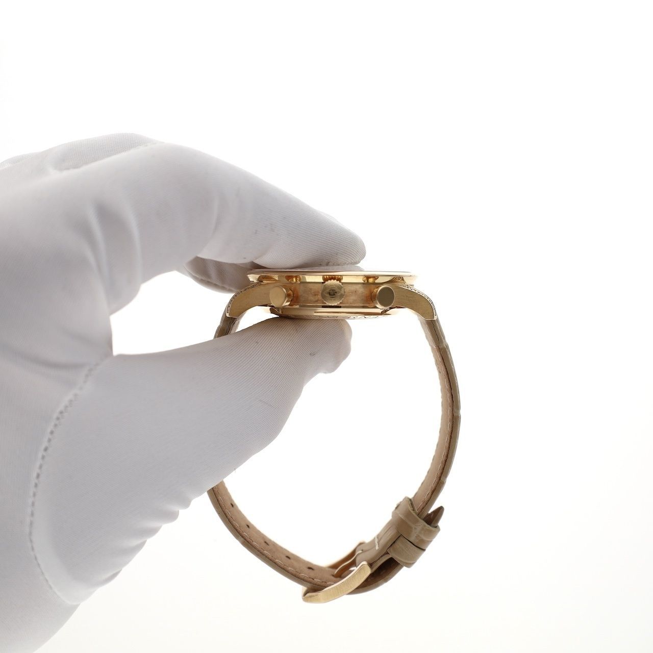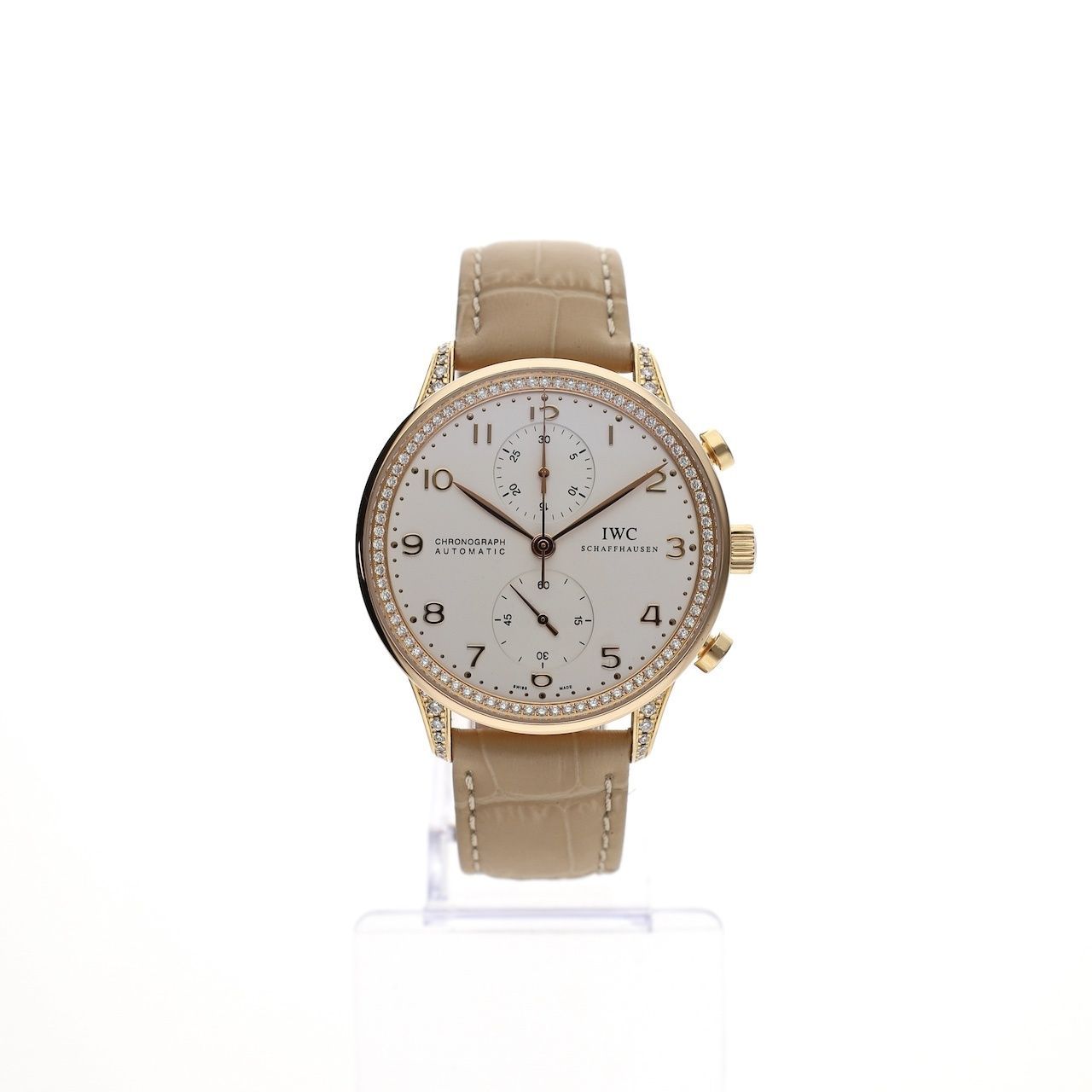 What a magnificent jewel! This exclusive IWC Portuguese chronograph with reference number IW371486. A very high-quality and stylish timepiece from the world-famous IWC, crafted in 18k rose gold and set with diamonds (original, factory-set). With a diameter of 41mm, this stylish men's watch boasts a particularly chic and dressy appearance in a rare edition. This model features a beautifully detailed cream/champagne-colored dial with applied gold indices, exquisitely finished and typical of IWC. The sapphire crystal is double-coated with anti-reflective coating, as only IWC can achieve. This watch is in excellent condition. The case houses a high-quality, modified Swiss automatic movement, fully upgraded by IWC and bearing the caliber 79350. The movement, like the watch itself, is in excellent condition. It winds smoothly, all functions work flawlessly, and the watch runs extremely accurately. We measure an amplitude of approximately 280 degrees and a maximum deviation of 2 seconds per 24 hours. We have fitted the watch with a new leather strap and offer a high-quality (Moratello/Hirsch) strap of your choice! We can fit other straps from stock; we have dozens to choose from. The strap is fitted with an (original) 18k rose gold IWC buckle. This watch comes with a luxury in-house box and an in-house warranty report with a 1-year warranty.