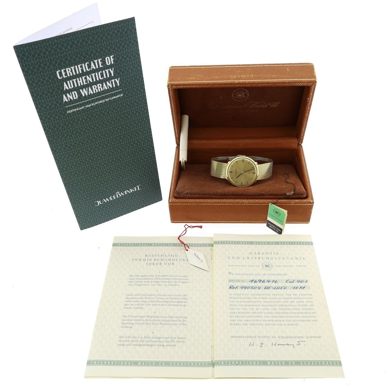 This is awesome! An extremely rare piece of Swiss watchmaking history, this 1964 IWC "De Luxe" is crafted in 18-karat yellow gold. A masterpiece of understated luxury. A true gem for the collector or lover of classic elegance. With its refined, minimalist dial, slim case, and beautiful Milanese bracelet, this watch epitomizes 1960s style. The 18k gold case exudes warmth and class, while the hand-wound IWC caliber guarantees Swiss precision. This isn't a watch that screams for attention; it whispers class. At 35mm, it's a classic men's watch and a true dress watch. What makes this IWC De Luxe truly special is the rare full set it comes in. Includes the original vintage IWC box, accompanying warranty papers dated November 2, 1964, and two original numbered hangtags. A unique find for collectors; complete sets from this period are exceptionally rare. The watch is in excellent vintage condition and has been fully inspected by our watch specialists. Everything about this timepiece exudes originality and craftsmanship. A quality heirloom that will last for generations. The 18k gold Milanese bracelet is a true work of art and unique in its kind thanks to its integrated folding clasp with lock and infinitely adjustable length between approximately 17 and 19.5 cm.