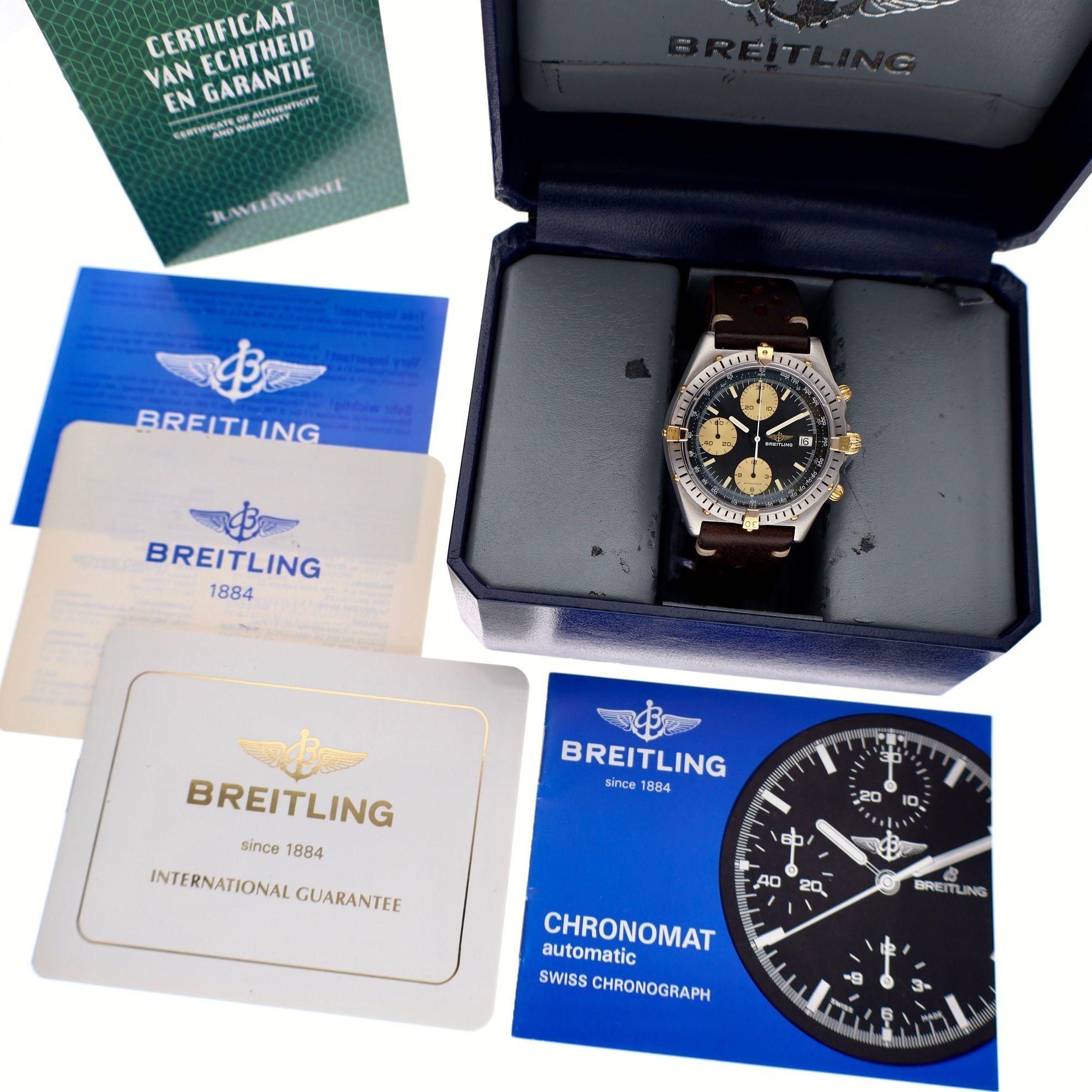 The Breitling Chronomat 81.950 is one of the models that has played a central role in the modern history of Breitling. The Chronomat was reintroduced in the 1980s and quickly grew to become one of the brand's most important pilot's watches. This early vintage version from the 1980s is particularly interesting for collectors. The Chronomat was originally developed in collaboration with the Italian aerobatic team Frecce Tricolori, which gave the model its strong aviation DNA. The characteristic rotating bezel with 18k rider-tabs and the robust chronograph configuration make the Chronomat a true 'tool watch' for pilots. The case has a diameter of 40mm, a classic size that is still very wearable today. This piece is in very good vintage condition, with a nice appearance that fits an authentic watch from this period. Moreover, we see a completely matte case, typical for very early editions of the Chronomat. Inside, the reliable (non-signed) Breitling Caliber operates, based on the legendary Valjoux 7750 automatic chronograph movement. Non-signed, because these early editions did not yet have a signed rotor. This movement is known for its robustness, precision, and proven reliability. The movement has been reviewed and tested and operates excellently and accurately. A significant bonus is that this watch comes as a rare full set, consisting of; Original Breitling box, Breitling guarantee papers, Breitling booklet, Extra strap with Breitling spring ring clasp, Our guarantee report, and 1 year warranty. An early and characterful example of the iconic Chronomat, a model that has become one of the most important pillars of Breitling. Thanks to the complete set and the nice condition, this is an interesting collector's item for enthusiasts of vintage pilot's chronographs.