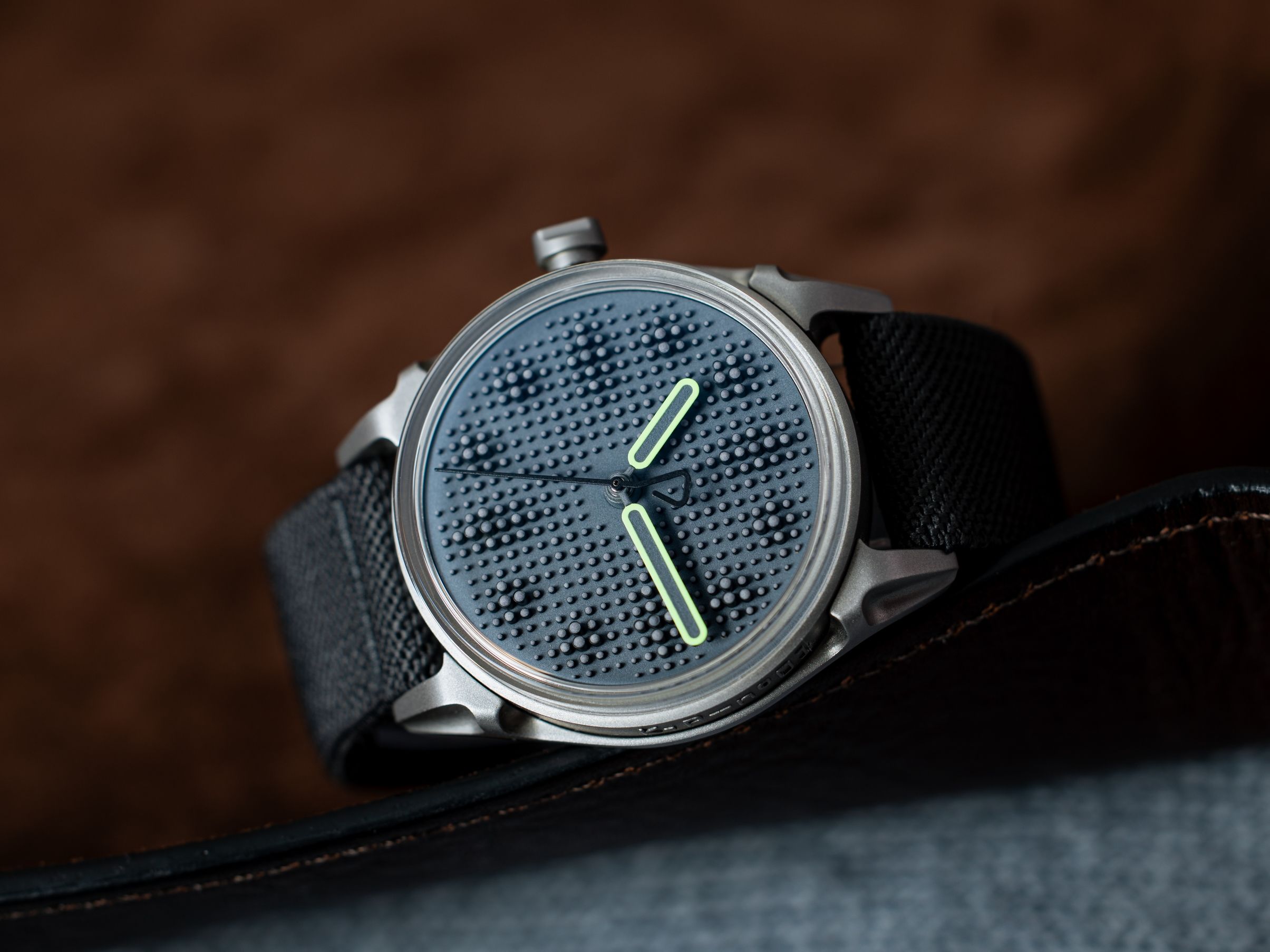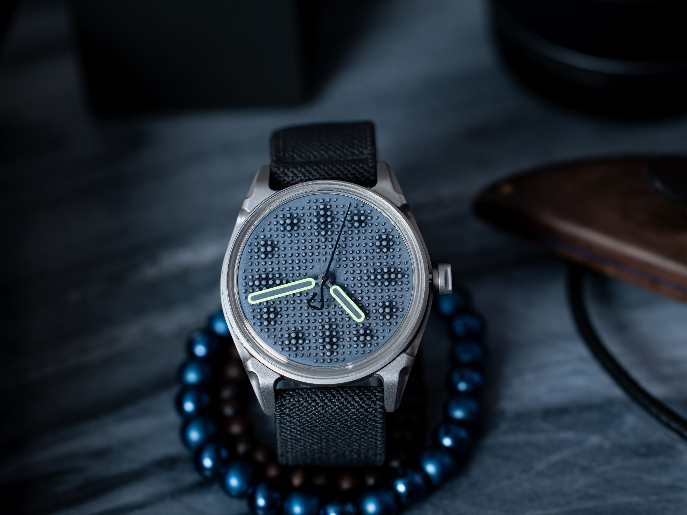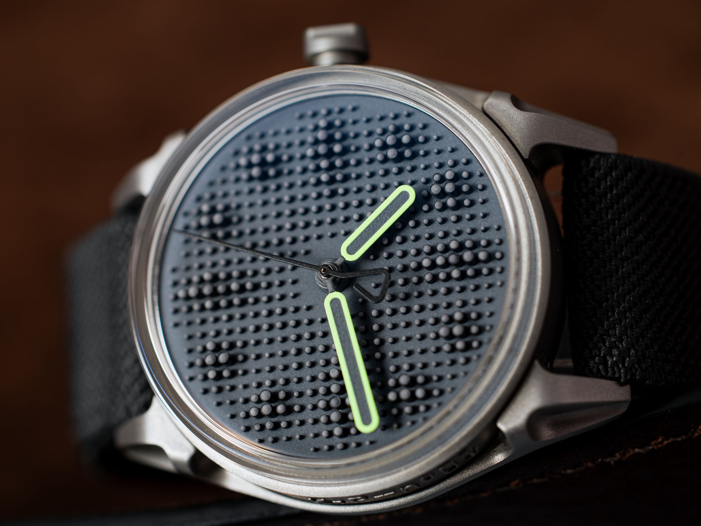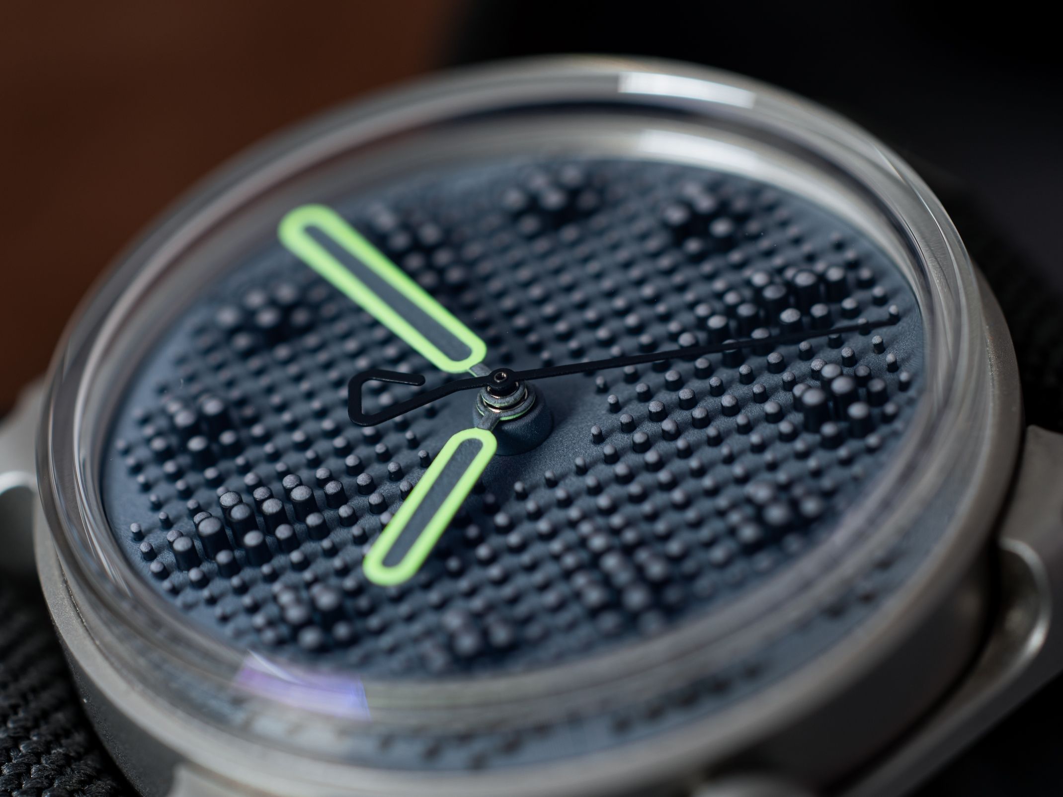 A versão mais brutal do Project 01. Depois de três variantes iniciais com mostradores pretos, diferentes ponteiros de segundos e diferentes emissões de luminescência, é hora de acentos mais profundos e escuros. A variante E2 é caracterizada por um contraste sutil, mas marcante, entre o mostrador cinza com emissão azul de Super-LumiNova e os pinos pretos.