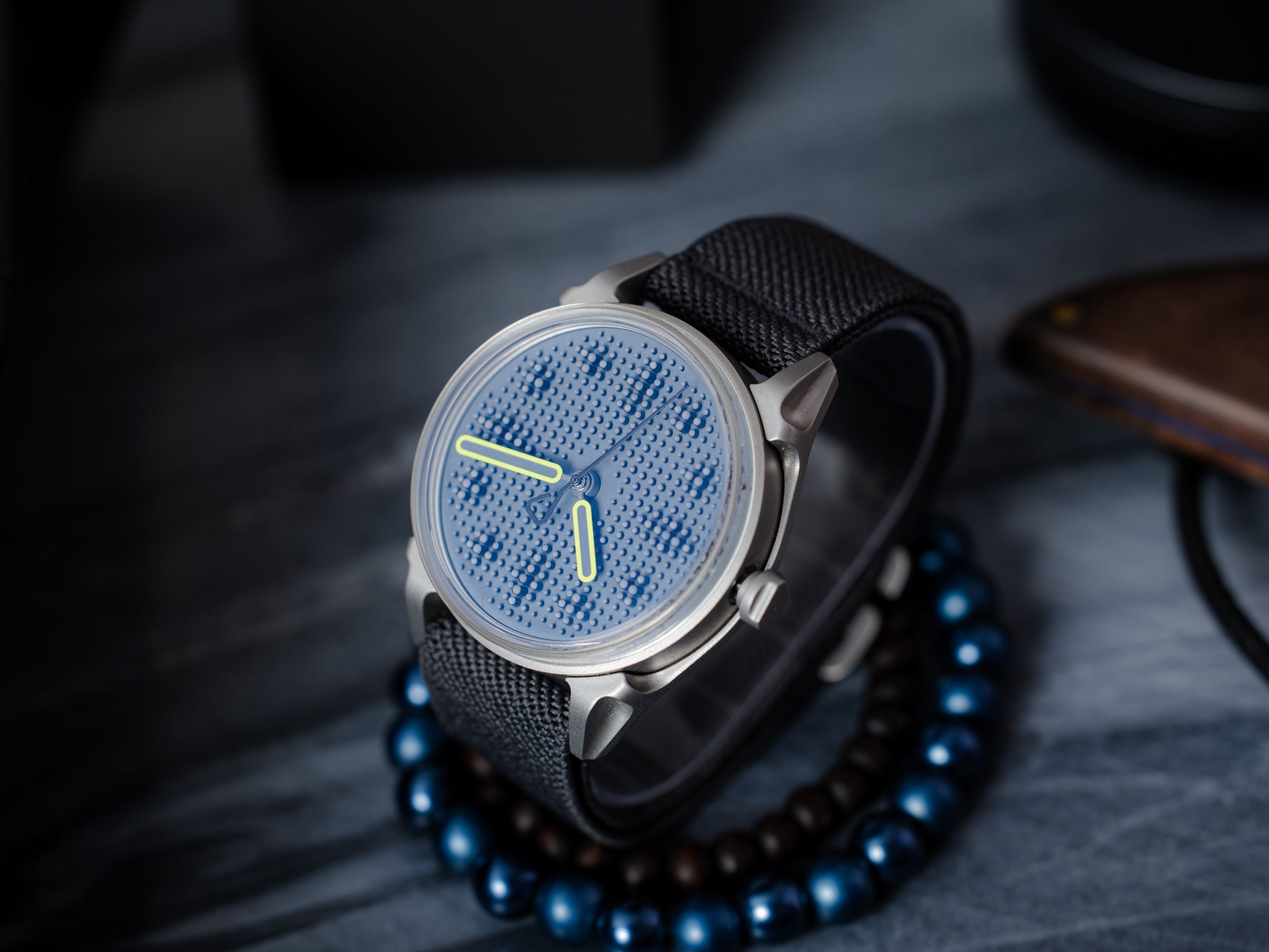 The most brutal version of Project 01. After three initial variants with black dials, different seconds hands, and different luminescence emissions, it's time for deeper, darker accents. The E2 variant is characterized by a subtle yet striking contrast between the gray dial with blue Super-LumiNova emission and the black pins.The E2 version features fluorescent yellow hour and minute hands filled with the same luminescence as the dial, and a black seconds hand. The E1 and E2 variants are limited to 499 pieces, making them highly attractive and collectible for lovers of modern, bold design.