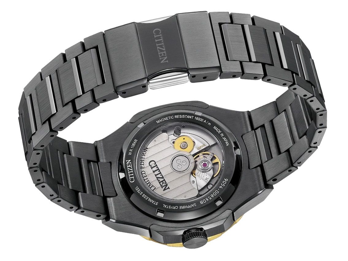 Caixa em aço inoxidável polido e acetinado, diâmetro da caixa sem coroa 42mm, altura da caixa 13,0mm. Luneta em aço inoxidável revestida a ouro amarelo com inserto branco/preto e escala de 24 horas, giratória em ambos os lados. Pulseira em aço inoxidável polido e acetinado, fecho de segurança dobrável em aço inoxidável com logotipo do fabricante. Mostrador em prata/preto com efeito degradê, índices aplicados em ouro amarelo e ponteiros luminosos em ouro amarelo. Movimento automático, calibre 9054 com 24 rubis, reserva de marcha de aproximadamente 50 horas. Exibição de horas, minutos e segundos através de ponteiros centrais com parada de segundos para ajuste preciso da hora, exibição de data com ajuste rápido às 3 horas, segundo fuso horário (GMT) legível através da luneta, ajustável por ponteiro com ponta em ouro amarelo a partir do centro. Vidro de safira resistente a riscos e antirreflexo. Coroa estriada. Fundo em aço inoxidável rosqueado e gravado com janela de vidro de safira. Peso do relógio incluindo a pulseira 184g, comprimento da pulseira incluindo a caixa 210mm. À prova d'água até 10 ATM. Número de referência: NB6035-55H, ID: ST511115020326RE-1295, número do artigo: 10000085164. Caixa original Citizen com embalagem e documentos de garantia, conjunto completo. Novo. Limitado a 1600 exemplares. Prazo de entrega imediato.