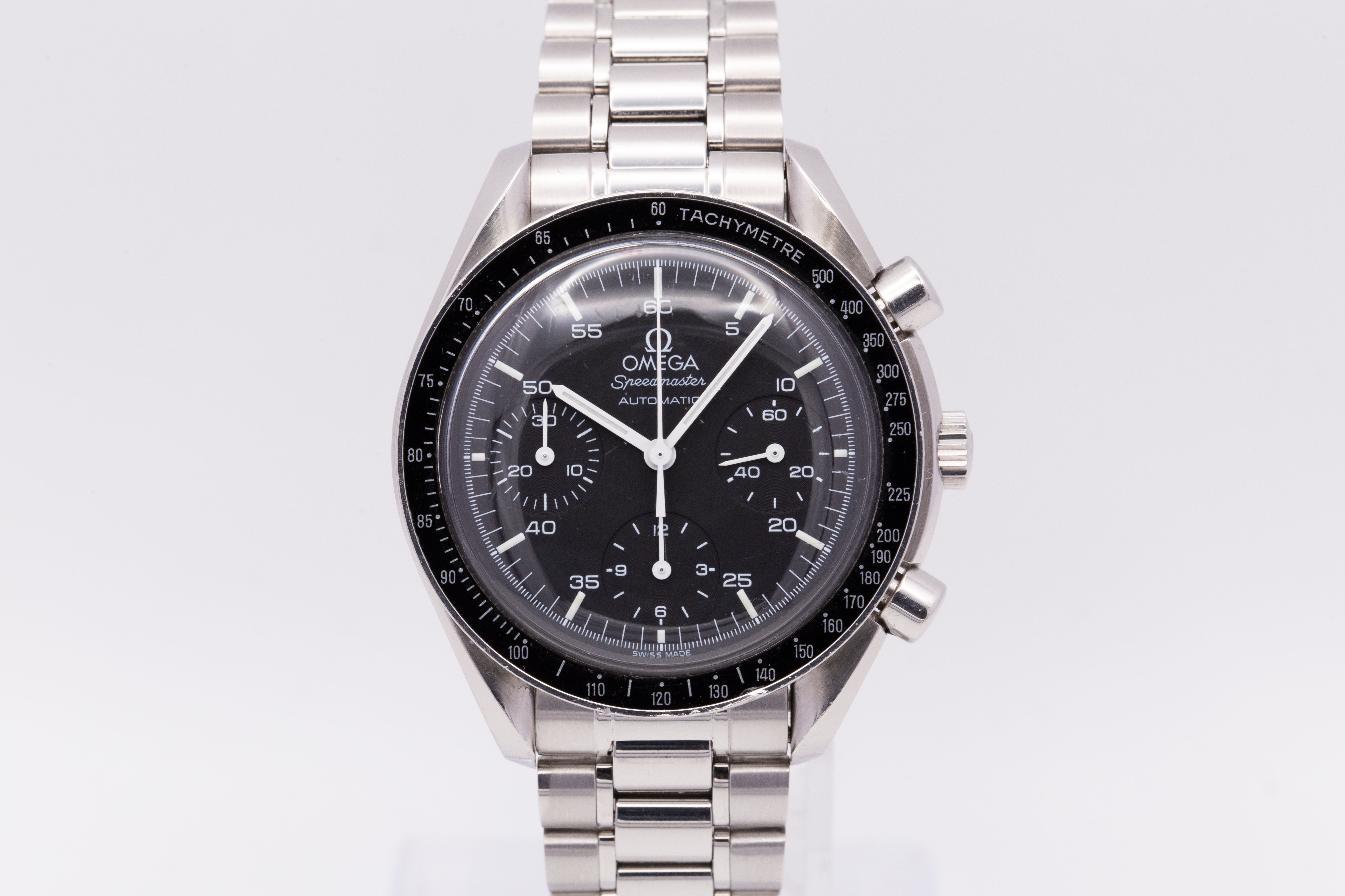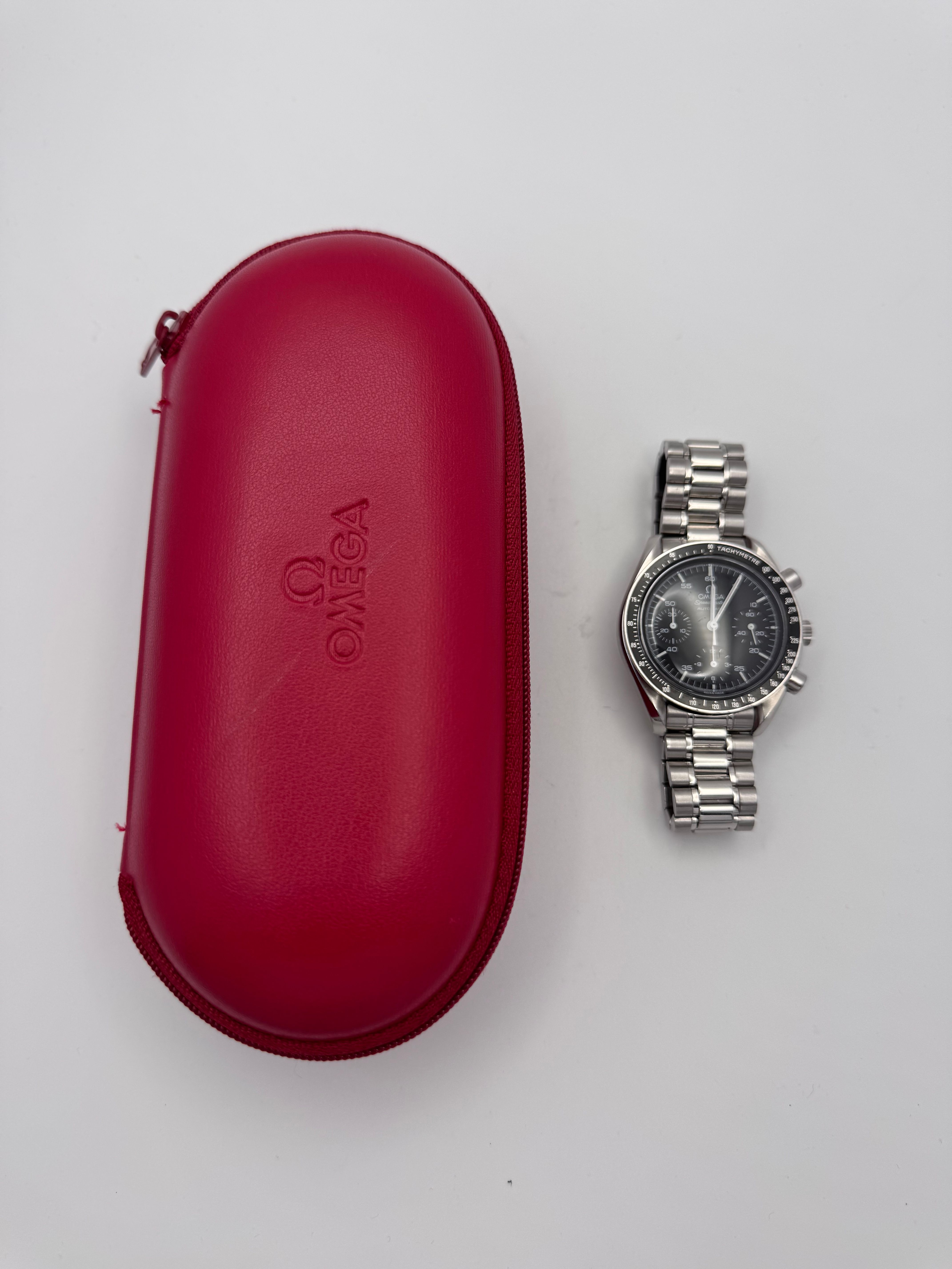 Zum Verkauf steht eine Omega Speedmaster Reduced Ref. 3510.50 im guten, getragenen Zustand inklusive Omega-Etui.Die Speedmaster Reduced greift das ikonische Design der legendären Speedmaster Moonwatch mit schwarzem Zifferblatt auf, bietet mit einem Gehäusedurchmesser von 39 mm jedoch eine deutlich alltagstauglichere Größe. Dadurch eignet sie sich besonders für schmale bis mittlere Handgelenke, ohne auf die klassische Speedmaster-Ästhetik zu verzichten.